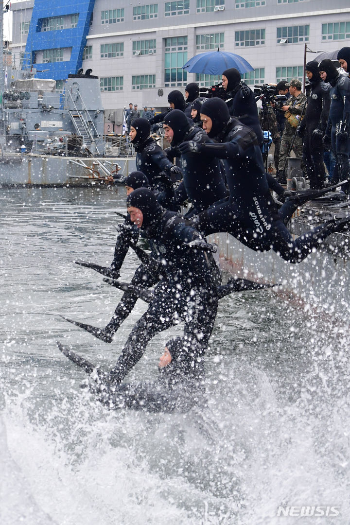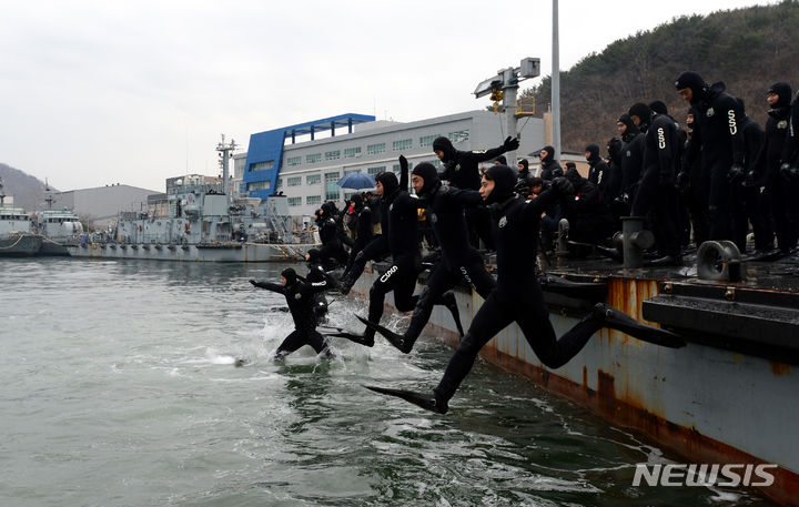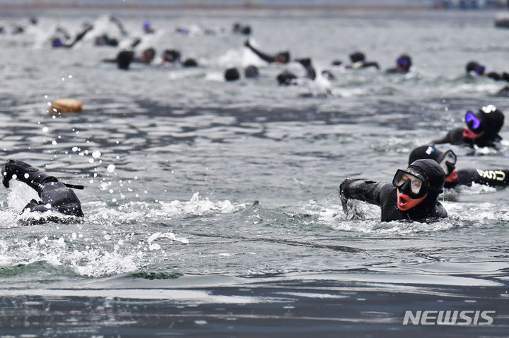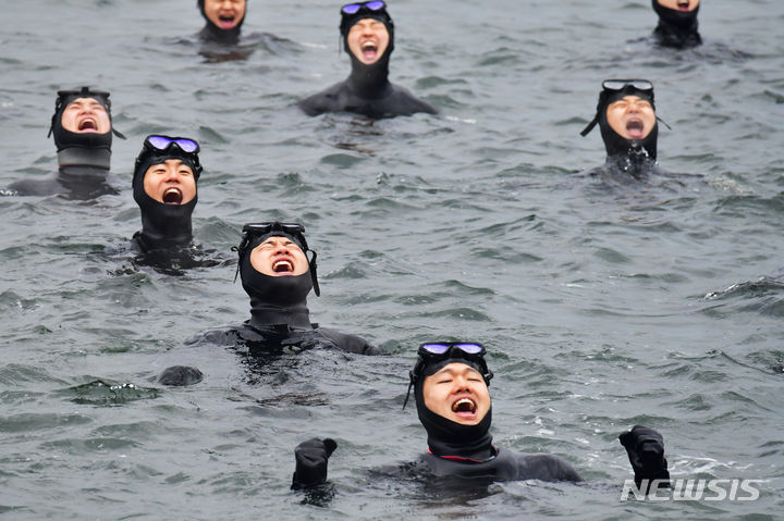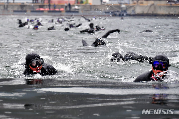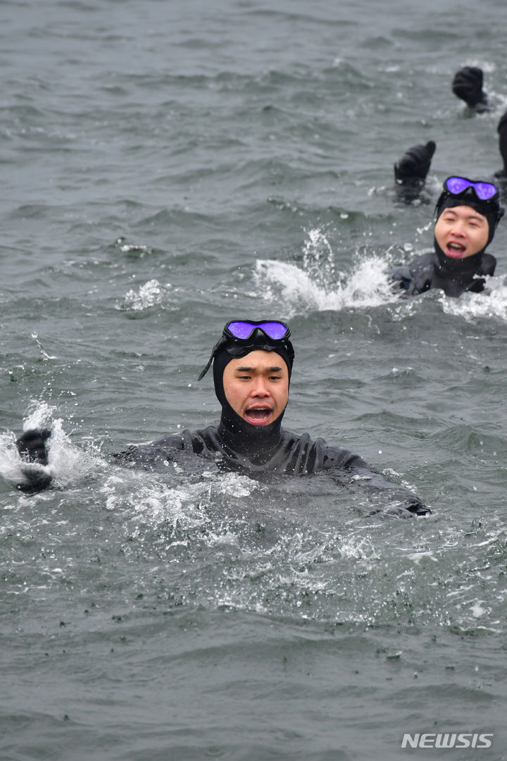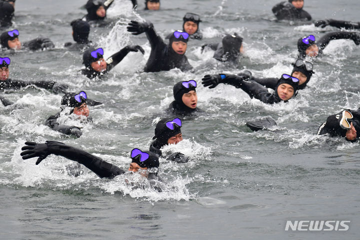 慶尚南道の鎮海軍港一帯で繰り広げられた韓国海軍の深海潜水士極寒期訓練。18日、同訓練に参加した海軍特殊戦団海難救助戦隊の隊員らが、フィン・マスク着用集団水泳を実施しているところ。