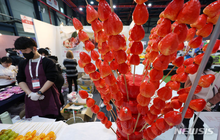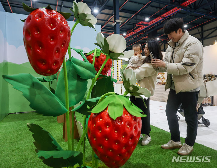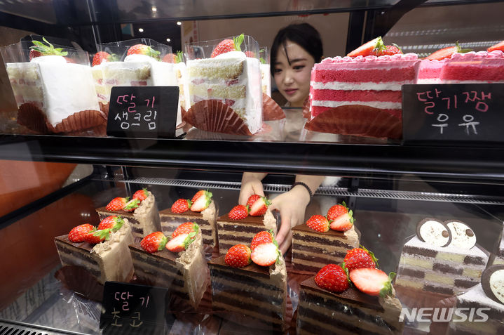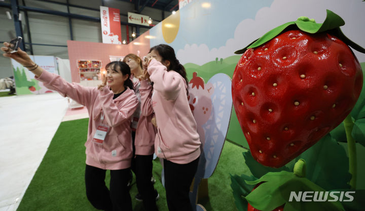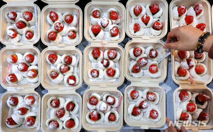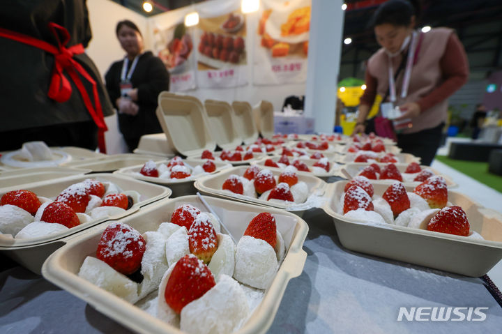 19日午後、ソウル市江南区のSETECで開かれた「2024ソウル・ストロベリー・フェスタ」で、ある参加企業の関係者がイチゴのデザートを整理しているところ。