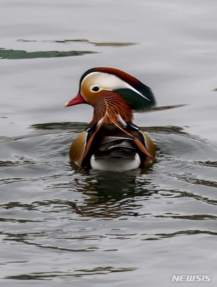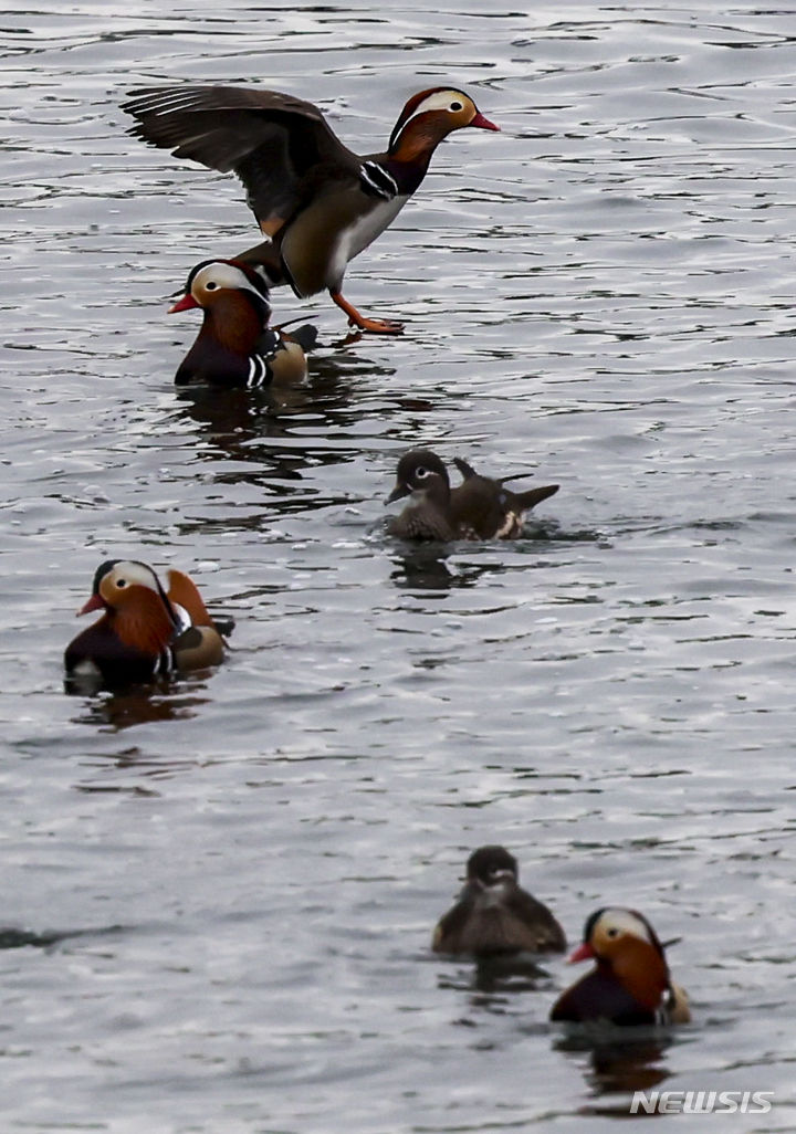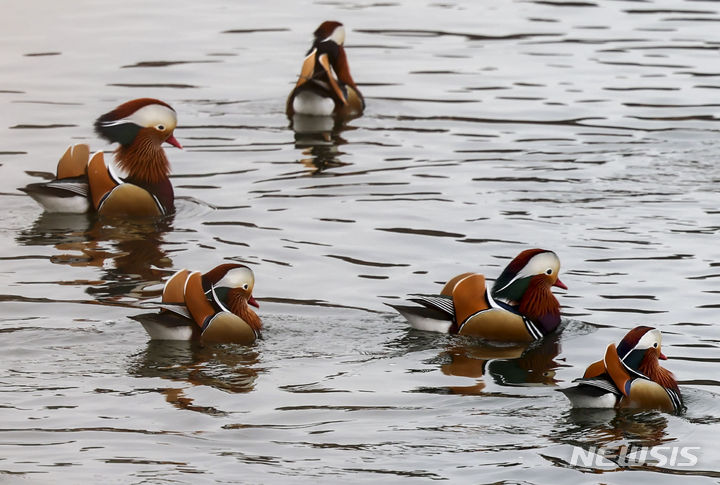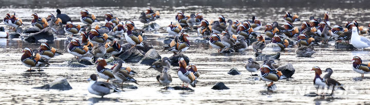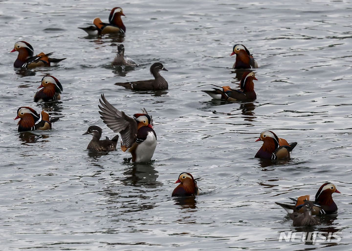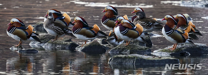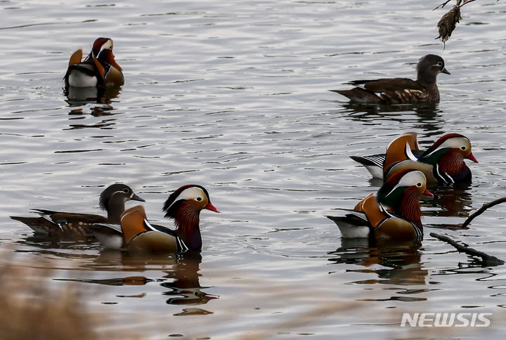 【NEWSIS】21日、ソウル市城東区の中浪川にオシドリの群れがいた。オシドリの群れがソウル市内で目撃されるのは珍しいことだ。