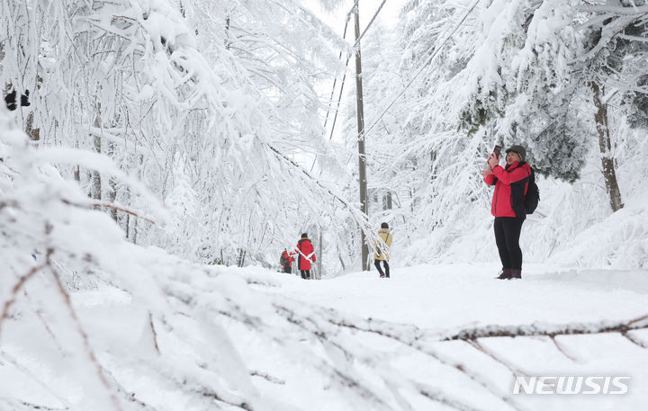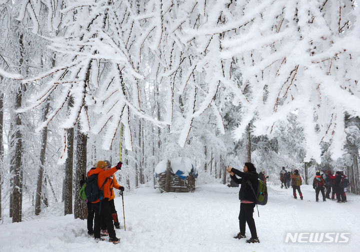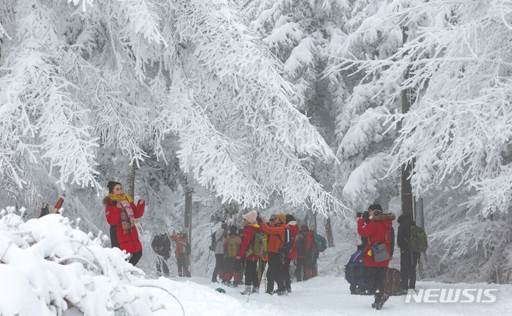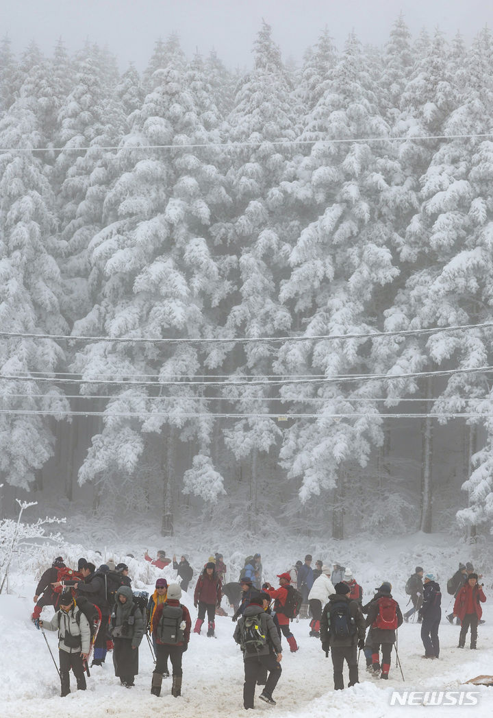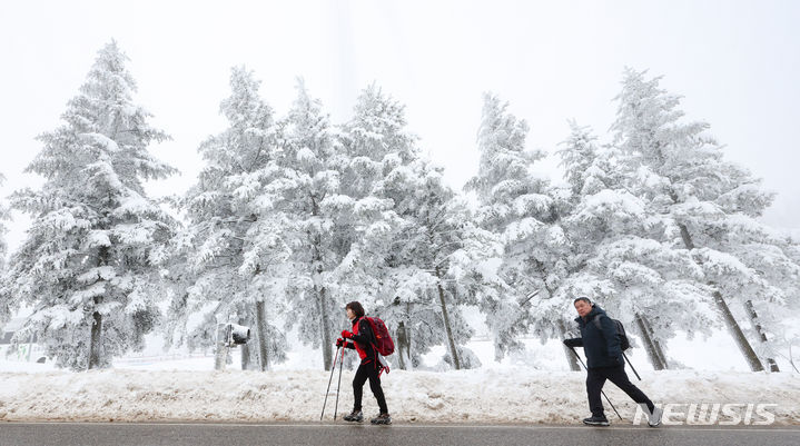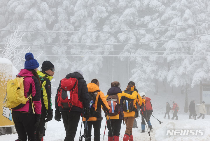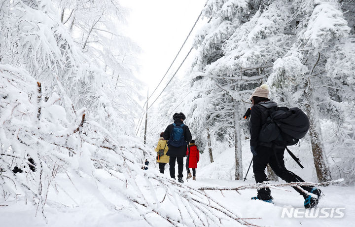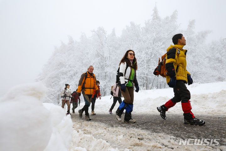 【NEWSIS】21日、江原道平昌郡の大関嶺にある仙子嶺登山路で、雪道を歩く登山客。