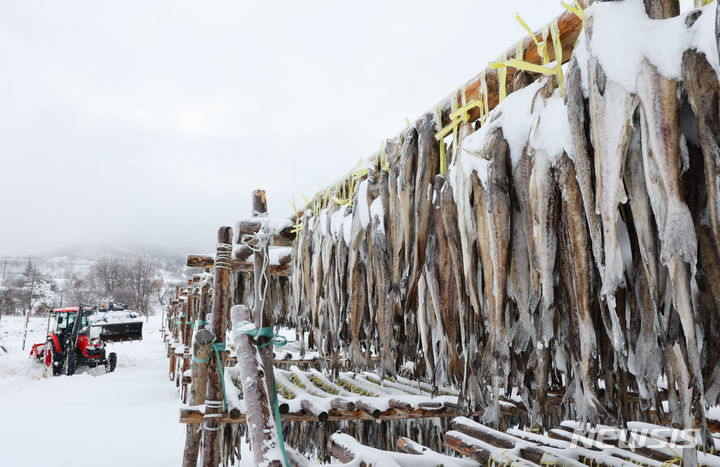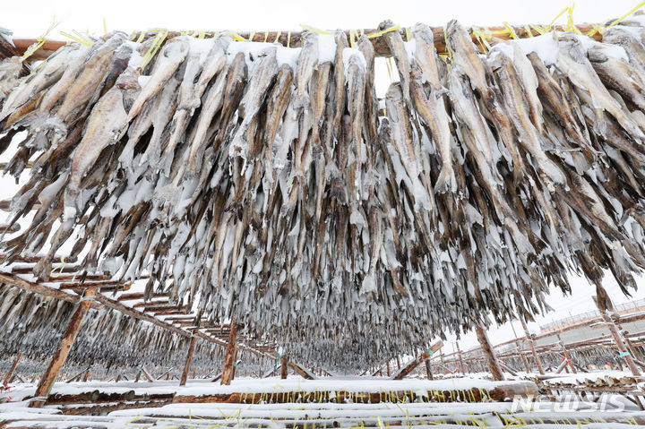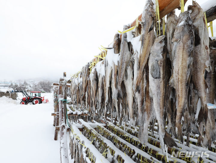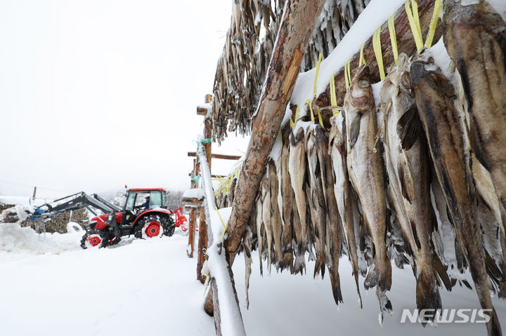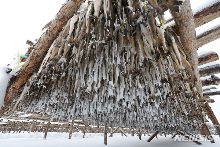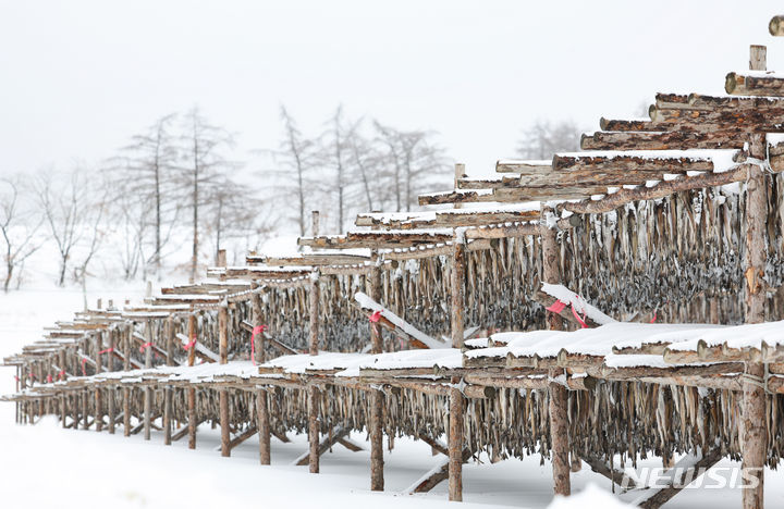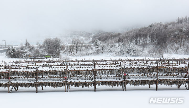 【NEWSIS】 21日、江原道平昌郡の大関嶺に近い干しダラのさおに雪が積もっていた。