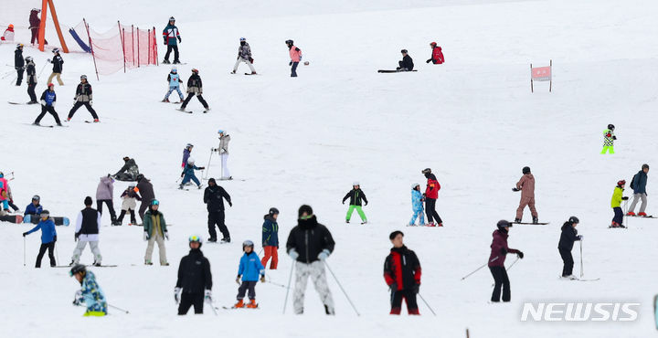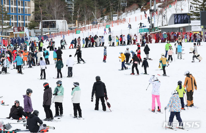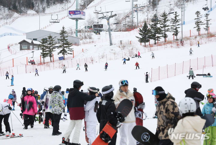 【NEWSIS】 21日、江原道平昌郡のスキー場「フェニックス平昌」を訪れた人々。リフトに乗るための長い行列ができていた。