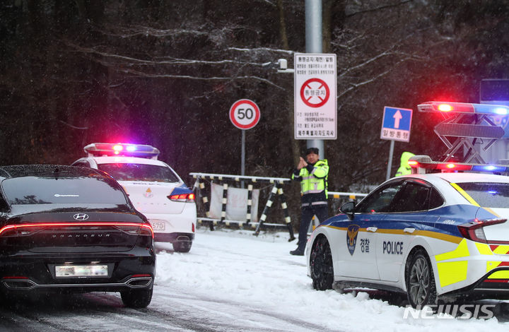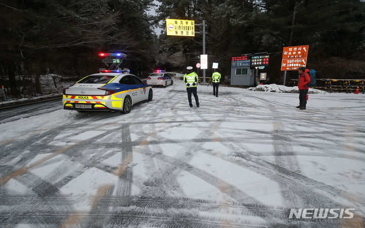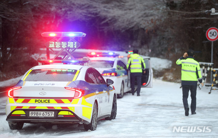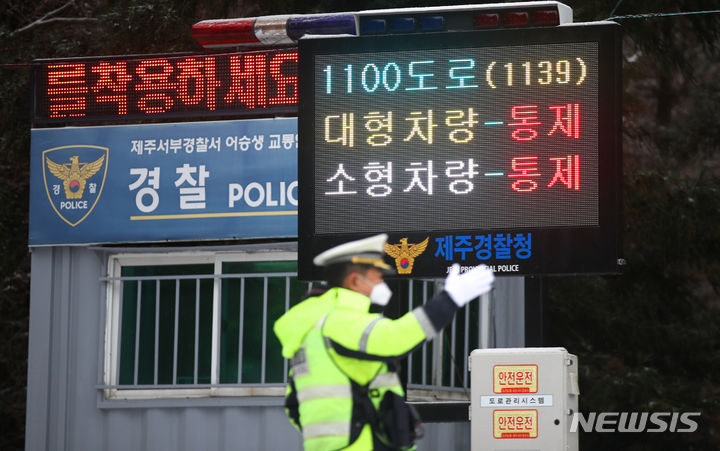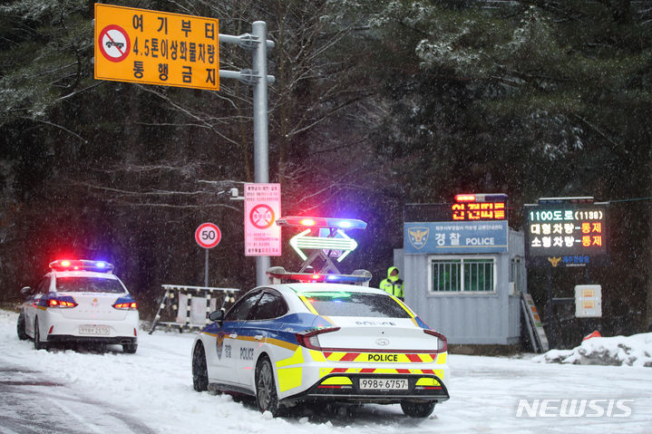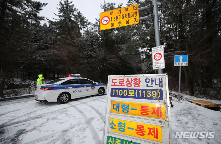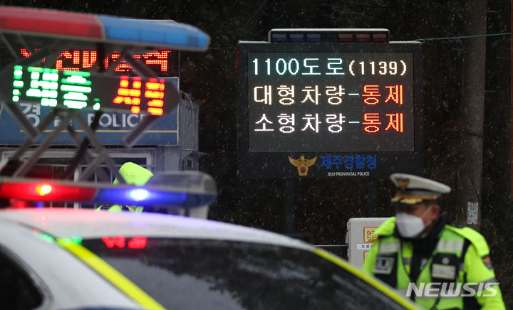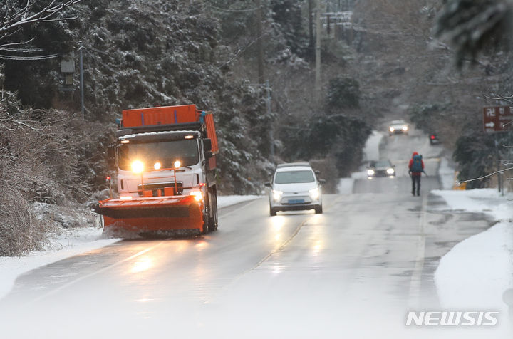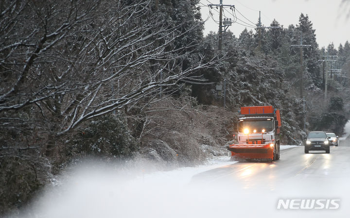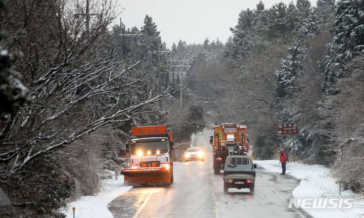 【NEWSIS】済州島の山間部に大雪特別警報が出た22日午前、漢拏山1100道路につながる山麓道路区間で除雪作業が行われていた。