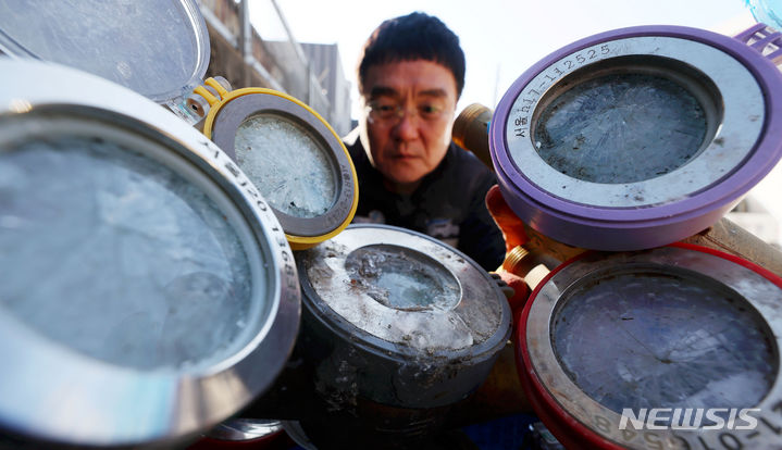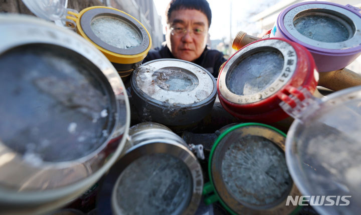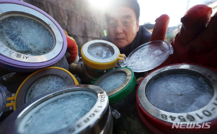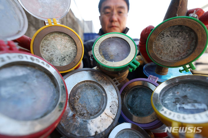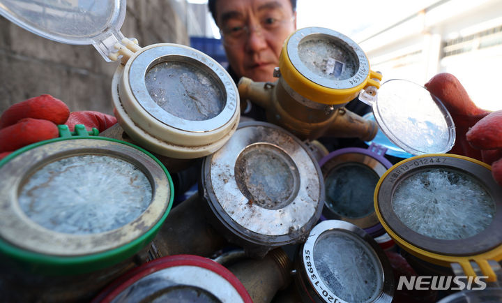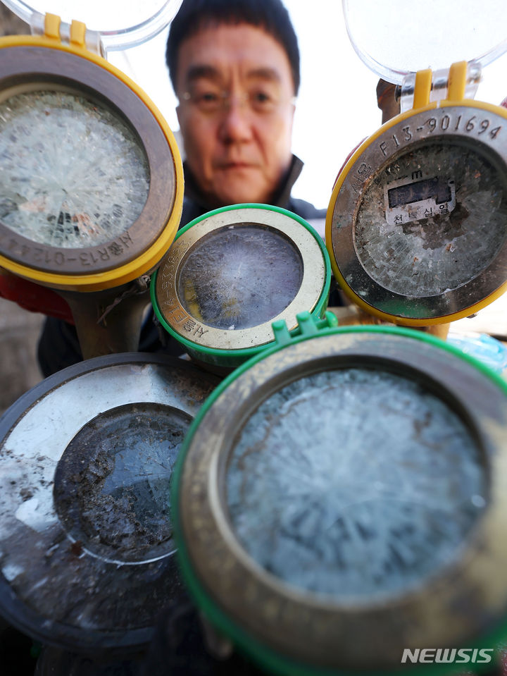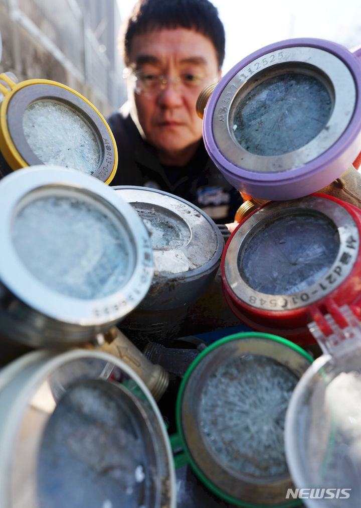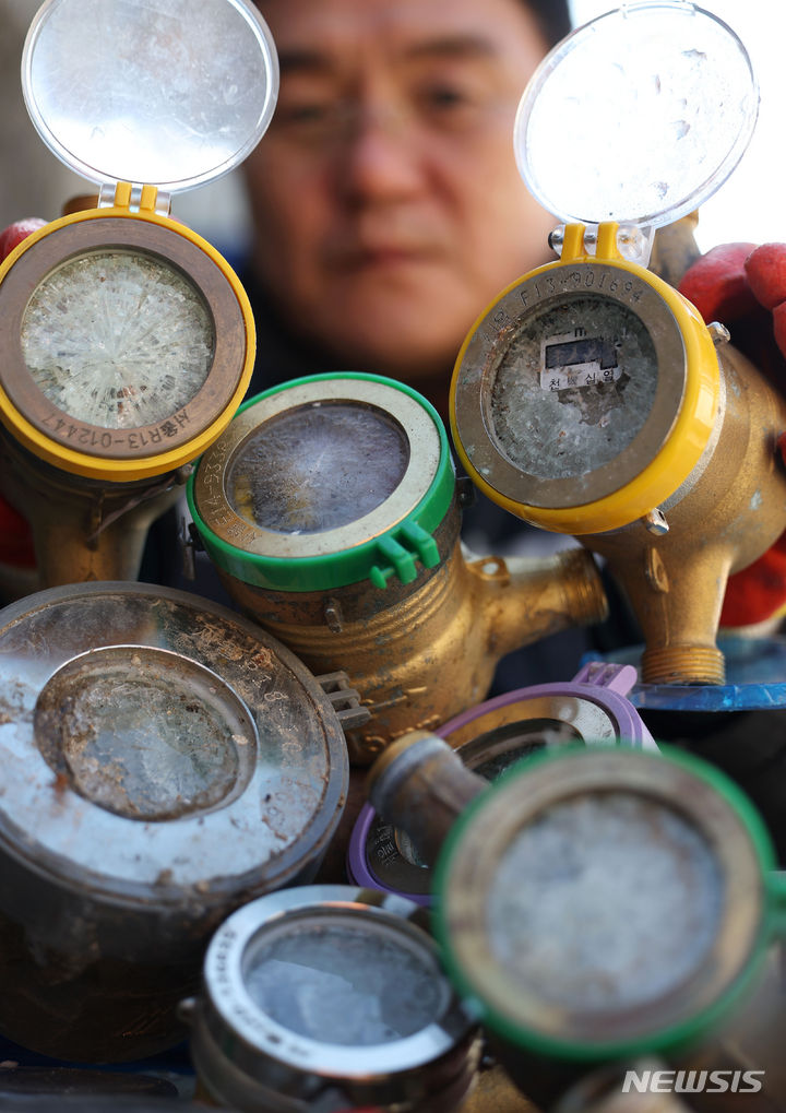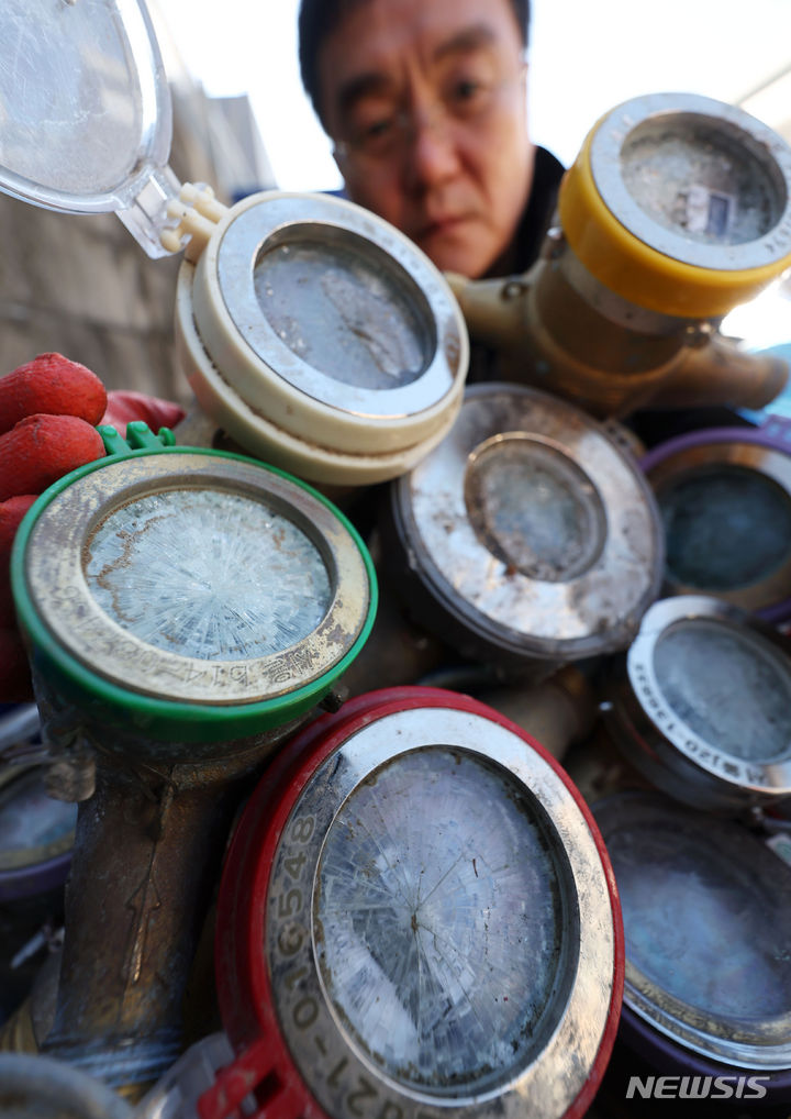 ソウルに、今年に入って初となる水道メーターの「凍破警戒」が発令された23日、ソウル市鍾路区の中部水道事業所孝子加圧場で、職員が凍結破損した水道メーターを見せてくれた。