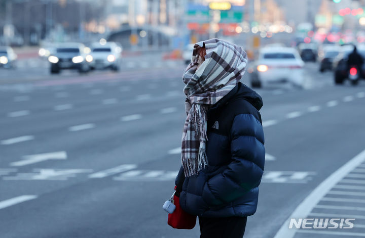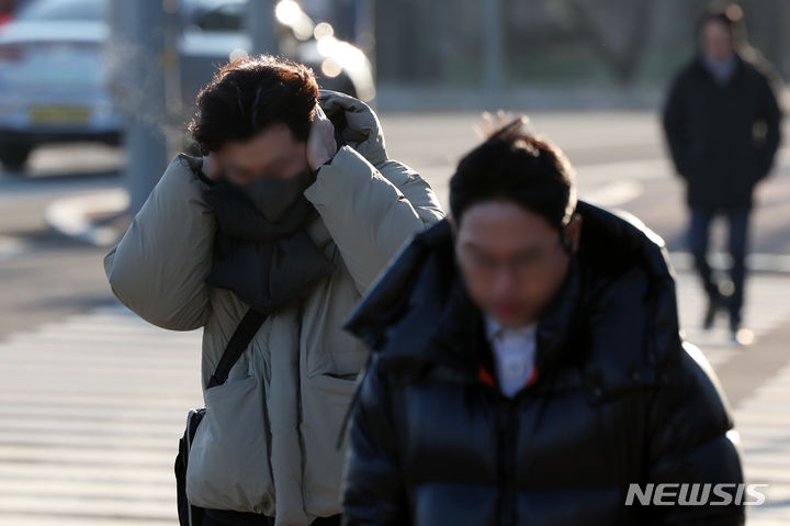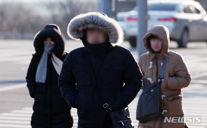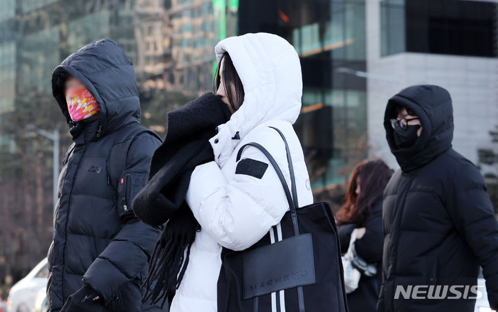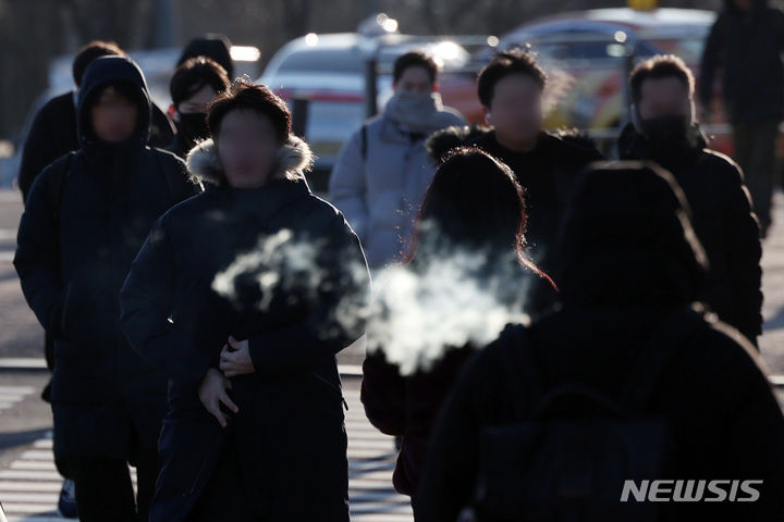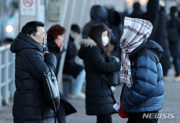 全国各地で寒波特別警報が発表された24日午前、ソウル市永登浦区の汝矣島乗り換えセンターを移動する市民たち。ソウルは同日の最低気温がマイナス12度を記録した。