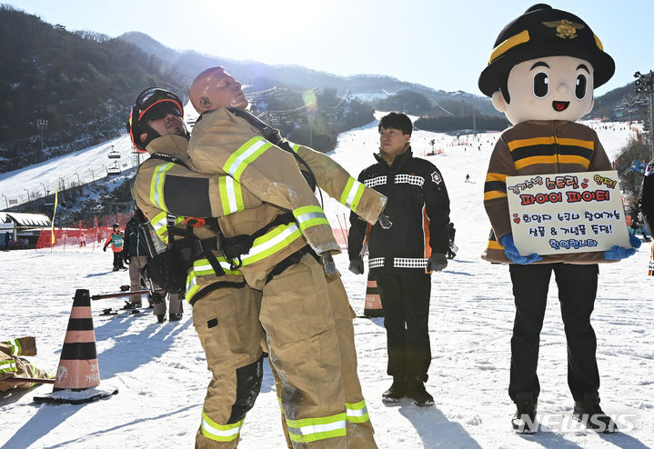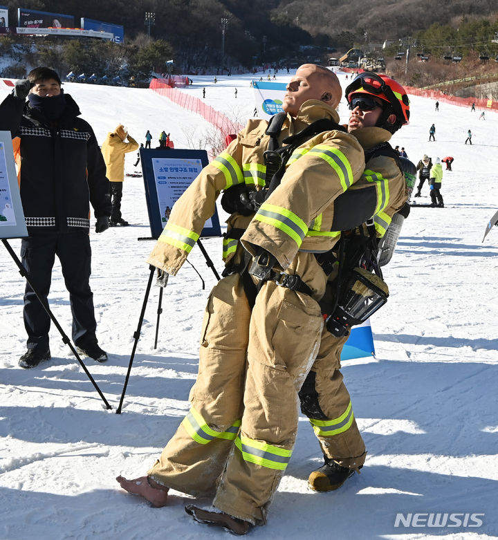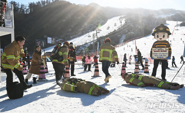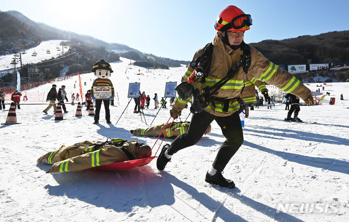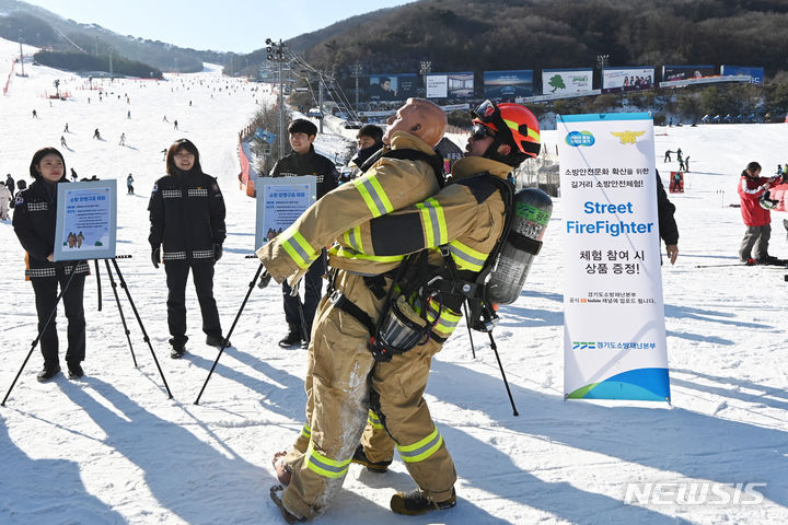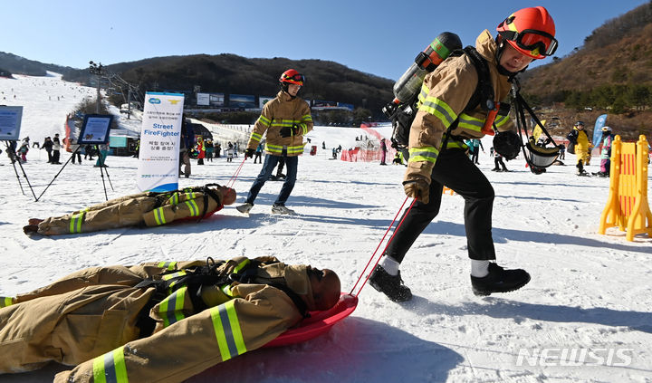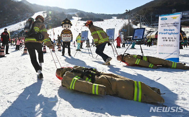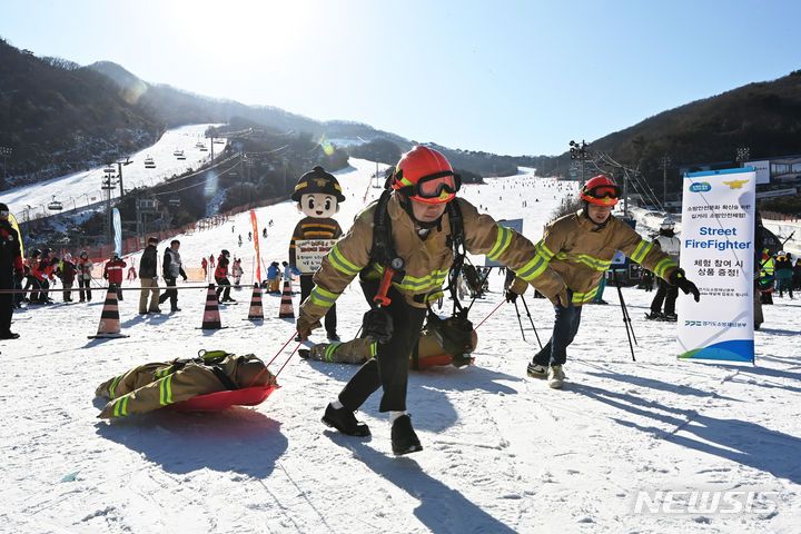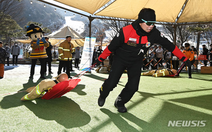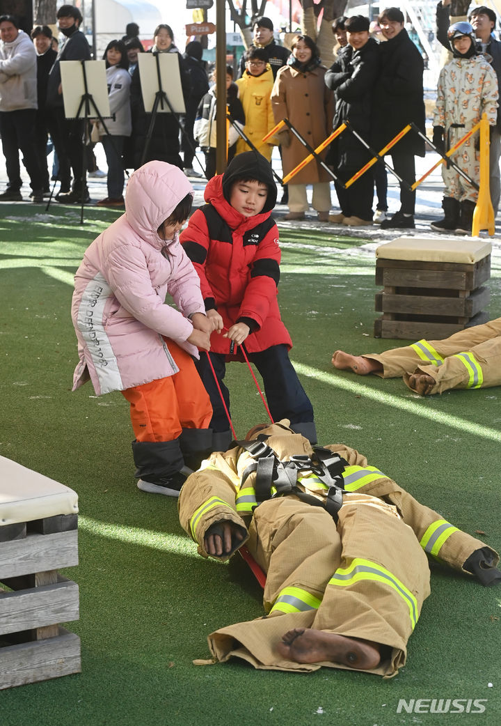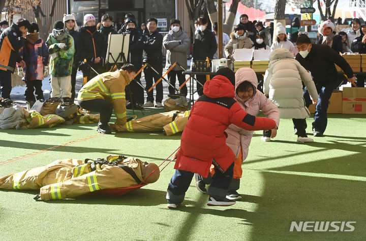 消防安全文化を広めるための「街頭消防安全体験」が開かれた25日、昆池岩リゾート(京畿道広州市)で、雪ソリを使って「マネキン引き体験」をしている市民の様子。今回の体験イベントは、京畿消防が毎月1-2回、大勢の人が集まる場所を訪れて街頭で行っている、市民参加型の消防安全体験行事だ。