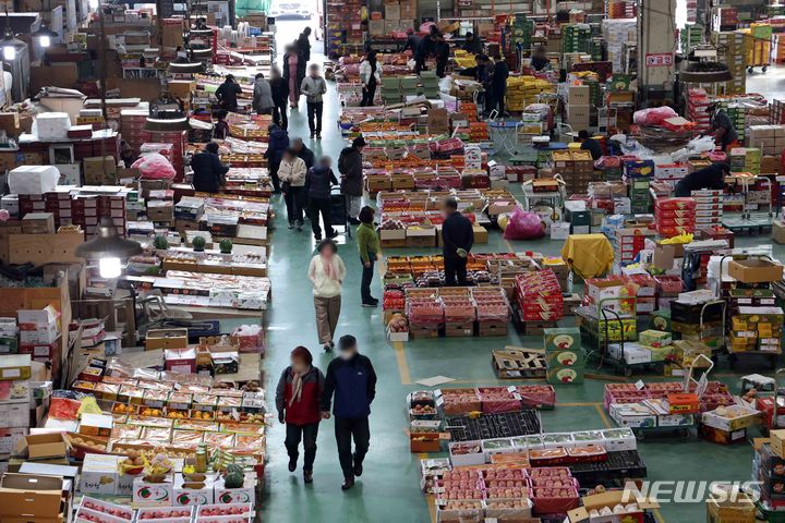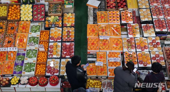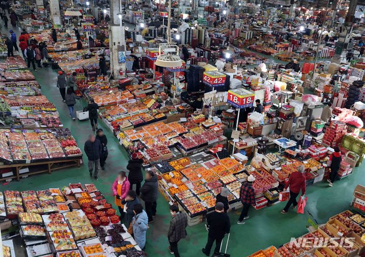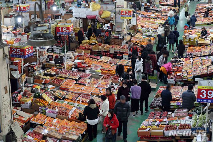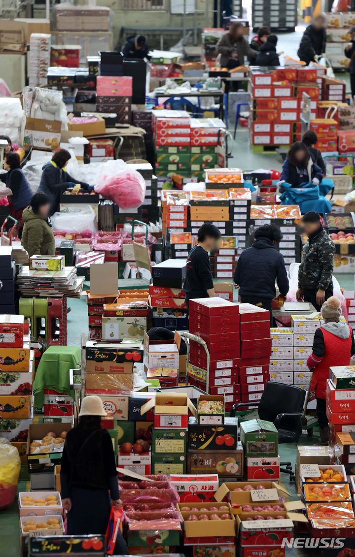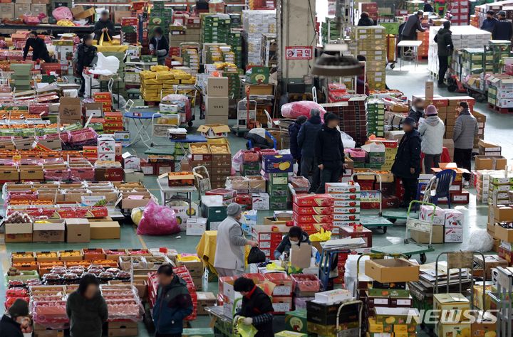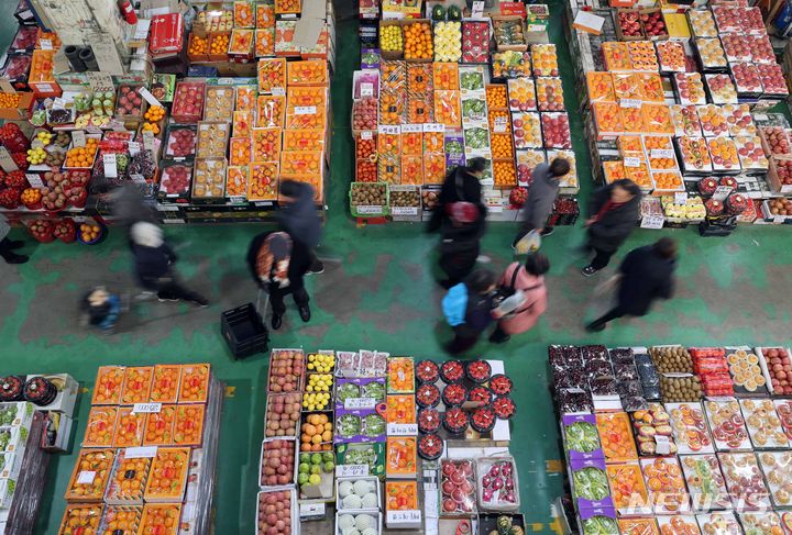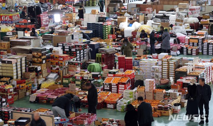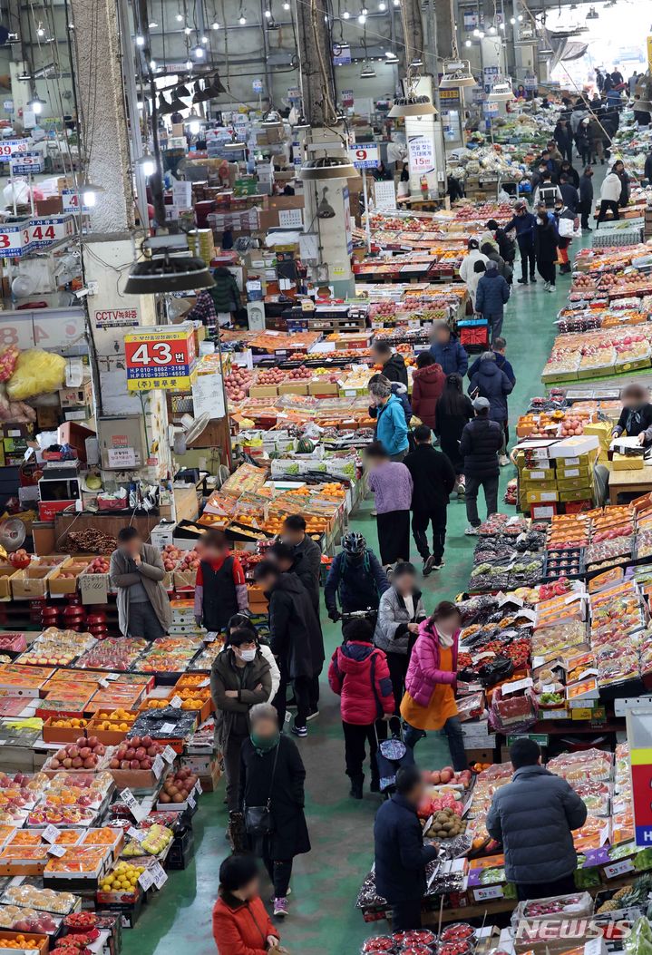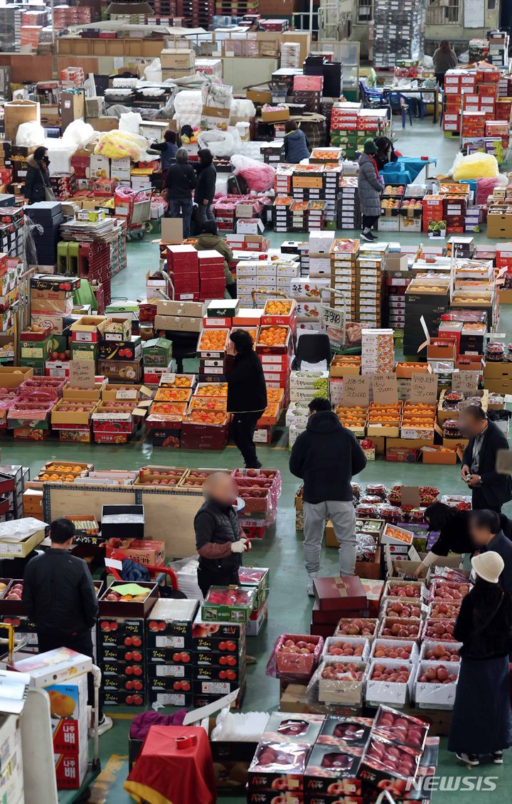 旧正月(今年は2月10日)の連休まであと十日あまりとなった29日、釜山市海雲台区の盤如農産物卸売市場を訪れた市民が、祭祀(さいし)用またはギフト用の果物を買い求めている様子。