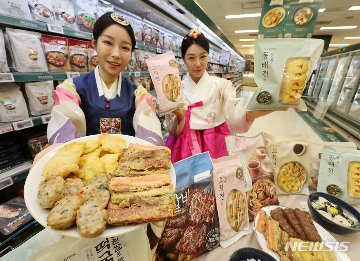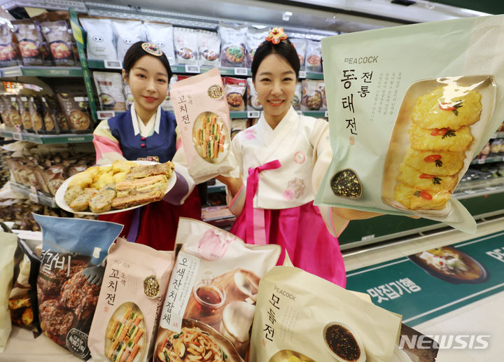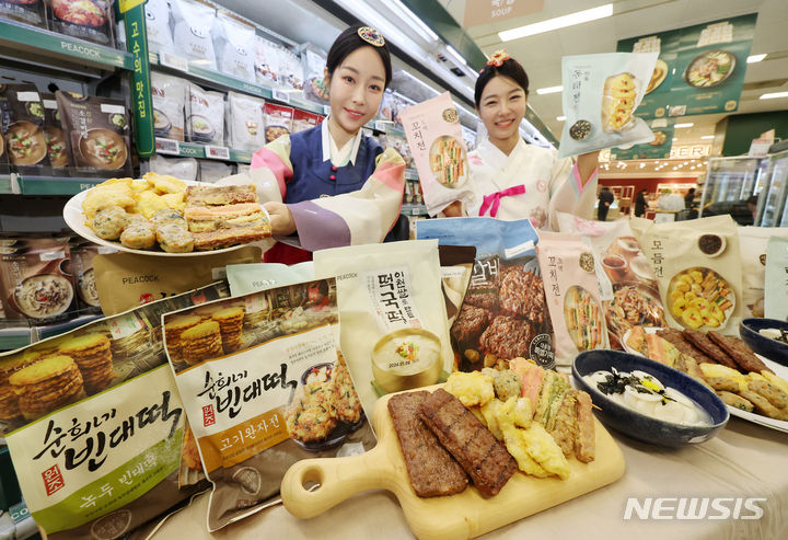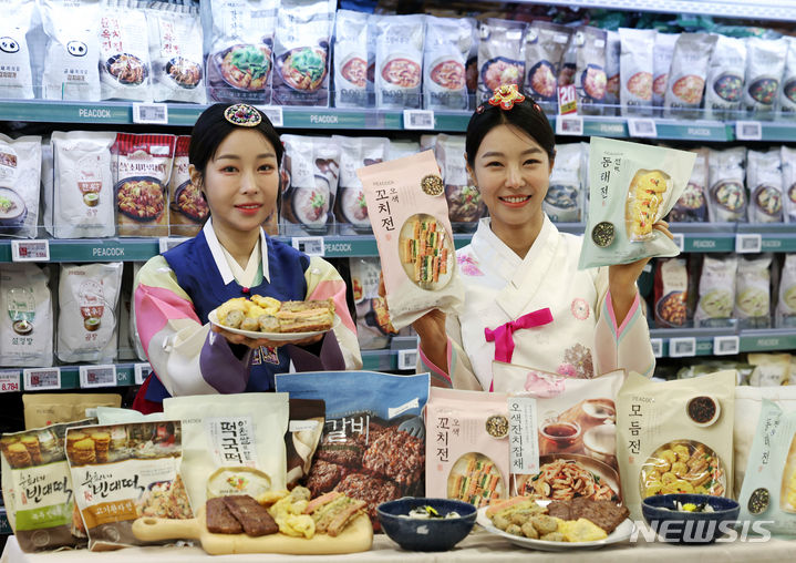 ソウル市竜山区の大手スーパー「Eマート竜山店」で30日午前、簡便食ブランド「PEACOCK簡便祭需用品」の商品をPRしているコンパニオンの様子。