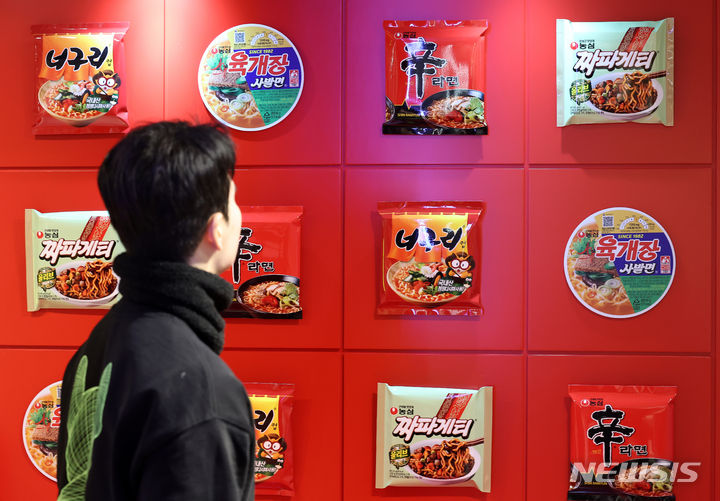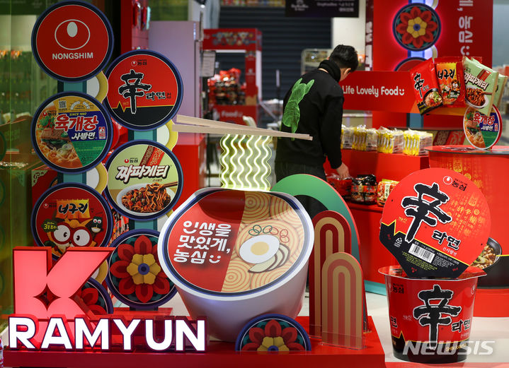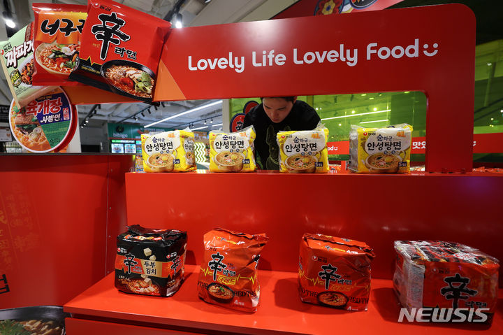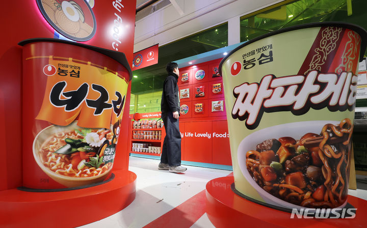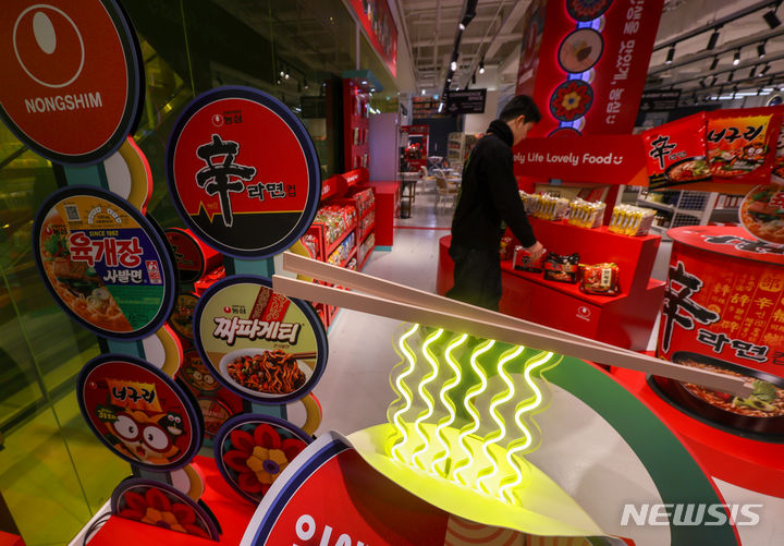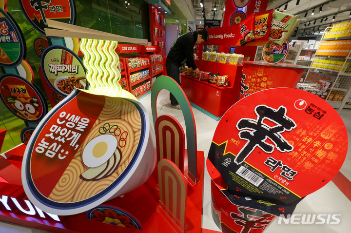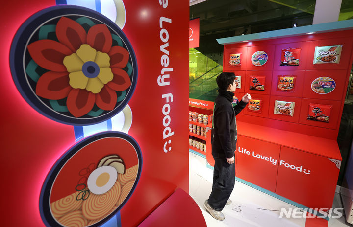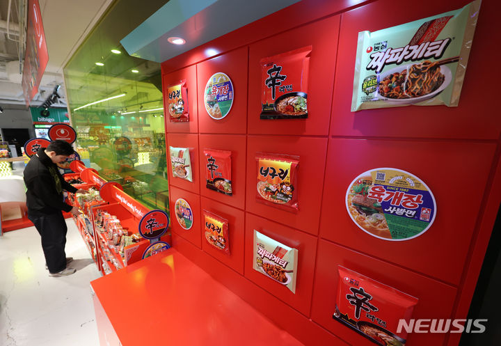31日午後、ソウル市中区のライフワーク・トッケビマート明洞店に整備された農心ブランドゾーンで、関係者が売り場を見て回っている様子。31日にオープンしたこの売り場では、農心の主な製品を見て回りながら、自ら即席調理機などを使って調理して食べることができる。