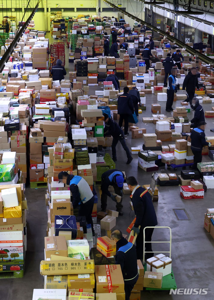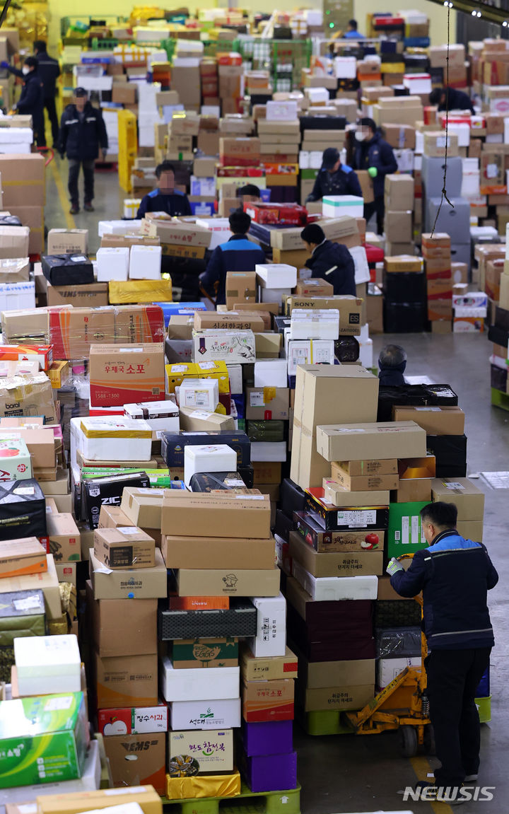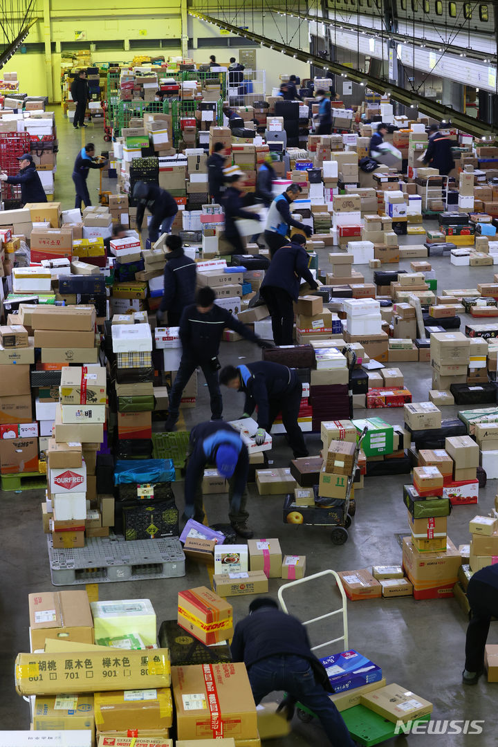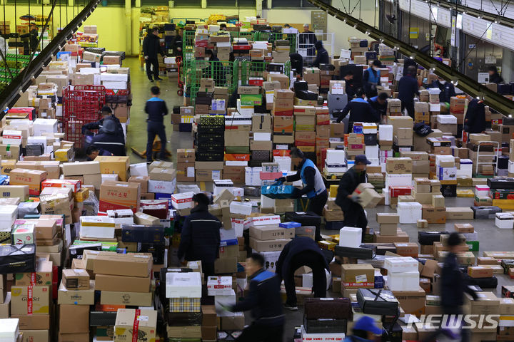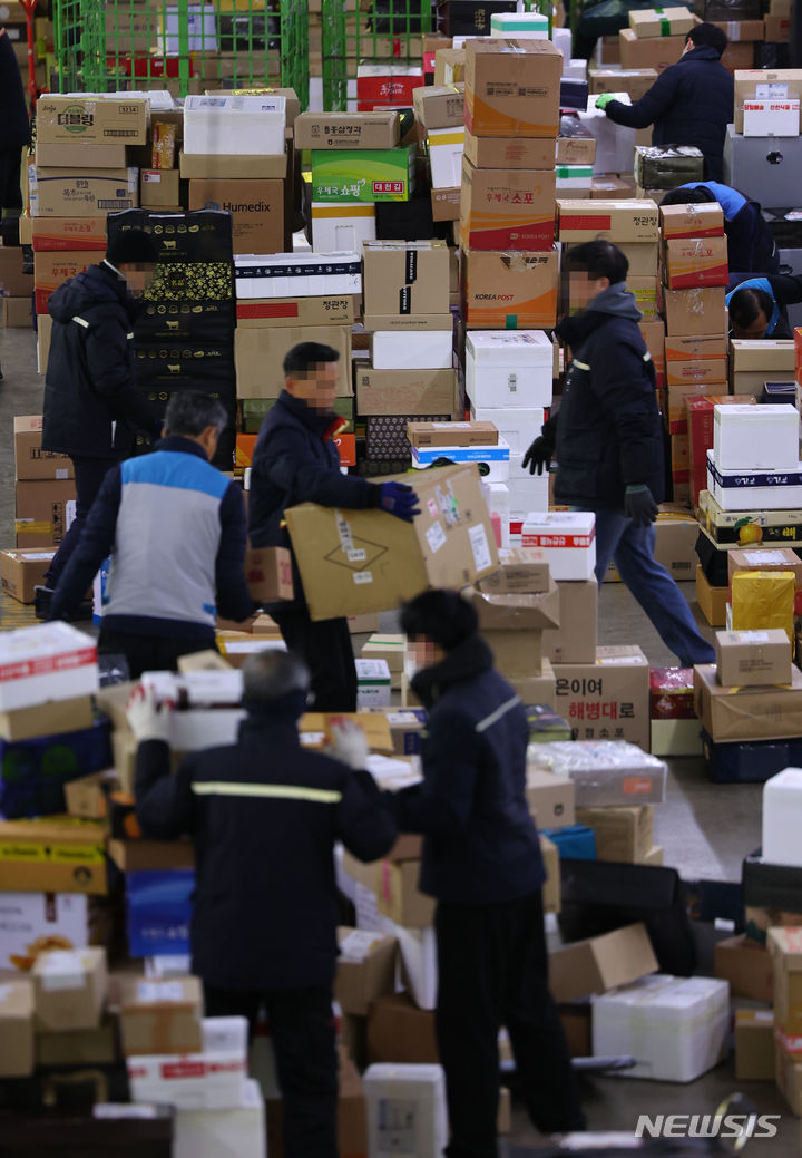 【NEWSIS】今年の旧正月郵便物特別配送期間中の1日、ソウル市広津区の東ソウル郵便物流センターで、旧正月の贈答品など小包を仕分けする関係者たち。韓国科学技術情報通信部(省に相当)の郵政事業本部は先月29日から今月14日までの17日間を「2024年旧正月 郵便物特別配送期間」と定め、迅速な配達のため非常勤務態勢に入った。