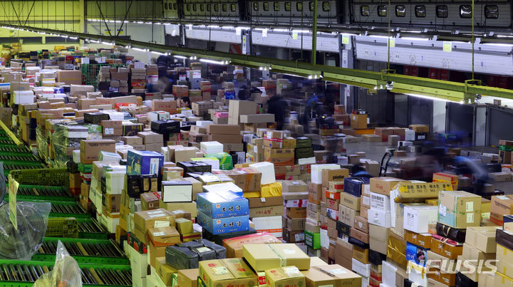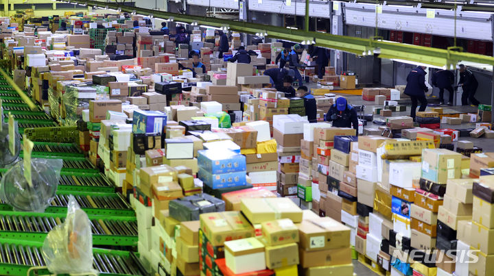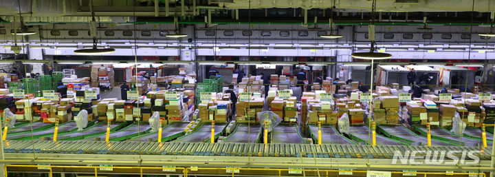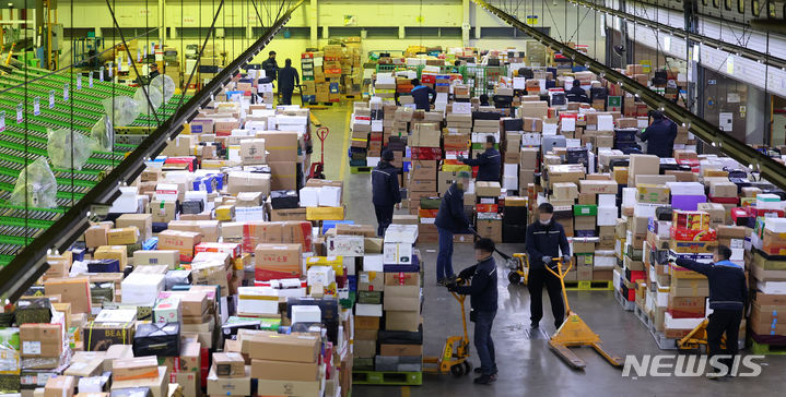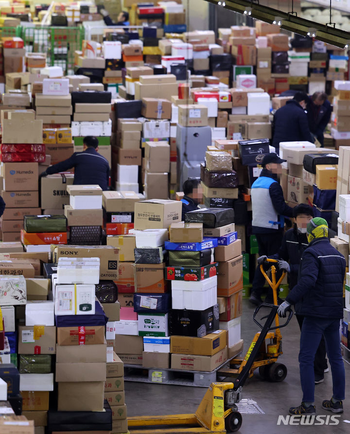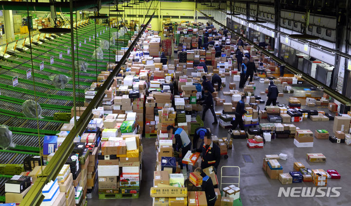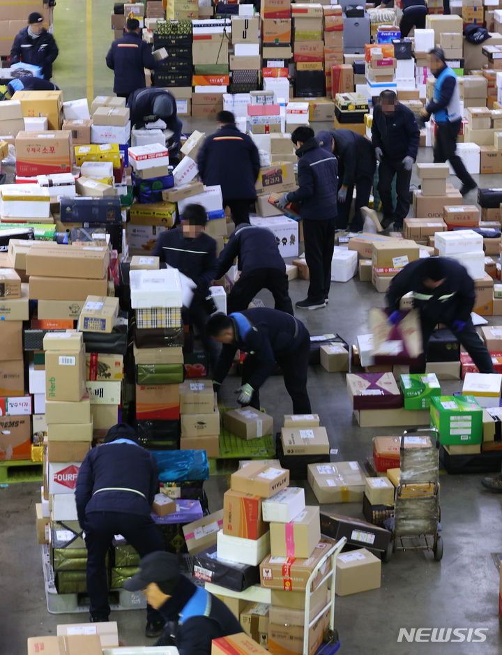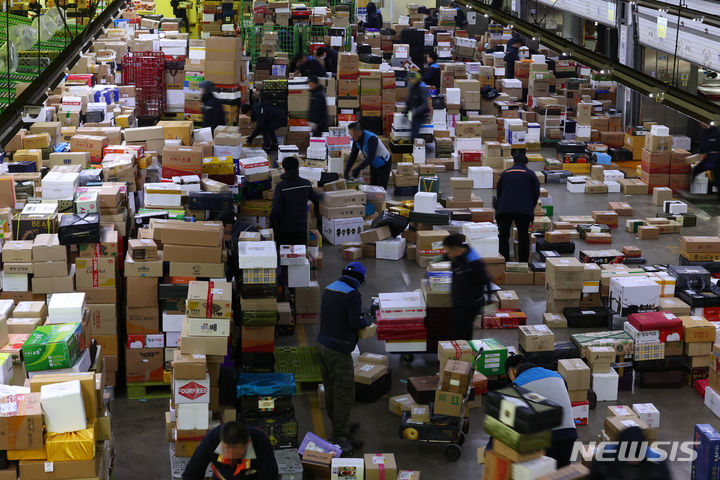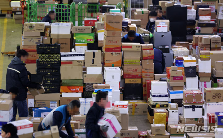 【NEWSIS】今年の旧正月郵便物特別配送期間中の1日、ソウル市広津区の東ソウル郵便物流センターで、旧正月の贈答品など小包を仕分けする関係者たち。韓国科学技術情報通信部(省に相当)の郵政事業本部は先月29日から今月14日までの17日間を「2024年旧正月 郵便物特別配送期間」と定め、迅速な配達のため非常勤務態勢に入った。