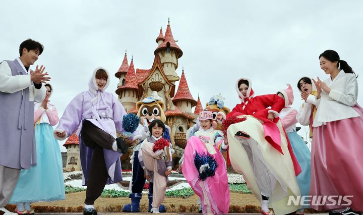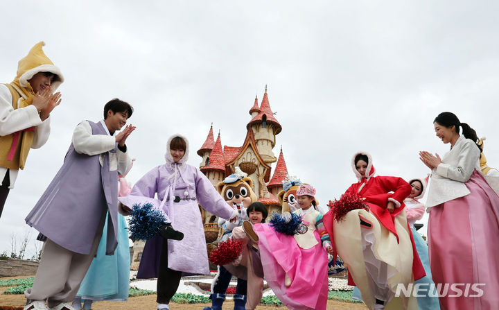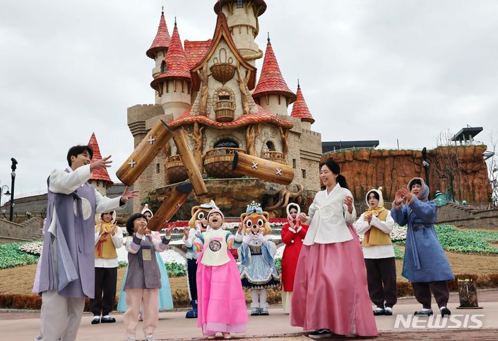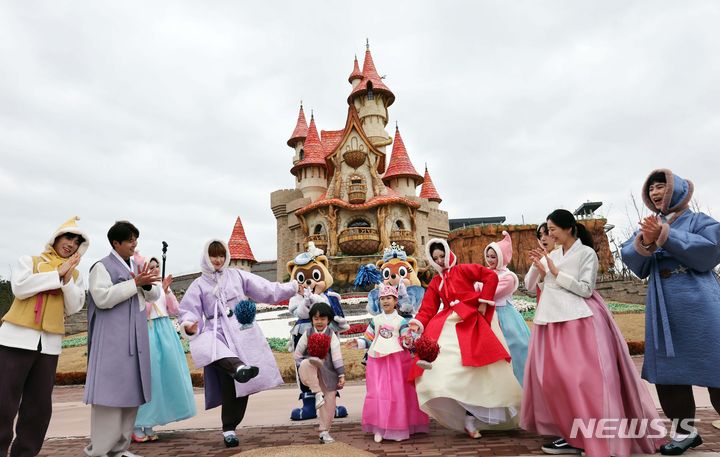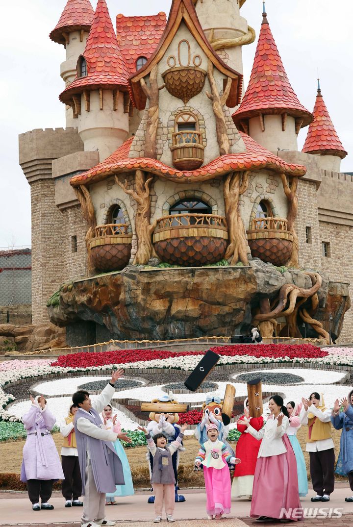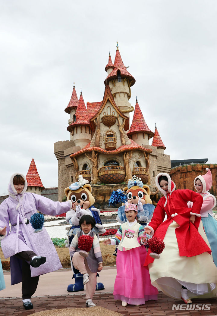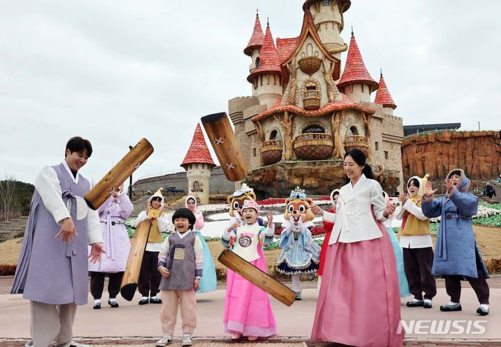釜山市機張郡のロッテワールド・アドベンチャー釜山で6日、韓服(韓国の伝統衣装)を着たコンパニオンが「ユンノリ」など韓国の伝統遊戯の体験をしているところ。ロッテワールド釜山は、旧正月(今年は2月10日)の連休期間に当たる9日から12日まで、毎日正午からジョイフル・メドウ(Joyful Meadow)ゾーンとワンダー・ステージで、韓服を着た公演演技者らと共に投壺、チェギチャギ、ユンノリなどを楽しめる「民族ノリ広場」を運営する。