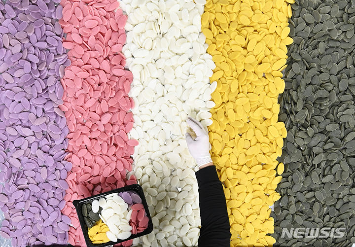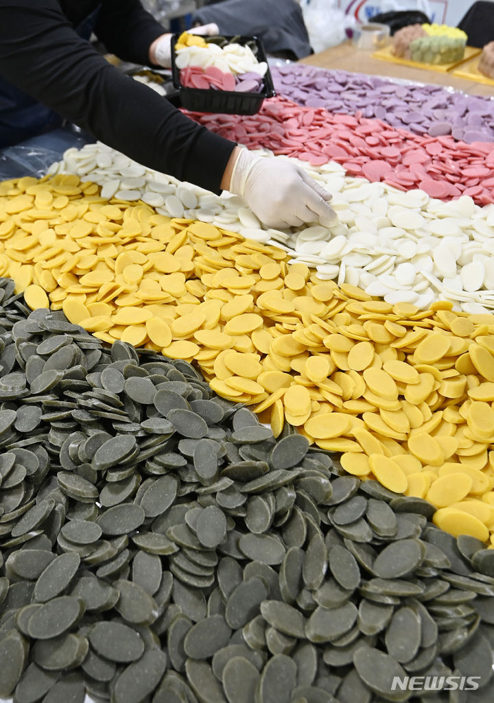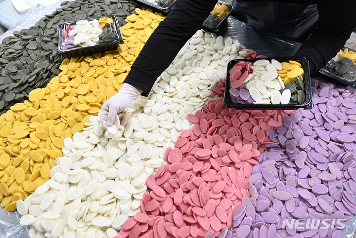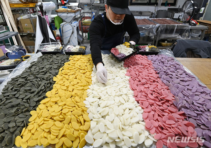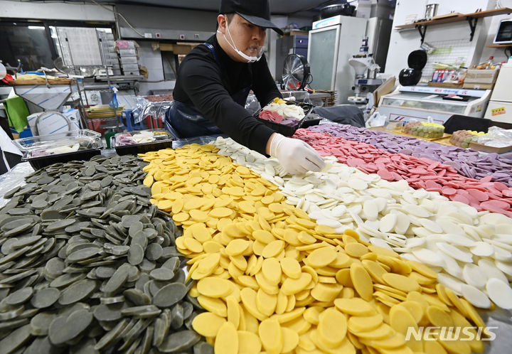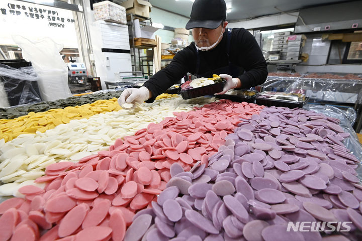 旧正月(今年は2月10日)まであと三日と迫った7日、京畿道水原市長安区の亭子市場にある餅店では、従業員が五色カレトック(細長い棒状の餅)を包装にいそしんでいた。