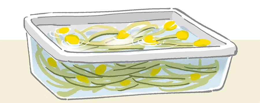 料理に使って残ってしまった豆もやしはヒゲ根を取り、密閉容器に水と一緒に入れて冷蔵保存すると、新鮮さが長持ちする。