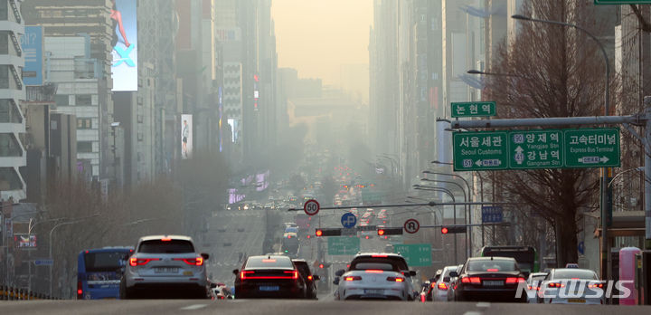 【NEWSIS】ソウルをはじめとする中部地方でPM2.5(微小粒子状物質)濃度が高い水準となった13日、ソウル・江南のビル街はかすんでいた。