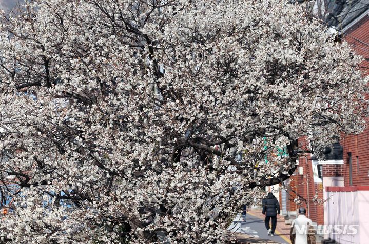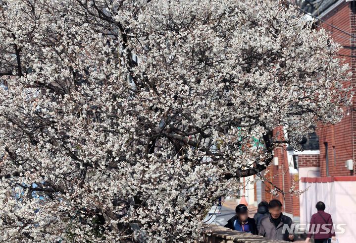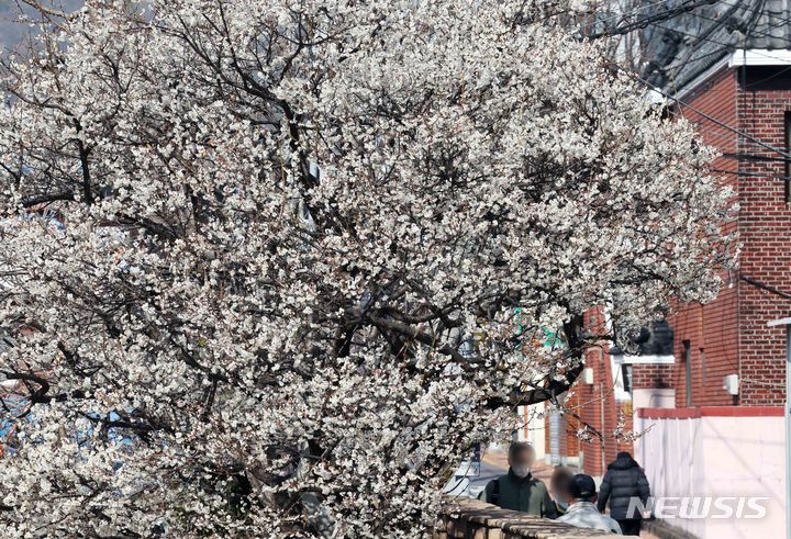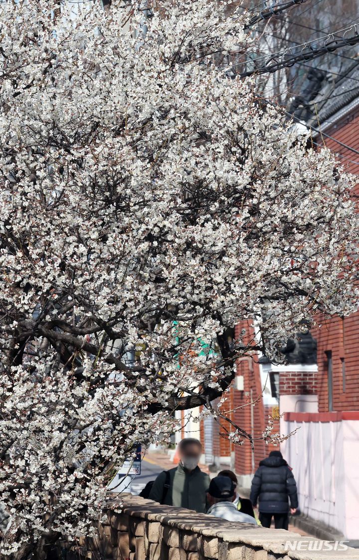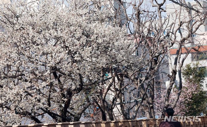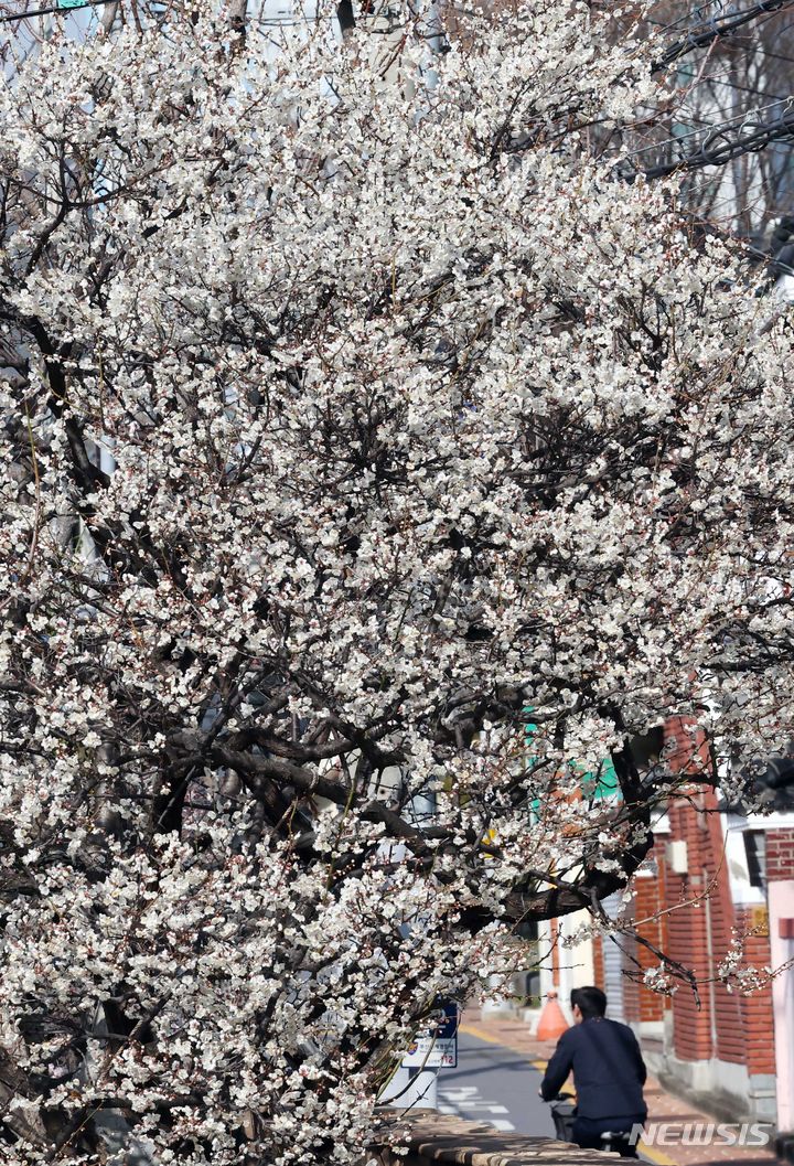 温かい天気となった13日、釜山市水営区のある住宅の塀のところで、大きく咲いたウメの花が春の訪れを伝えている様子。