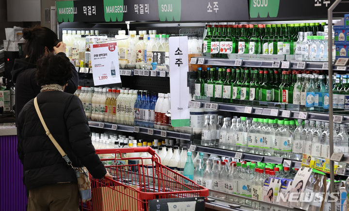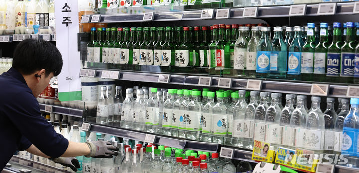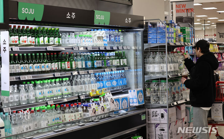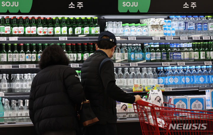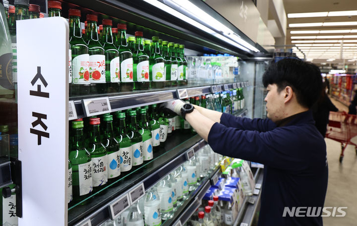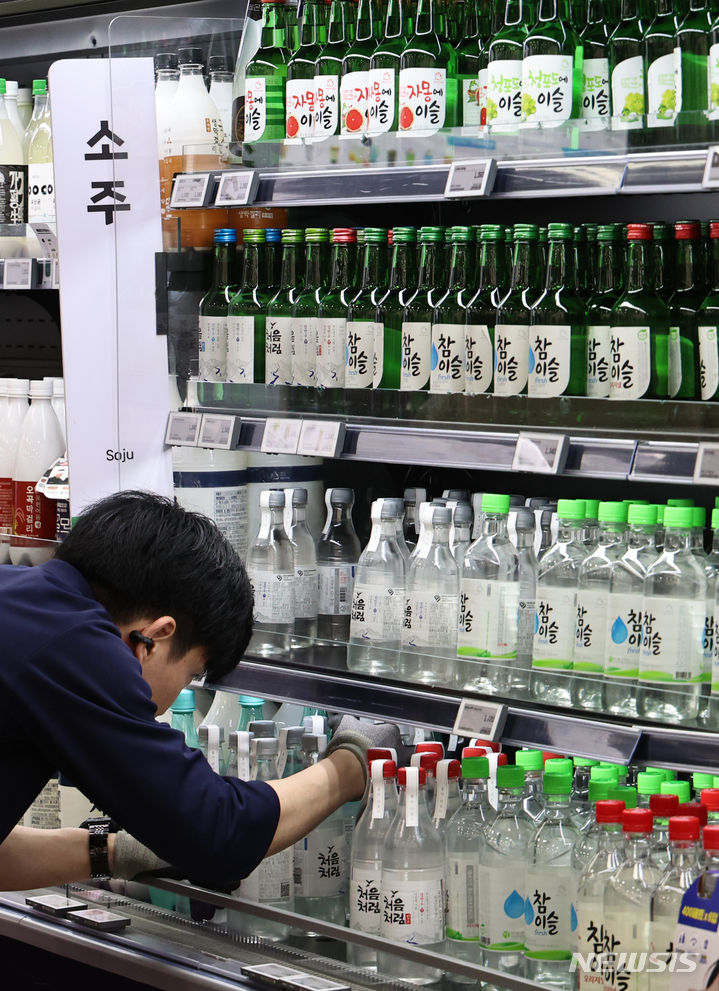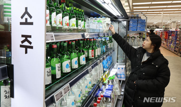 ハイト眞露が代表ブランド「チャミスルフレッシュ」のアルコール度数を16.5から16に下げて販売する等、韓国の酒類業界が度数の低いお酒への需要増に対応して焼酒(韓国焼酎)の度数を下げている。写真は14日午後、ソウル市内の大手スーパーに陳列されている各種の焼酒製品の様子。