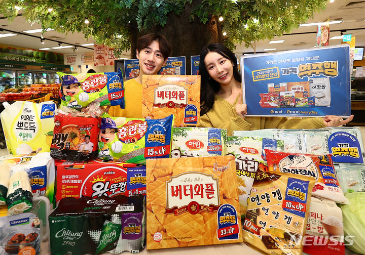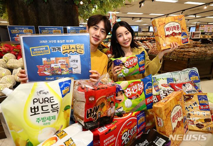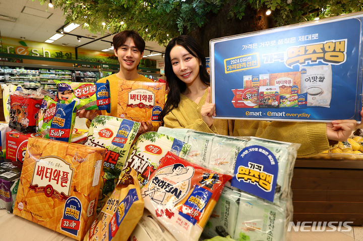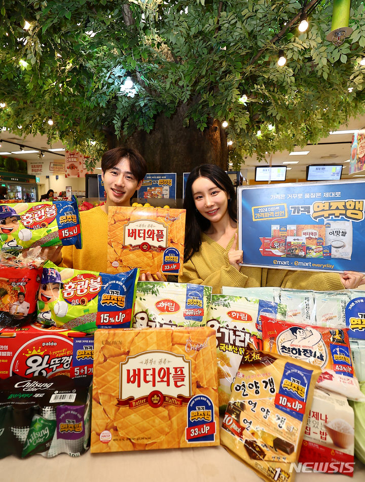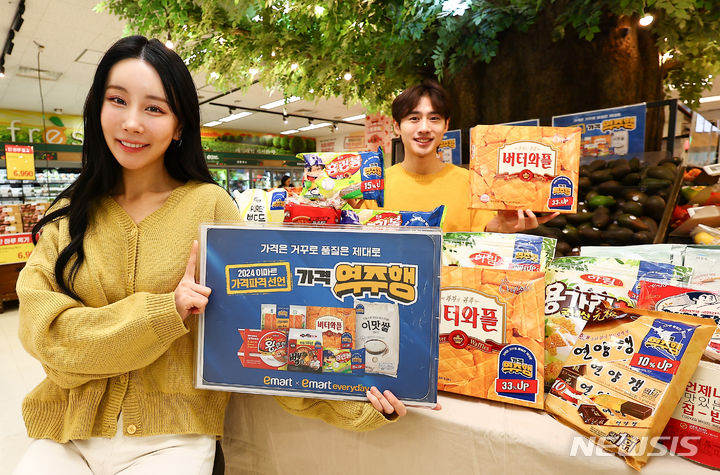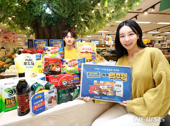 15日、ソウル市竜山区の大手スーパー「Eマート竜山店」でポーズを取っているコンパニオンの様子。EマートはEマート・エブリデイとコラボして、今月16日から食料品と日常用品、小型家電など必需商品類を四半期ごとに超低価格で提供する「価格逆走行」プロジェクトを始める。