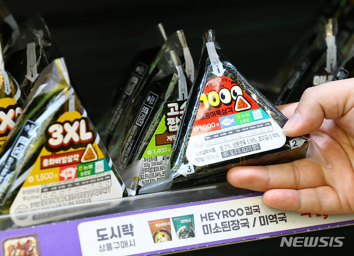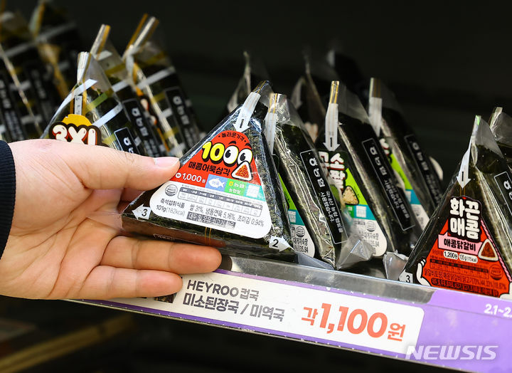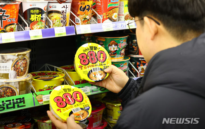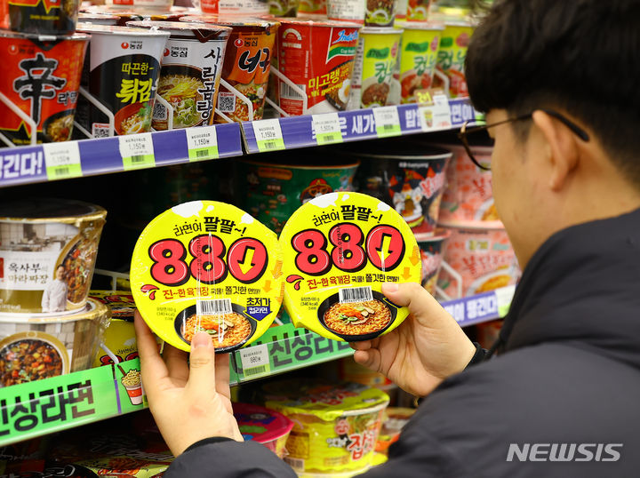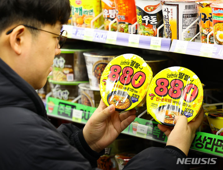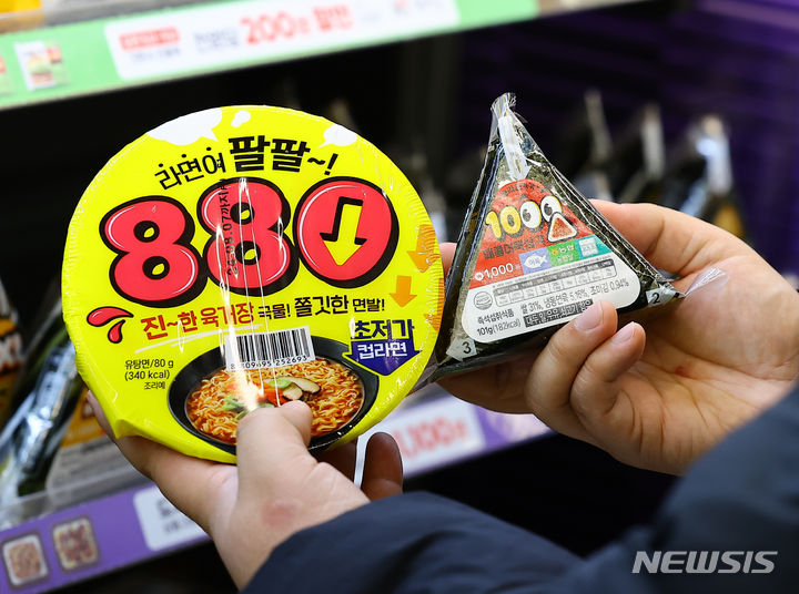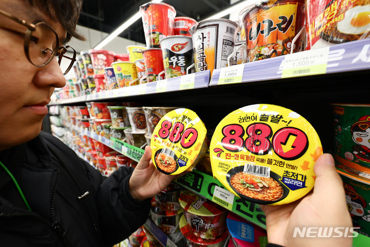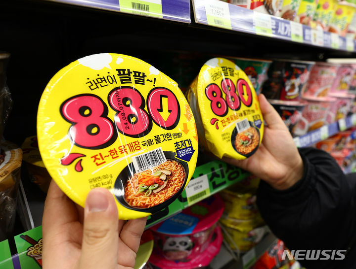 ソウル市江南区のCU BGFに15日、「880ウォン・カップラーメン」が並んでいる様子。BGFリテールが運営するコンビニチェーンCUは、880ウォン(現在のレートで約99円。以下同じ)のユッケジャン・カップラーメンと1000ウォン(約113円)のサムガクキムパプを新たに披露した。