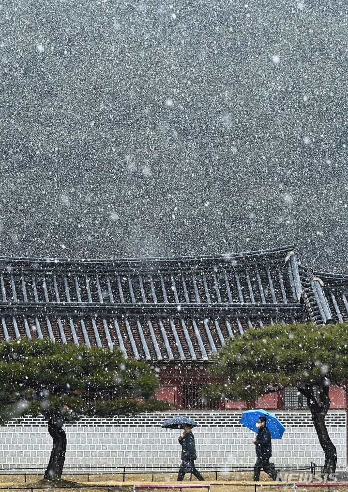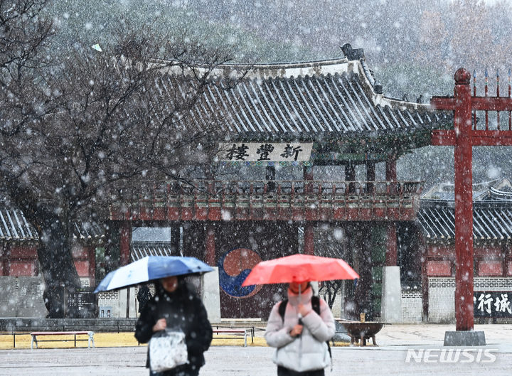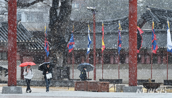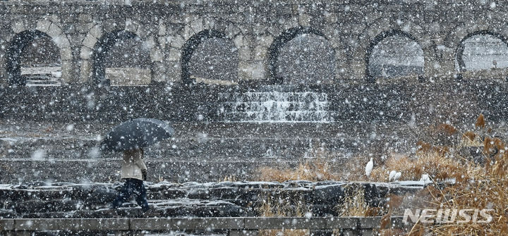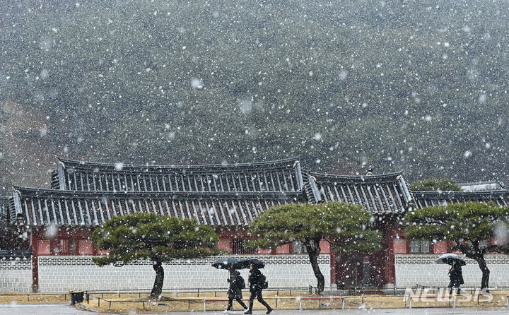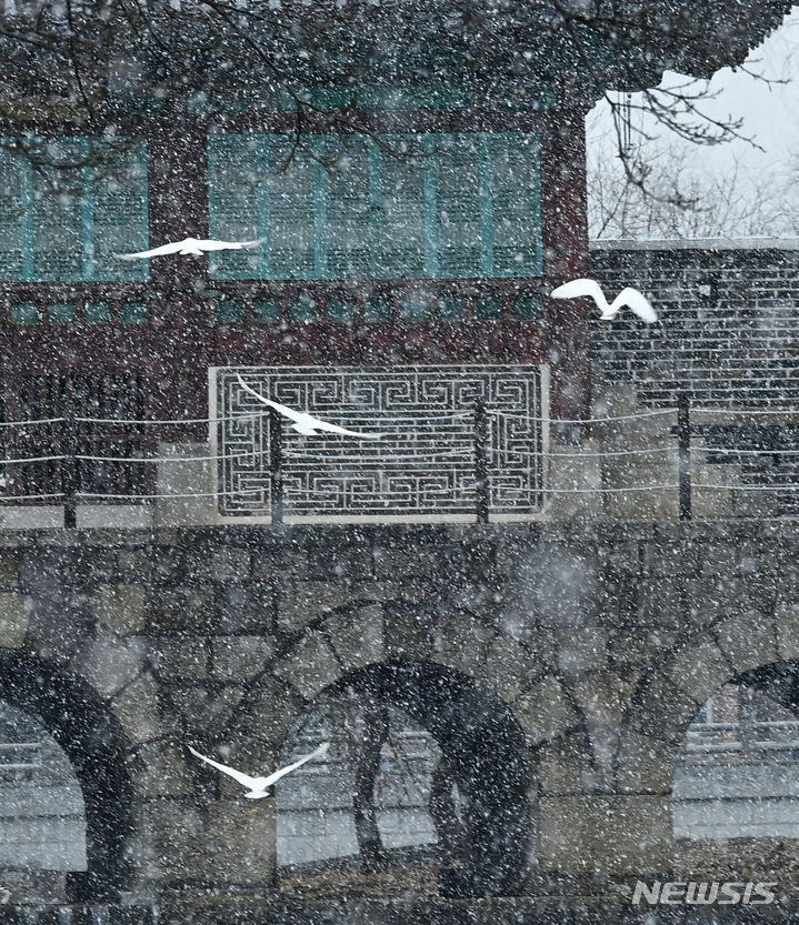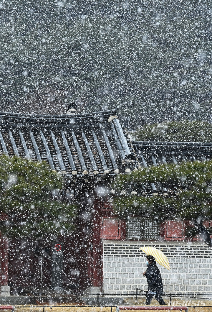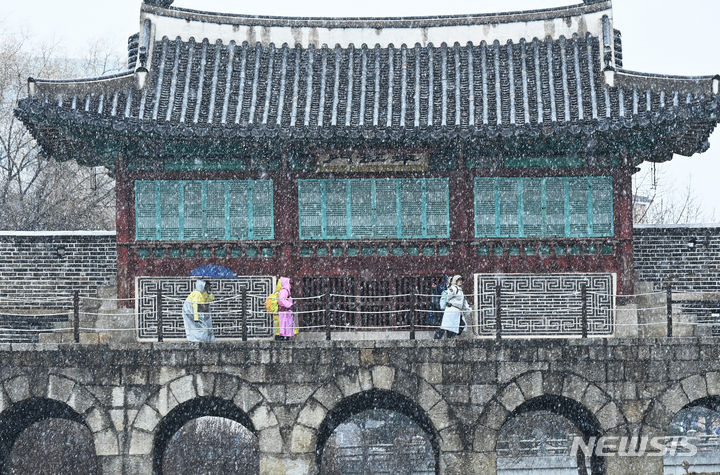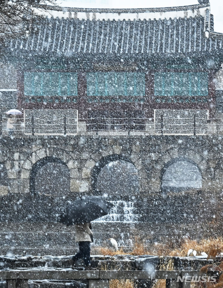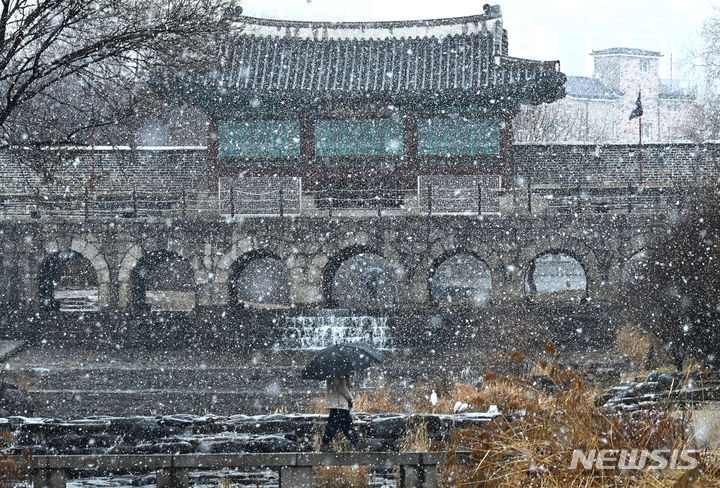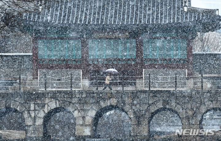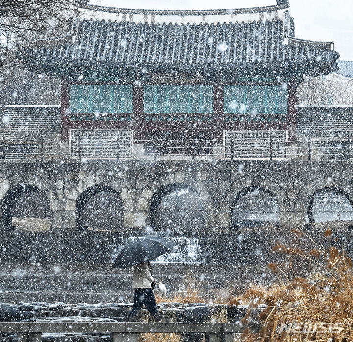 15日、雪の降る中で華虹門(京畿道水原市八達区)を歩く市民。