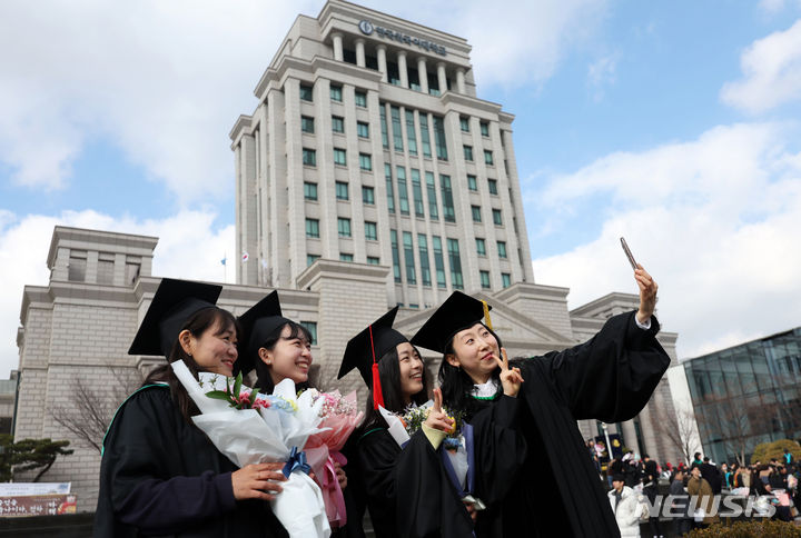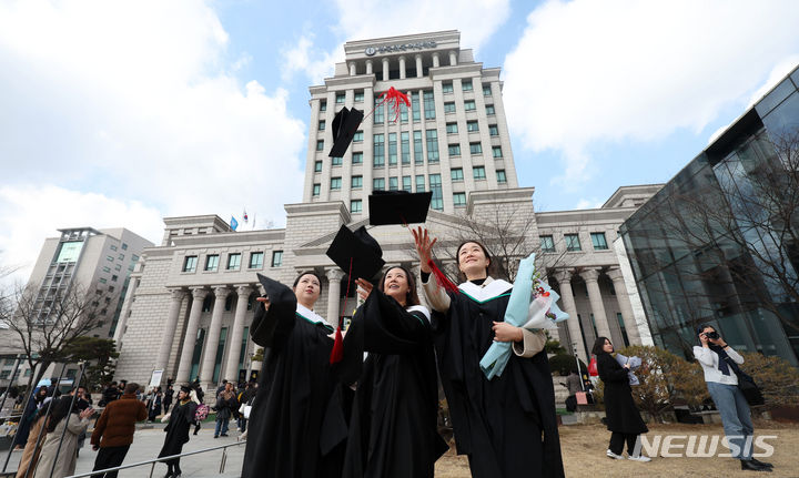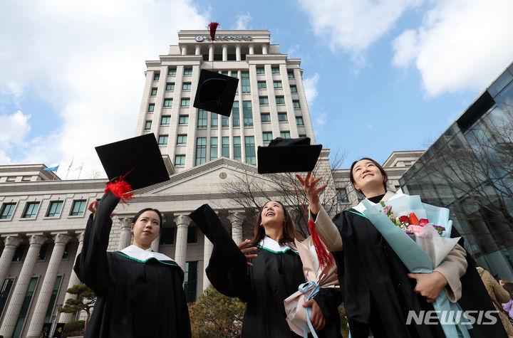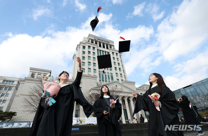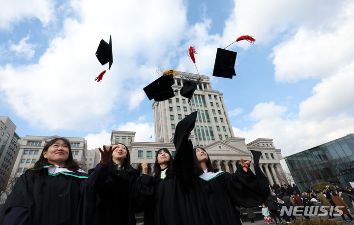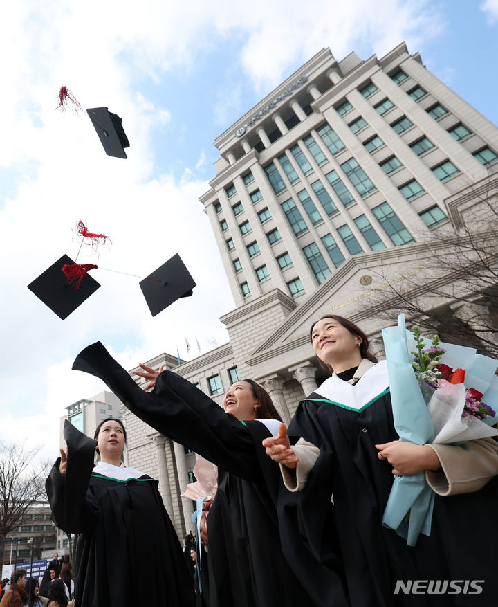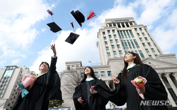 16日、ソウル市東大門区の韓国外国語大学で開かれた2024年前期学位授与式において、卒業生らが学士帽を投げている様子。