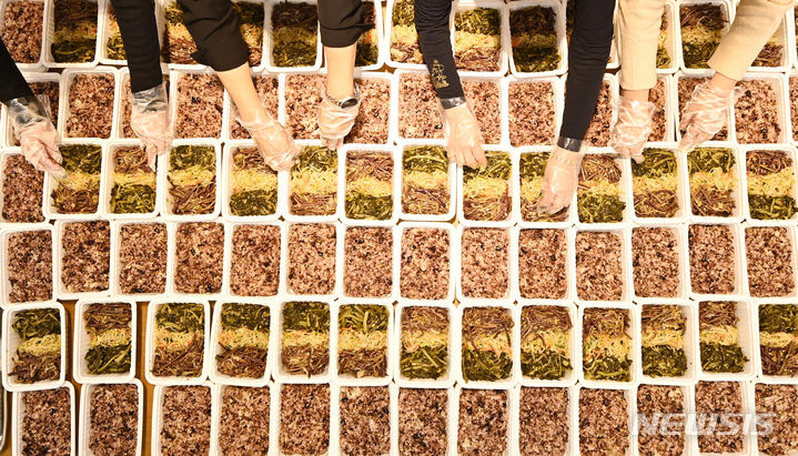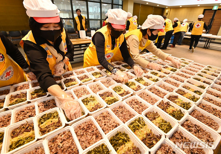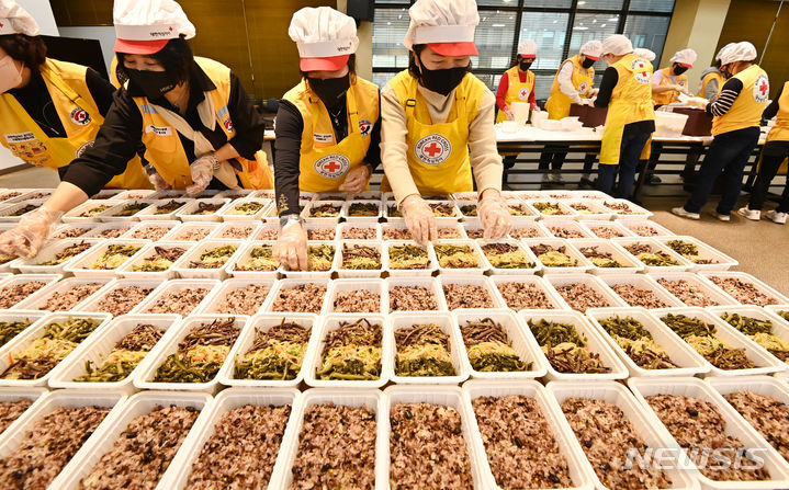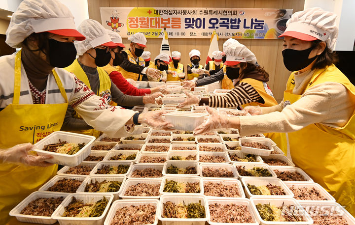 小正月(旧暦1月15日)を数日後に控えた20日、京畿道水原市勧善区の大韓赤十字社京畿道支社で関係者たちが、恵まれない人たちに届ける五穀ご飯やナムルなどを真心込めて準備した。