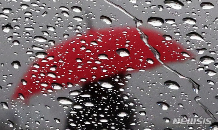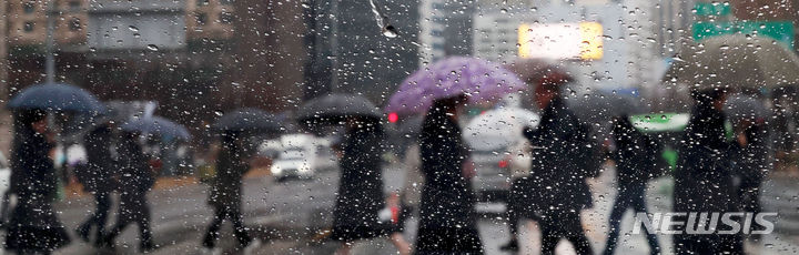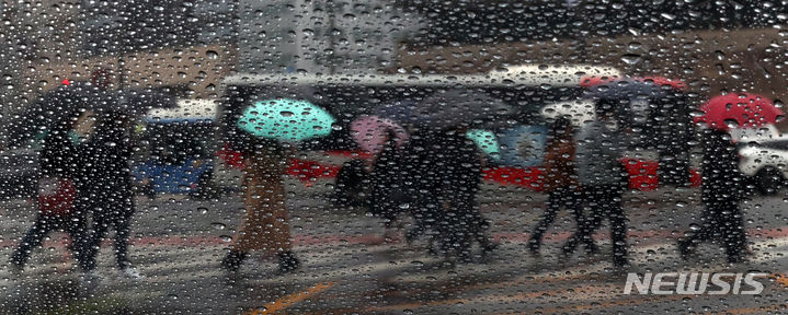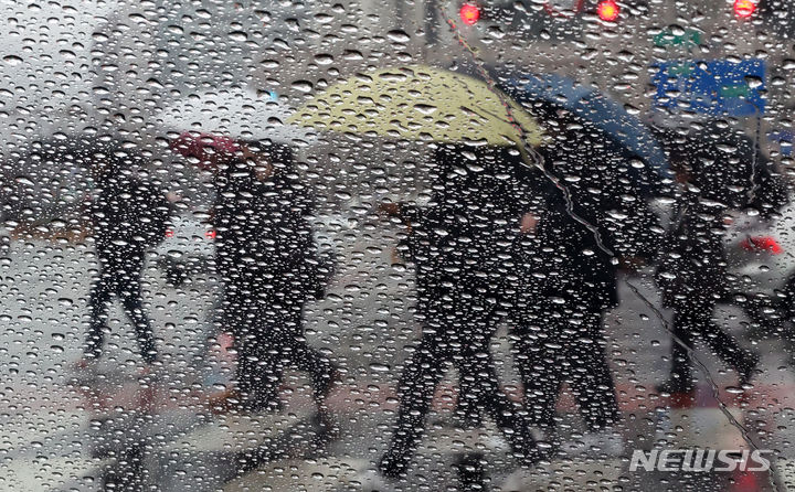 韓国の大半の地域が雲に覆われ雨が降った21日、ソウル市中区の市庁駅付近で、雨傘を差して道を急ぐ市民の様子。