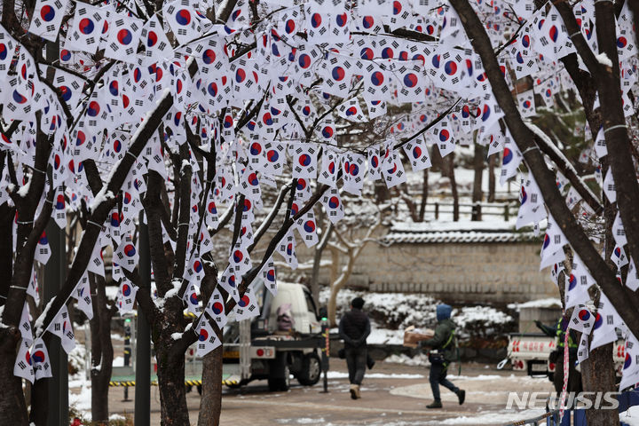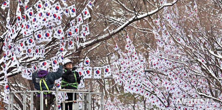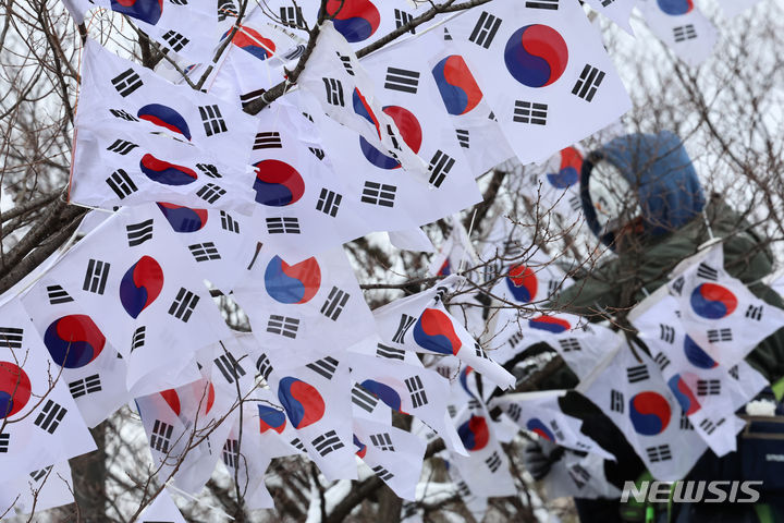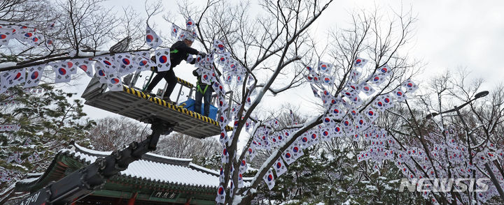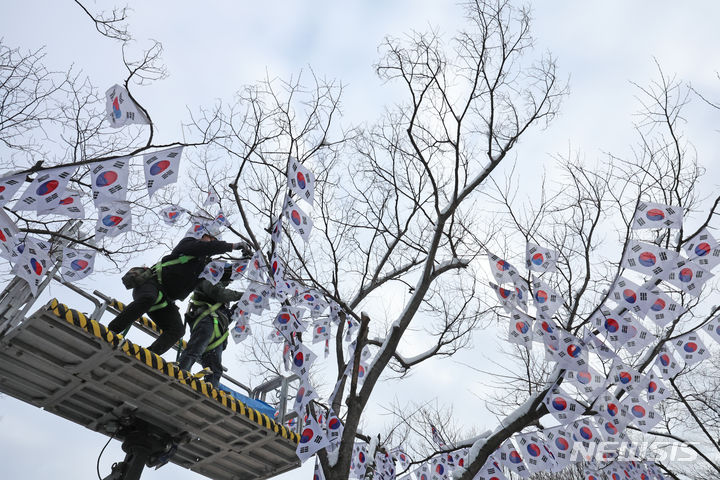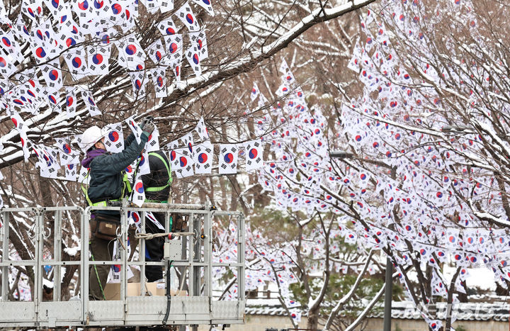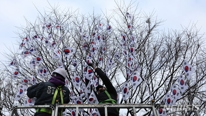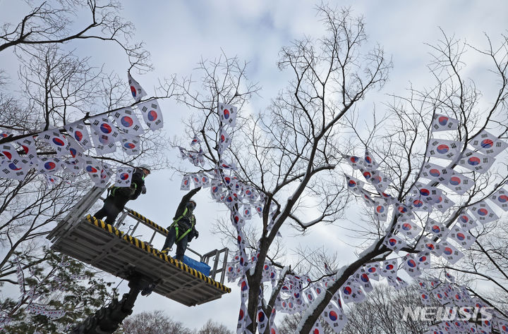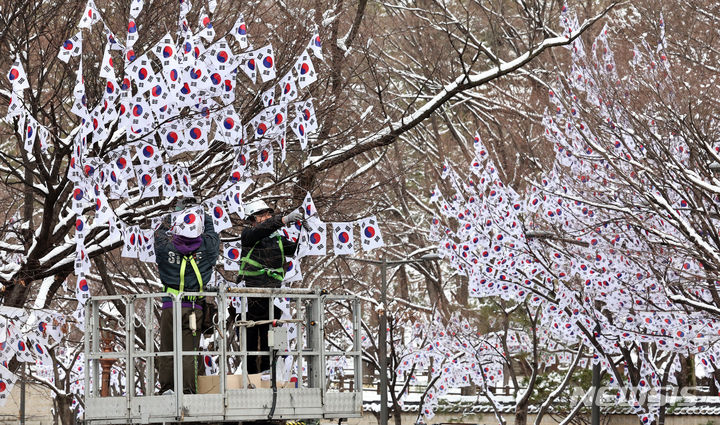23日午前、ソウル市竜山区の孝昌公園一帯で街路樹に太極旗(韓国の国旗)を掲揚する作業が行われた。竜山区は来月3日まで、孝昌公園一帯の710メートルの区間を「三一節(独立運動記念日、3月1日)記念太極旗通り」とする。