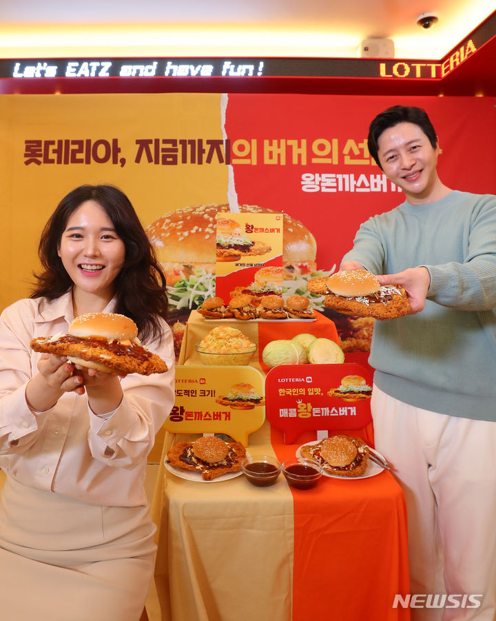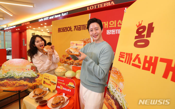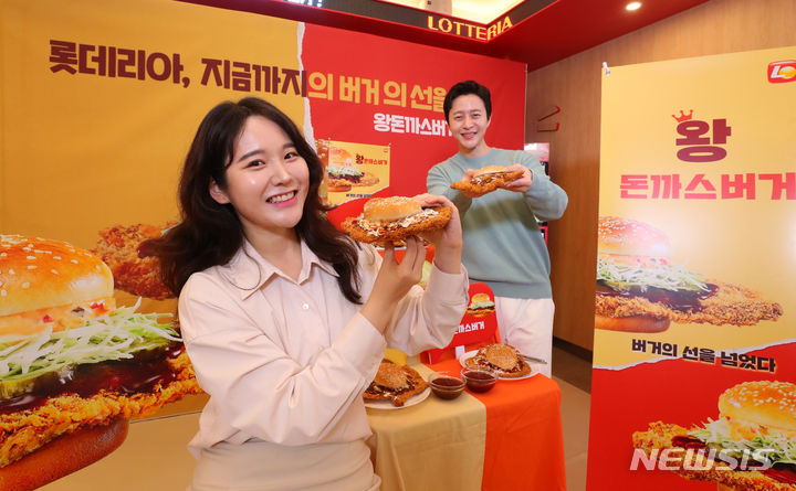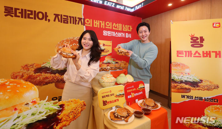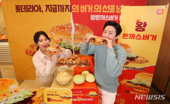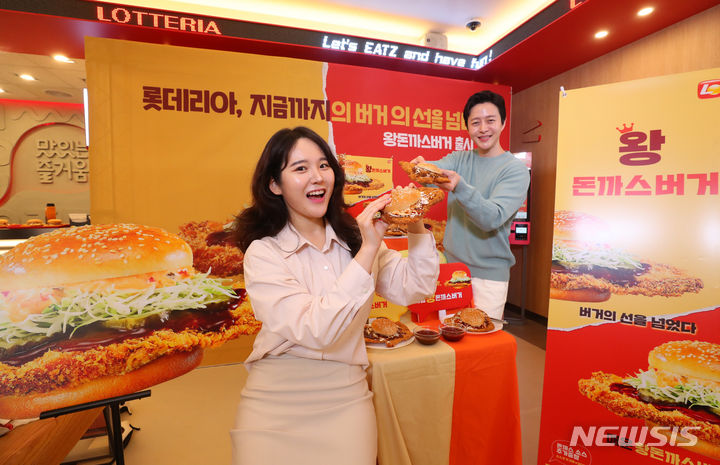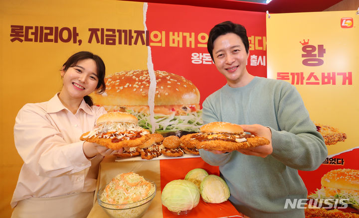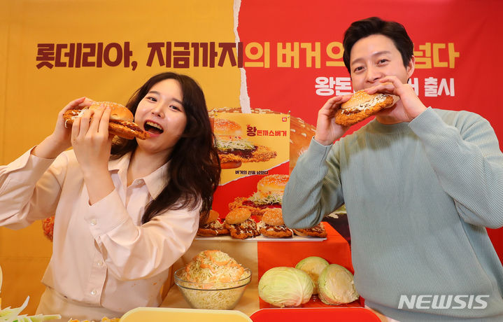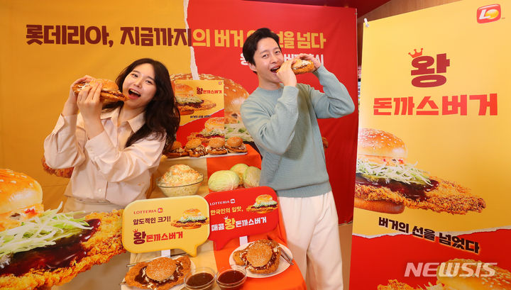 ロッテリアが29日午前、ソウル市東大門区のロッテリア東大門歴史文化公園店で開催した新商品発売記念イベントで、王とんかつバーガー2種を紹介した。