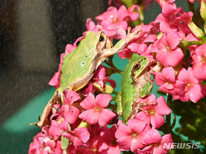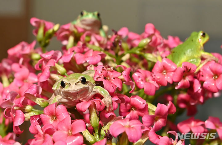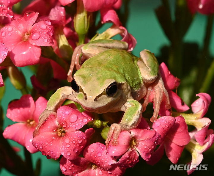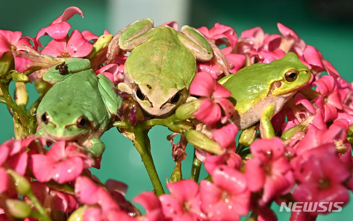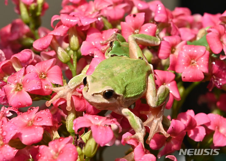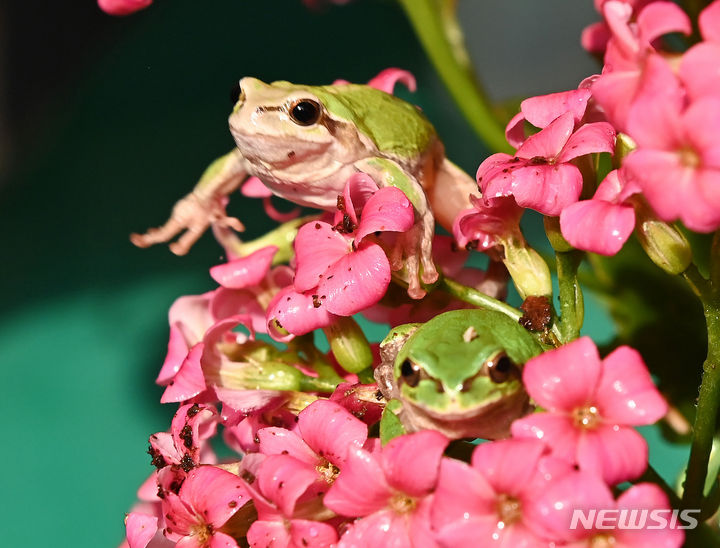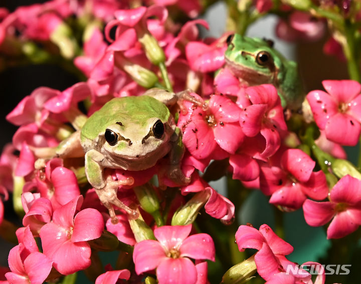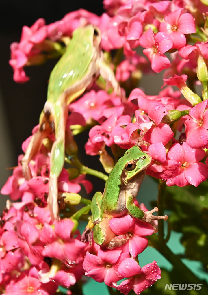 二十四節気の一つ「啓蟄」まであと一日と迫った4日、京畿道華城市機山洞の京畿道農業技術院昆虫資源センターでは、アオガエルがさわやかな春の花の上に座っていた。