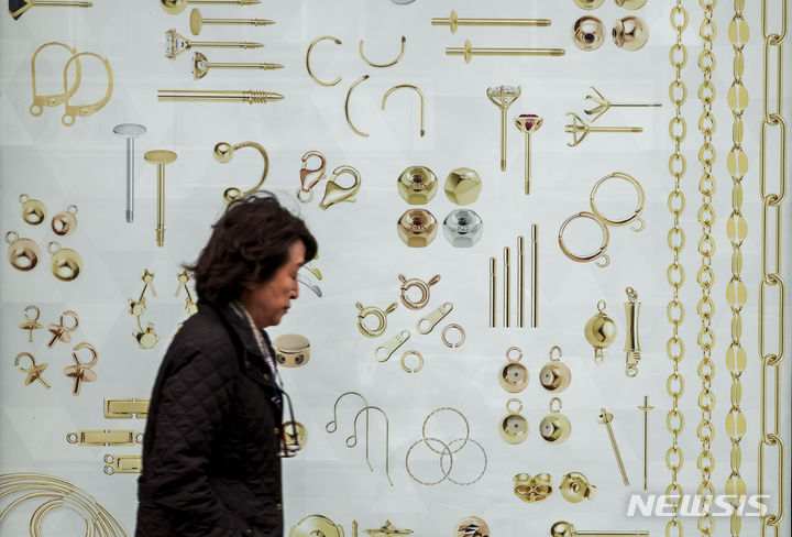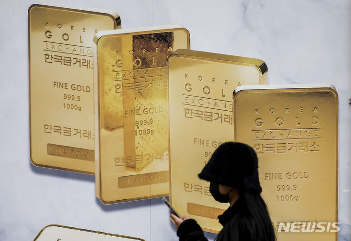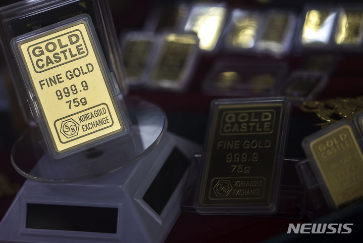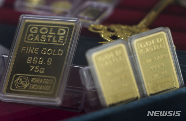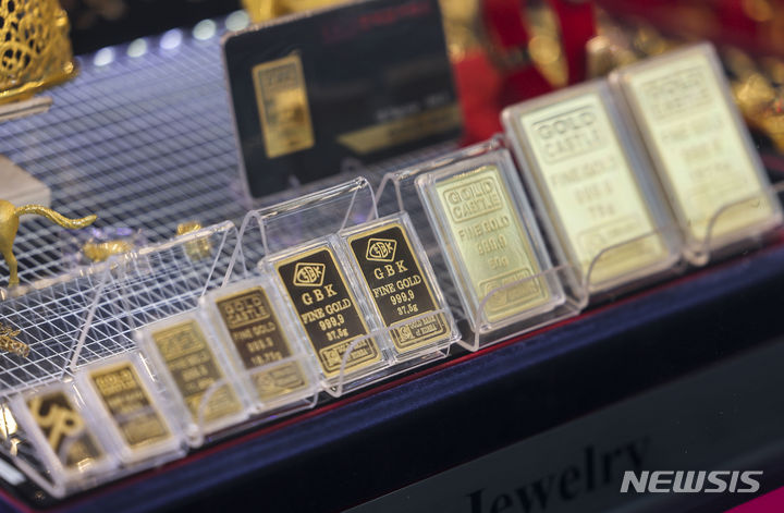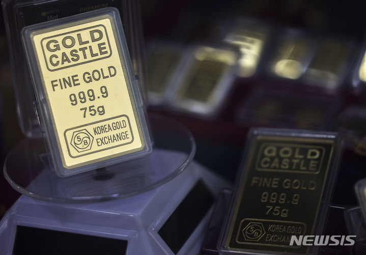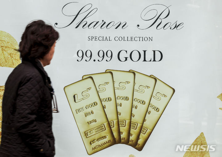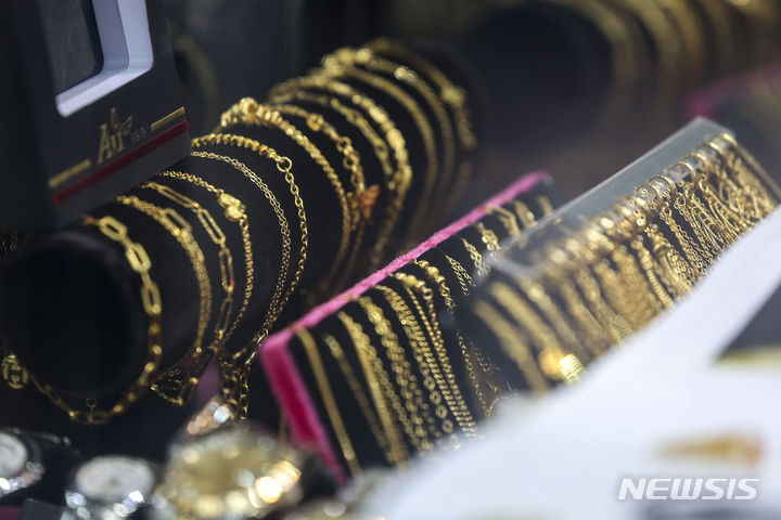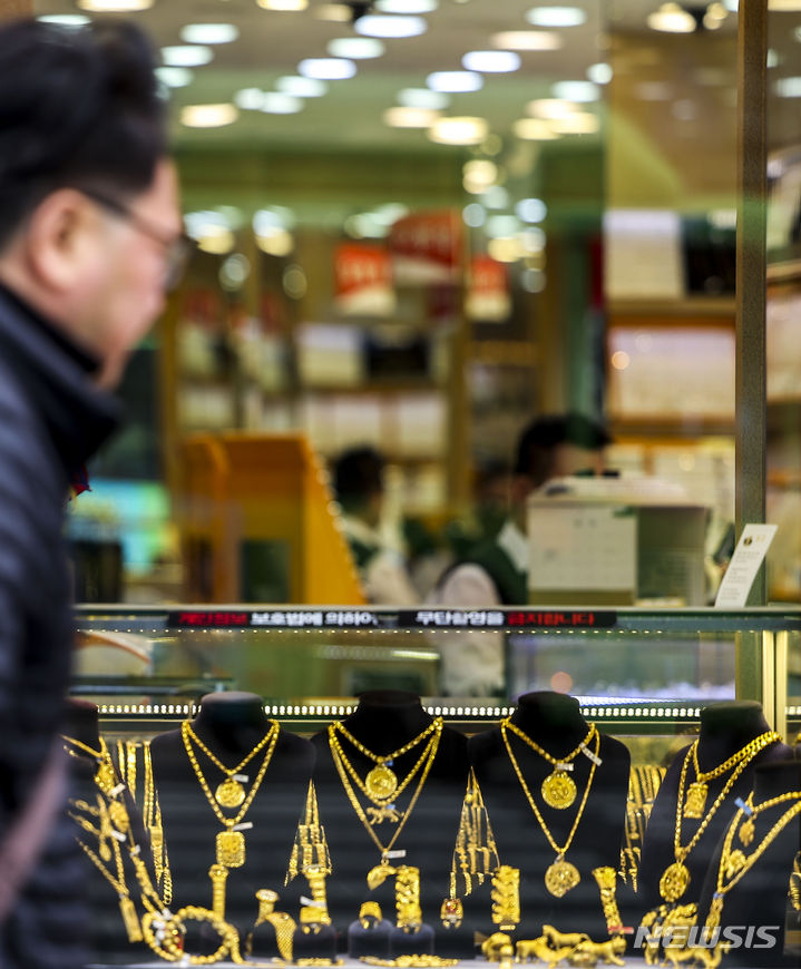 【NEWSIS】金の先物価格が市場最高値を更新した。米ニューヨーク商業取引所(COMEX)では4月物の金先物終値が前取引日比で1.5%上昇の1オンス=2126.30ドルに達し、初めて1オンス当たり2100ドルを超えた。金価格が市場最高値を更新したのは、昨年12月27日(1オンス=2093.10ドル)以来2カ月ぶりのことだ。写真は5日、ソウル市内の貴金属店に陳列されている金製品。