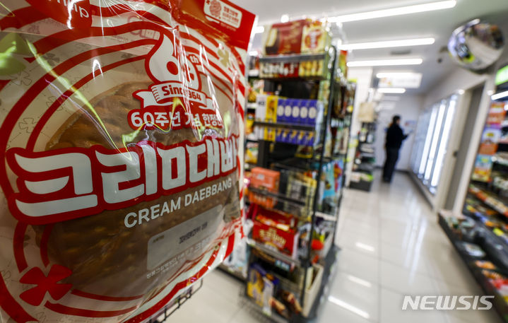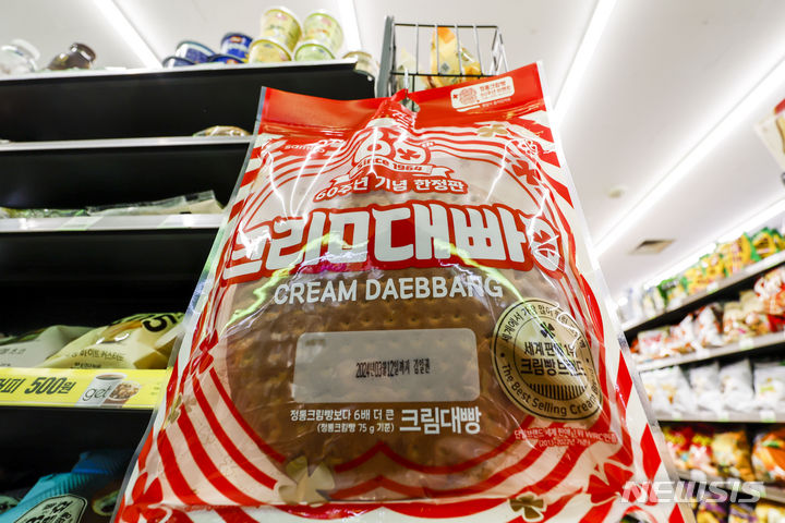 ソウル市内のコンビニエンスストアに5日、SPC三立のクリーム大パンが陳列されている様子。SPC三立が売り出したクリーム大パンは、1964年に発売された正統クリームパンが60周年を迎えるに当たり、既存の商品を6.6倍大きくした限定商品だ。クリーム大パンをめぐっては、発売後ソーシャル・ネットワーキング・サービス(SNS)を通じて「クリーム大パン・チャレンジ認証」で話題を呼んだ。一部コンビニエンスストアでは二日に1個ずつ供給されるほど人気を集めている。