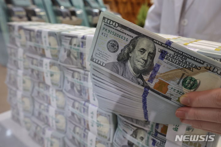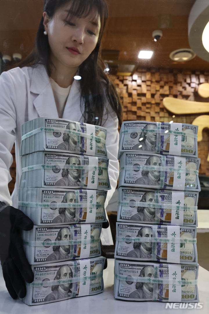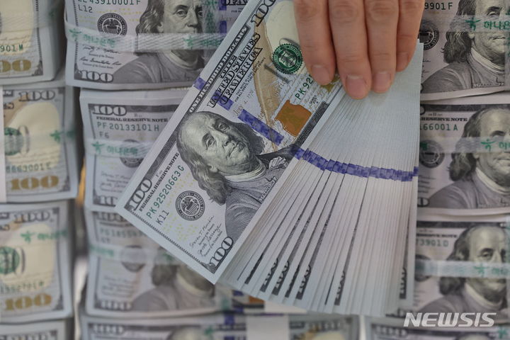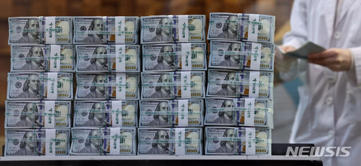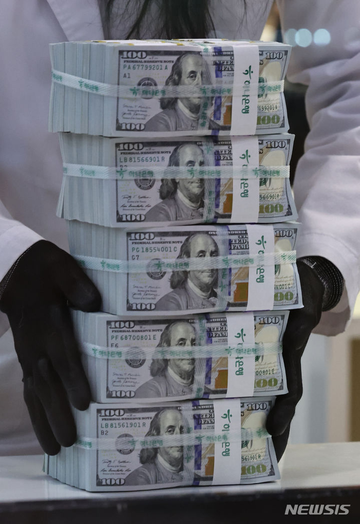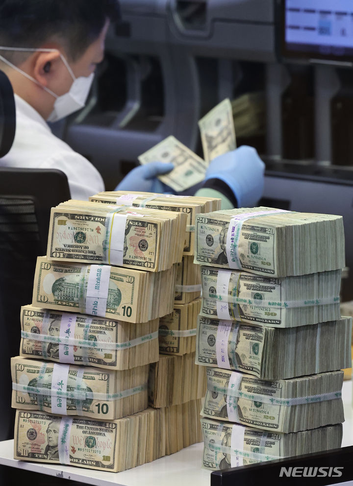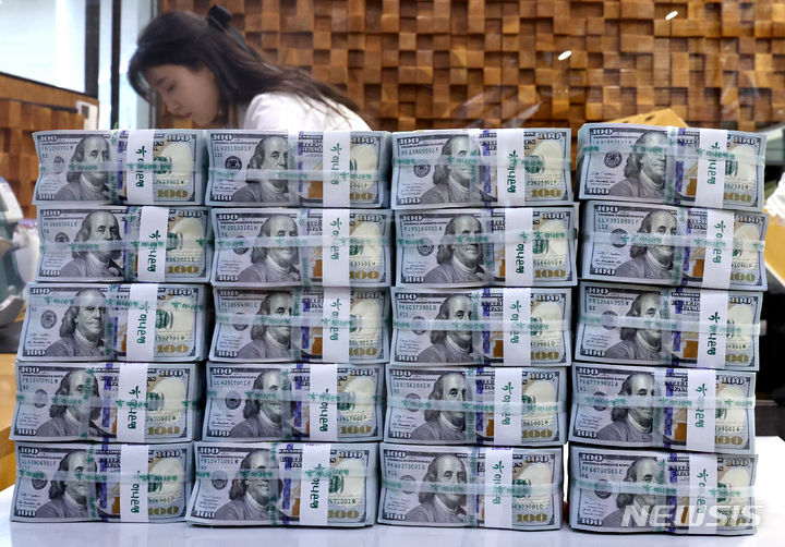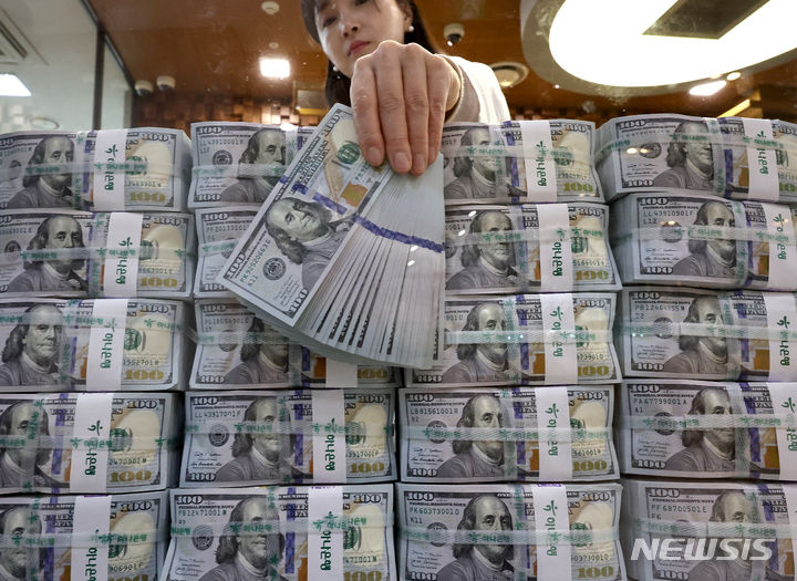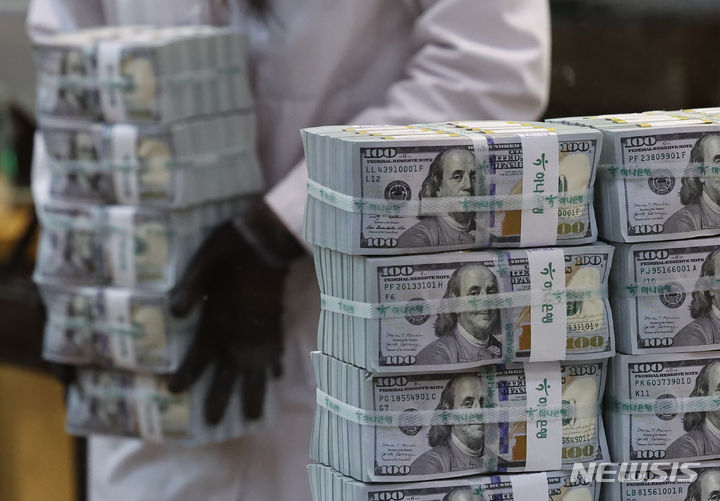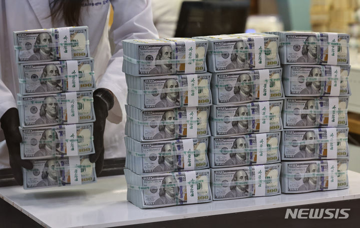 6日午前、ソウル市中区のハナ銀行偽変造対応センターで、行員がドル紙幣を検収している様子。ドル高に伴って他の通貨の外貨資産額換算額が減少し、韓国の外国為替保有額は2カ月連続で下落した。韓国銀行が6日に発表した「2024年2月末外国為替保有額」によると、2月末現在で韓国の外国為替保有額は4157億3000万ドルで、前月末(4157億6000万ドル)より3000万ドル減った。