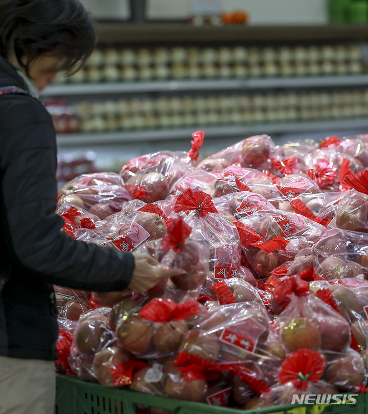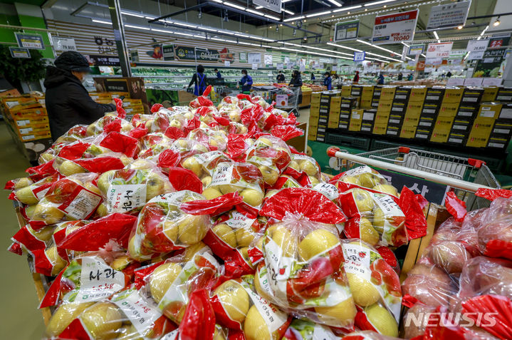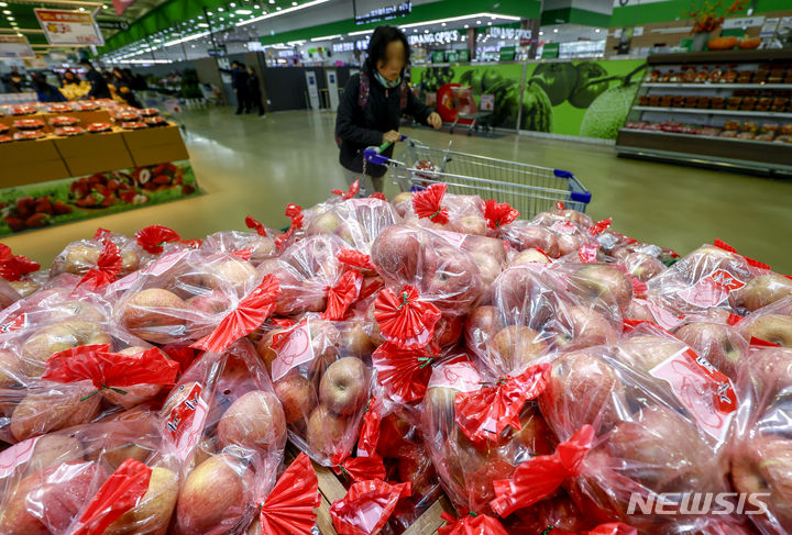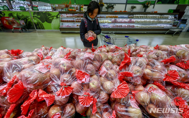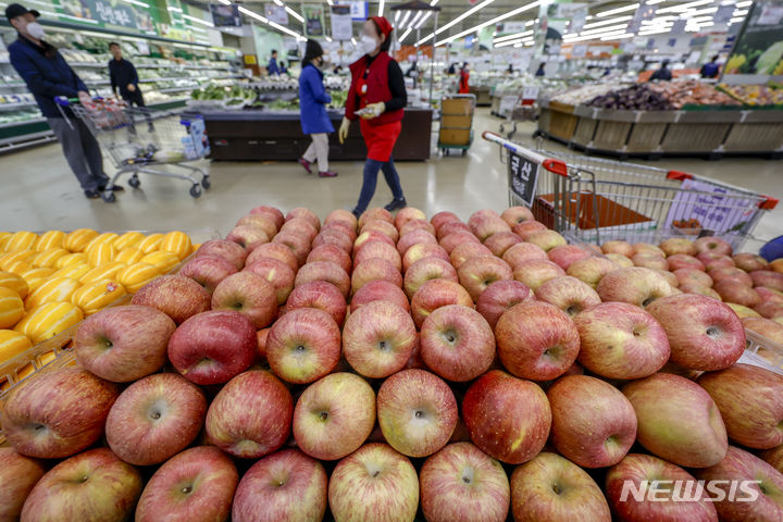 【NEWSIS】先月の果物価格が41.2%上昇し、1991年9月の43.9%以来、32年5カ月ぶりの高騰となった。中でもリンゴ(71.0%)やミカン(78.1%)などの上昇傾向が著しい。農産物が全体的な物価上昇に影響した程度は0.80ポイントで、今年2月の消費者物価は再び3%台(3.1%)に上昇する要因となった。写真は今月7日、ソウル市内の大型スーパーでリンゴを手に取る買い物客。