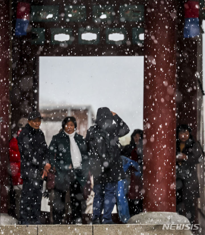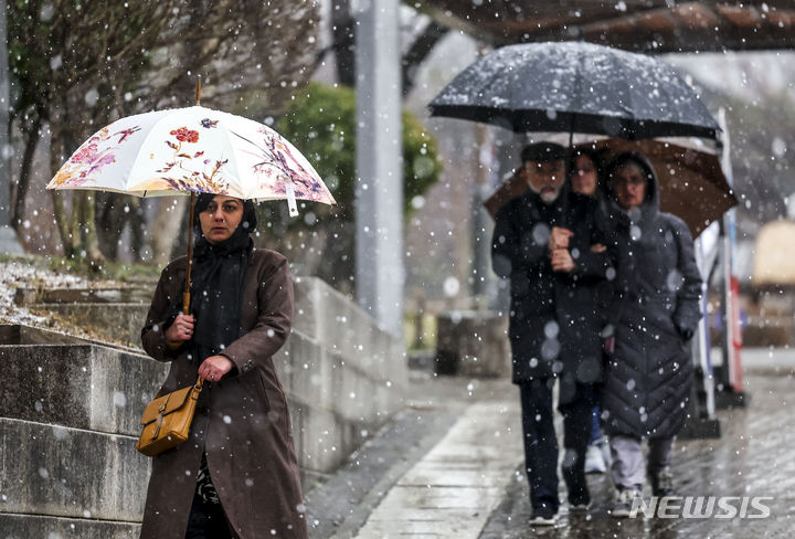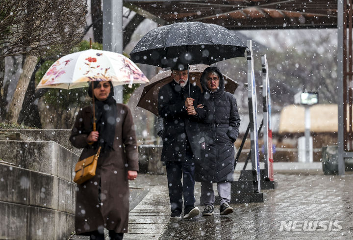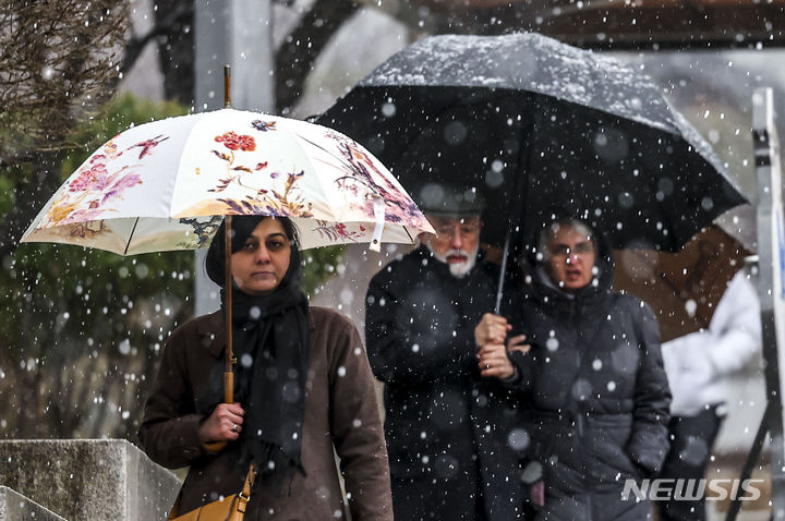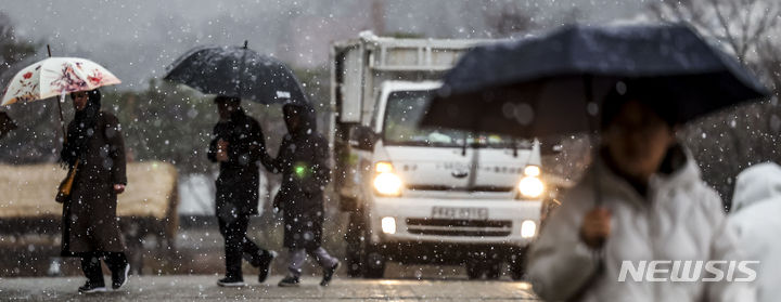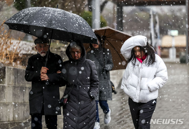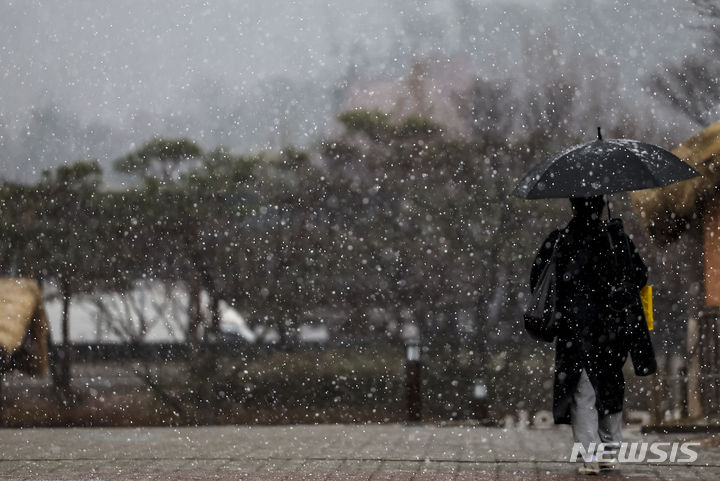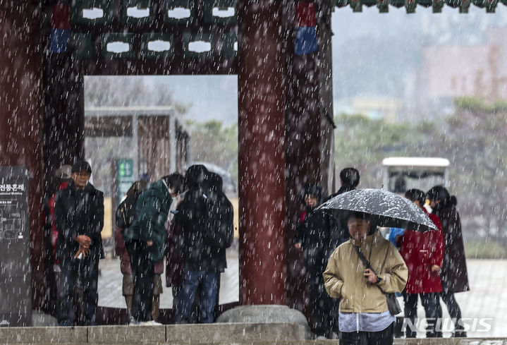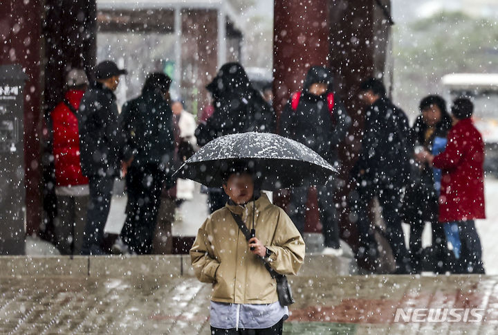 7日、急に降り始めたみぞれに見舞われる南山コル韓屋村(ソウル市中区)の様子。