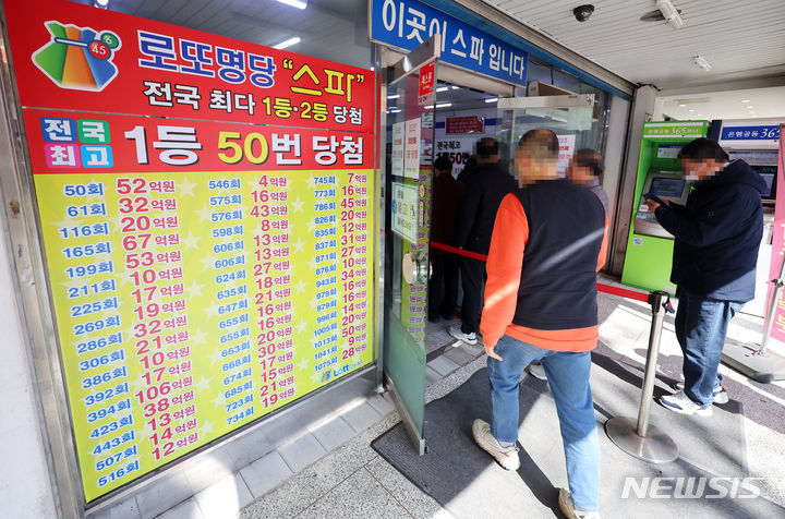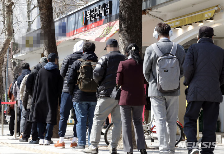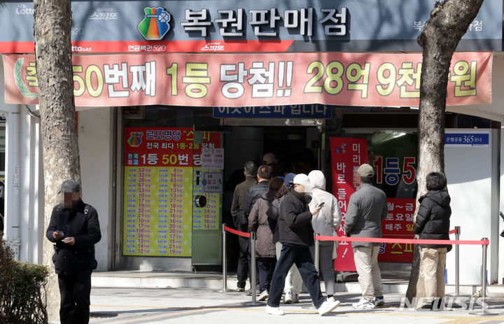 8日、ソウル市内のある宝くじ売り場で、列を作って宝くじの購入を待つ人々の様子。