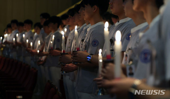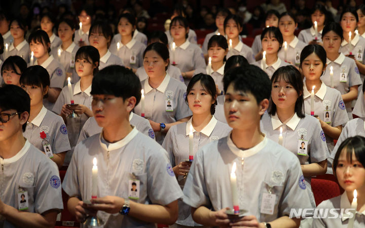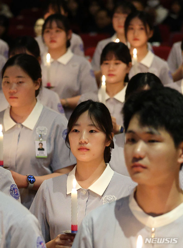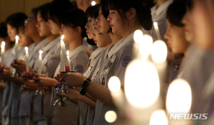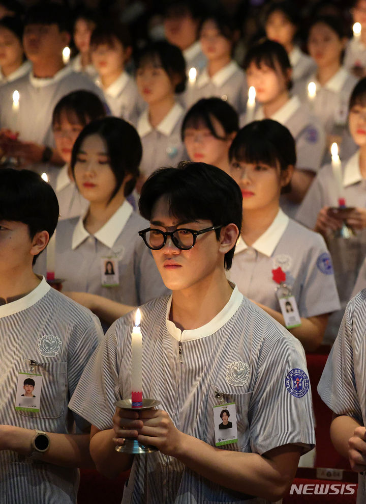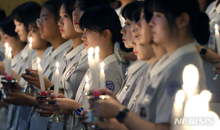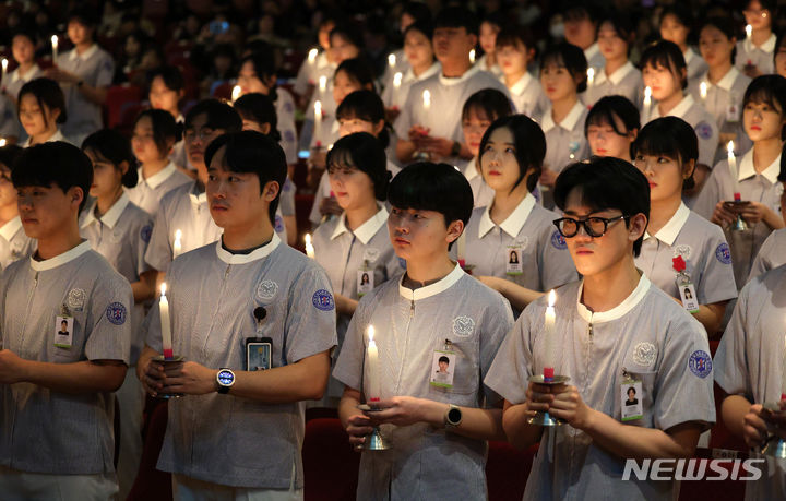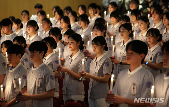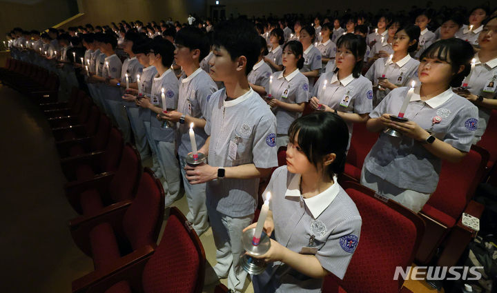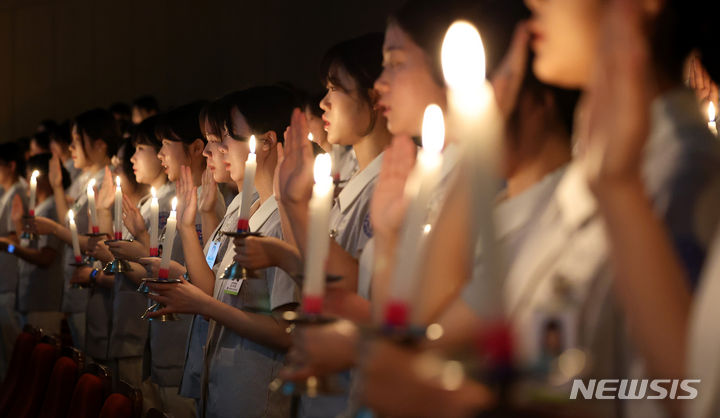 啓明大学看護学部(大邱市達西区)のジョンソンホールで開かれた「2024年度ナイチンゲール宣誓式」で、看護学部の学生らがろうそくを持ち、ナイチンゲールの崇高な犠牲精神を手本として専門看護者として最善を尽くすことを誓っている。