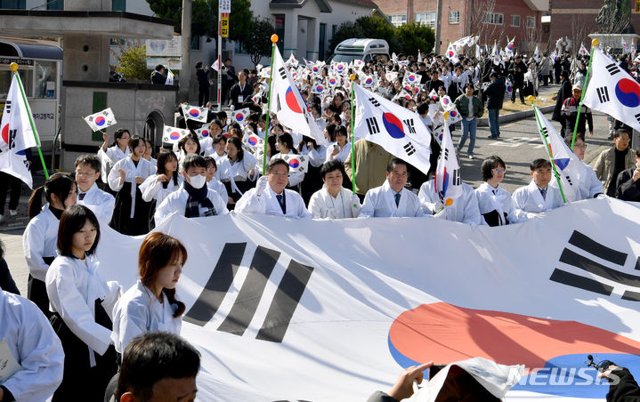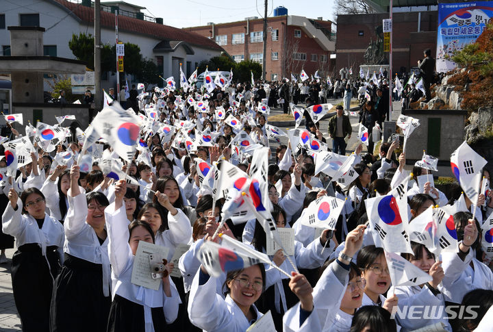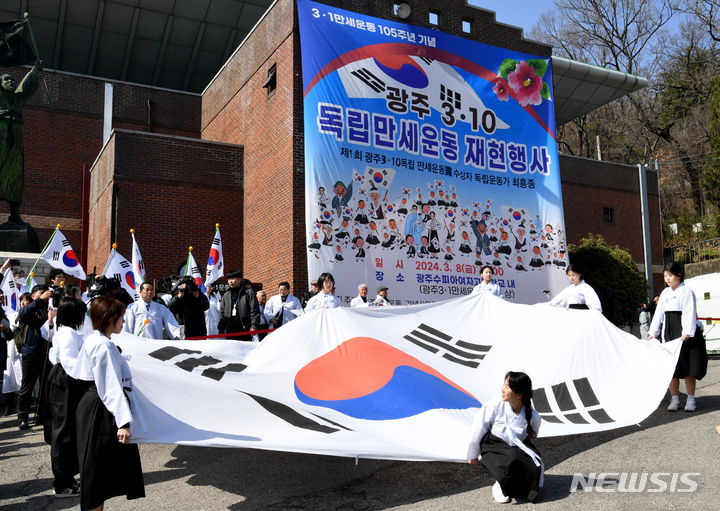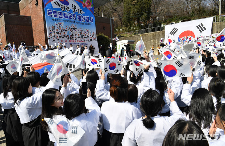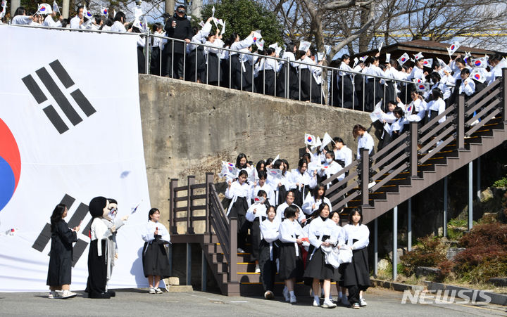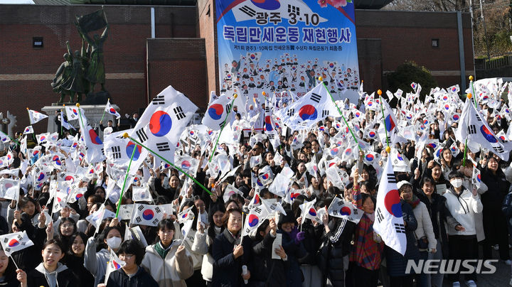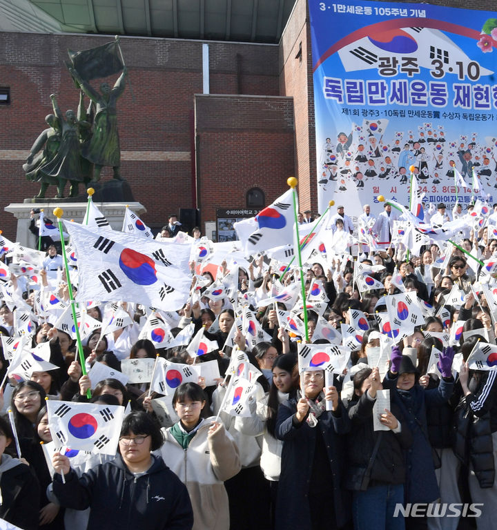 光州市南区の須皮亜女子高の校庭で8日午後、生徒たちが、105年前に行なわれた光州3・10万歳運動を再現している様子。