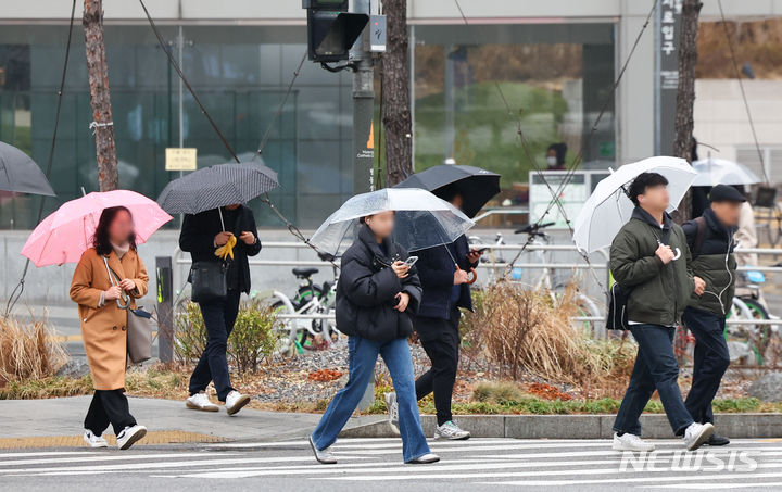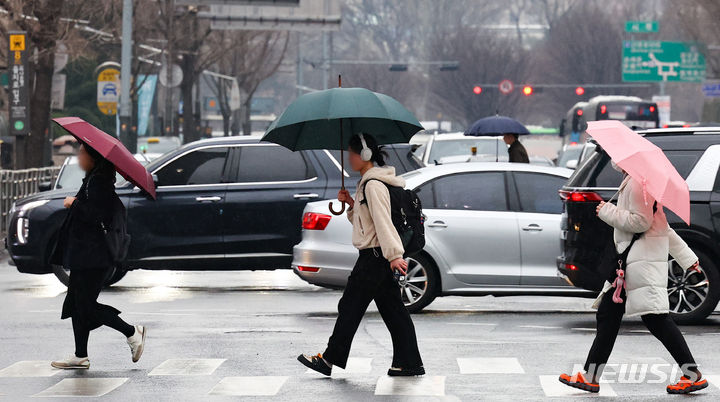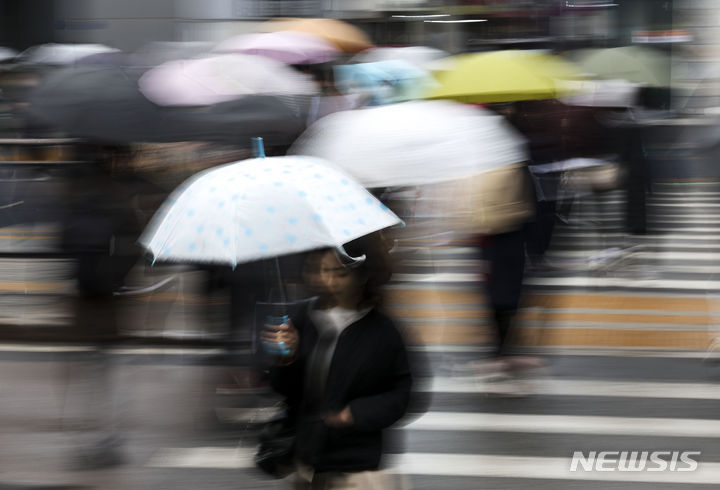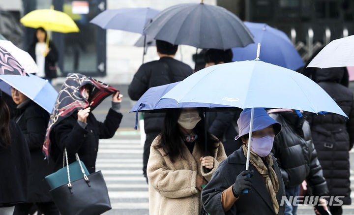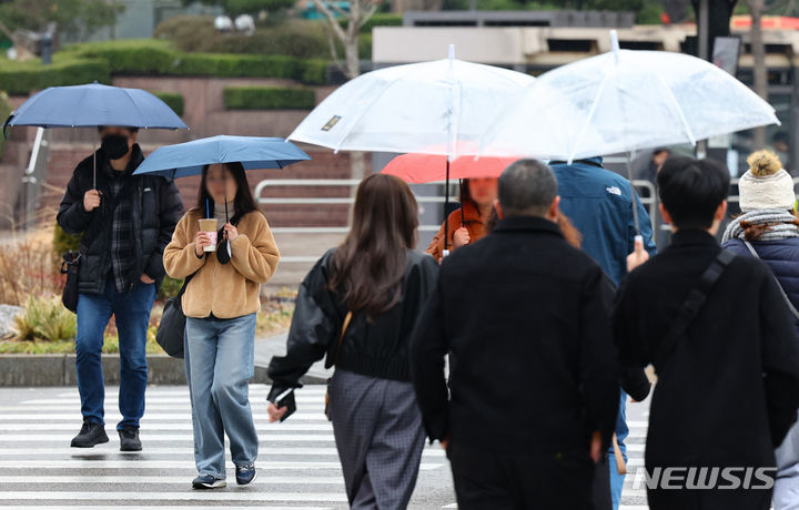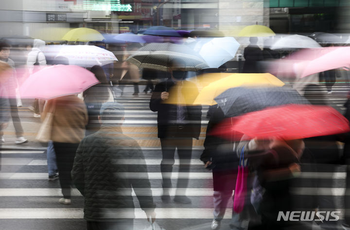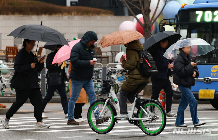 雨が降っている12日午前、ソウル市中区の乙支路では傘をさして歩く市民の姿が見られた。