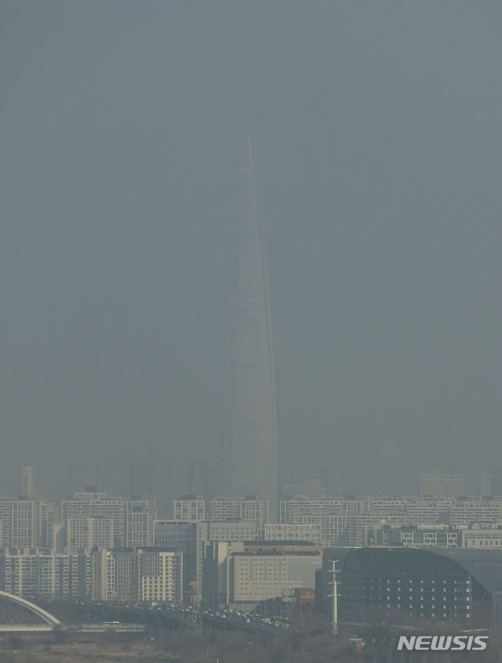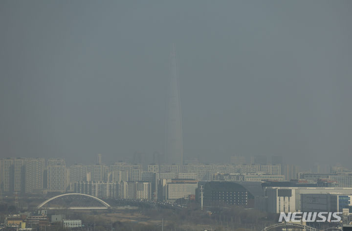【NEWSIS】首都圏の微小粒子状物質(PM2.5)濃度が高い水準となった14日、ソウル中心部で、建物などがかすんでいる様子。