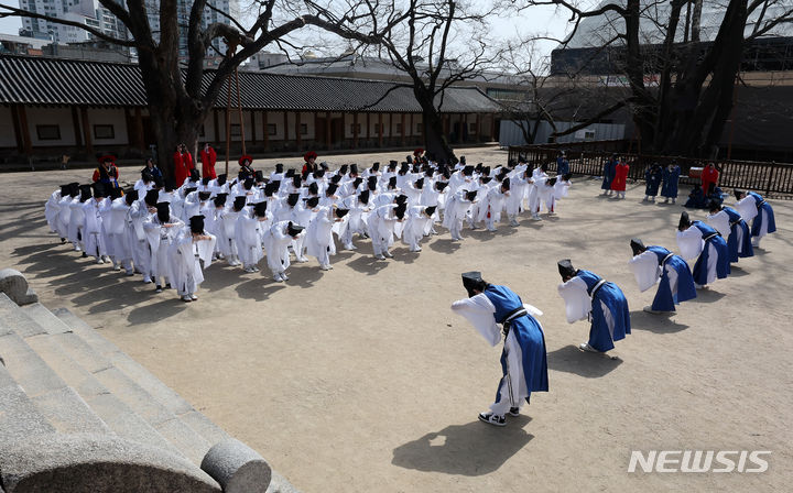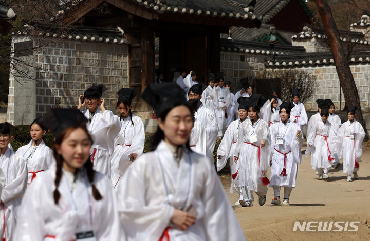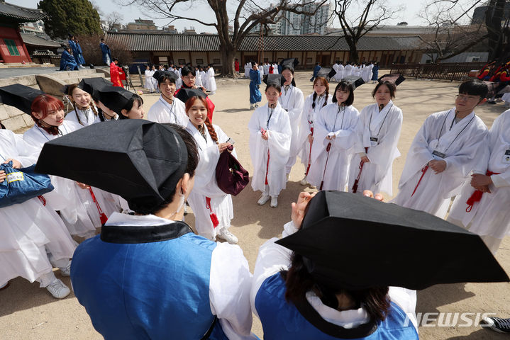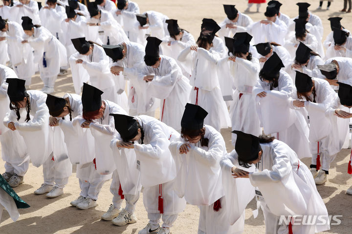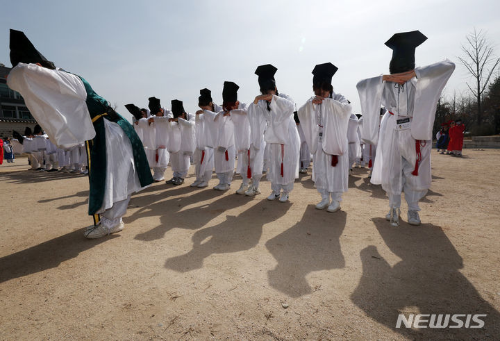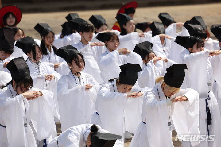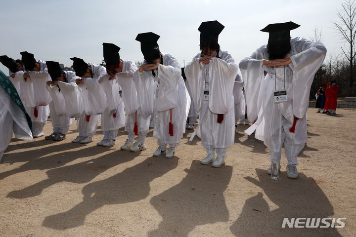 【NEWSIS】17日午前、ソウル市鍾路区の成均館大学で、新入生歓迎会「新榜礼」が行われた。写真は、孔子をはじめとする儒教の聖賢たちにあいさつをする儀式「謁廟」をする成均館大学の新入生たち。新榜礼は朝鮮時代に科挙に合格した儒生(儒学を学ぶ者)のための歓迎式で、先輩たちが新しく入った儒生を対象に行う一種の通過儀礼だ。