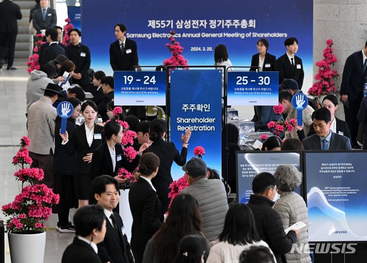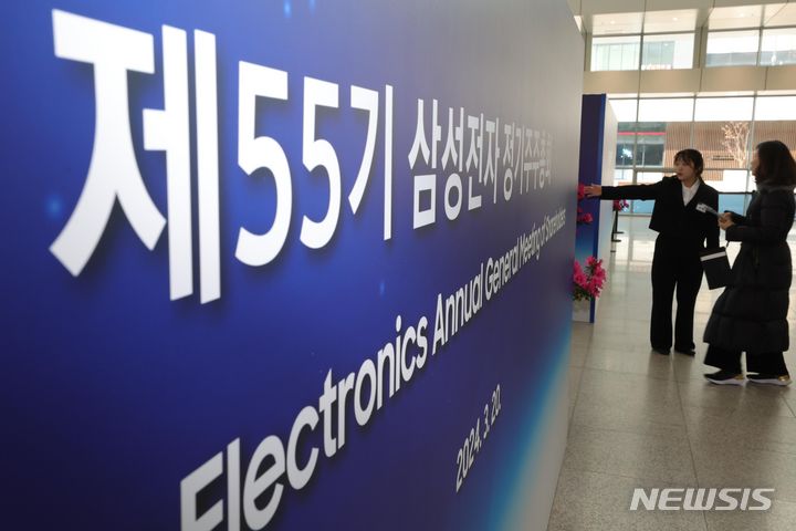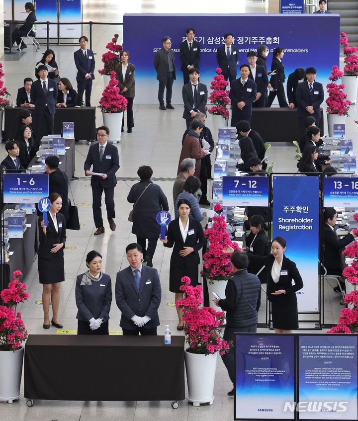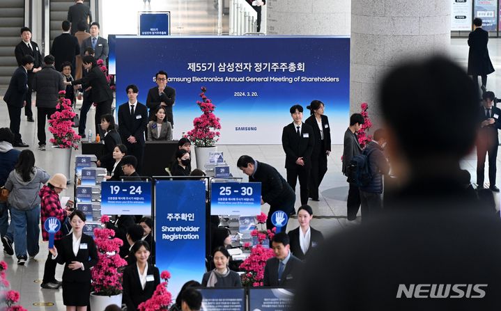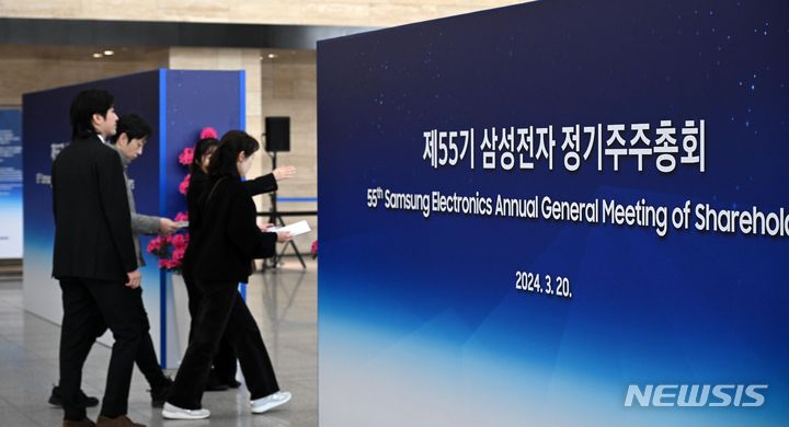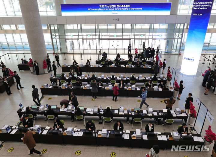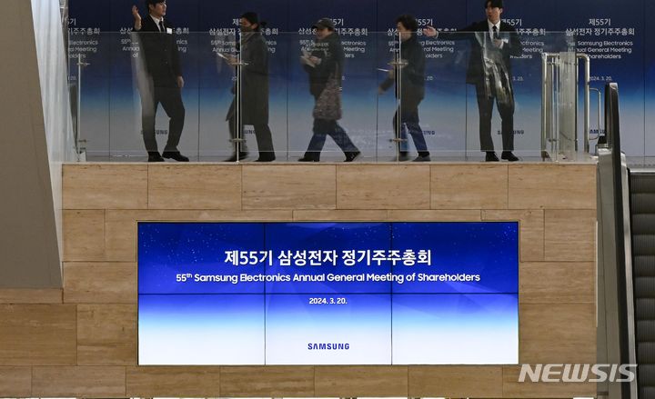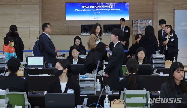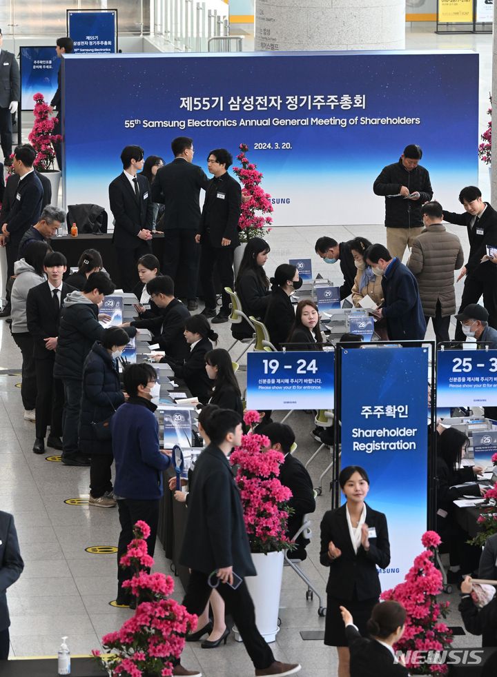 【NEWSIS】20日午前、京畿道水原市の水原コンベンションセンターで、サムスン電子の第55期定時株主総会が開催された。