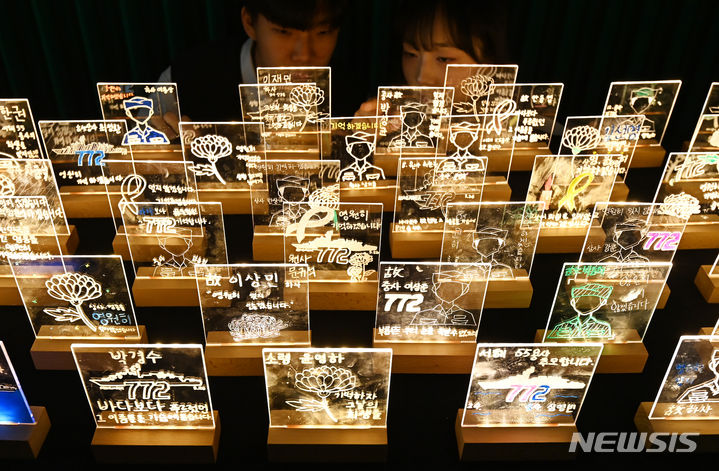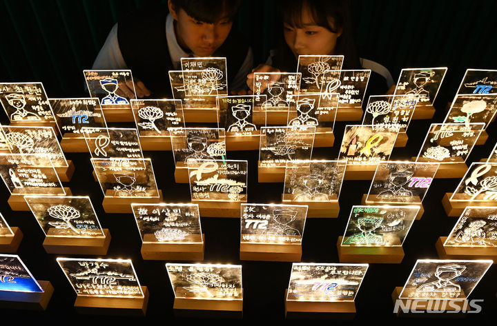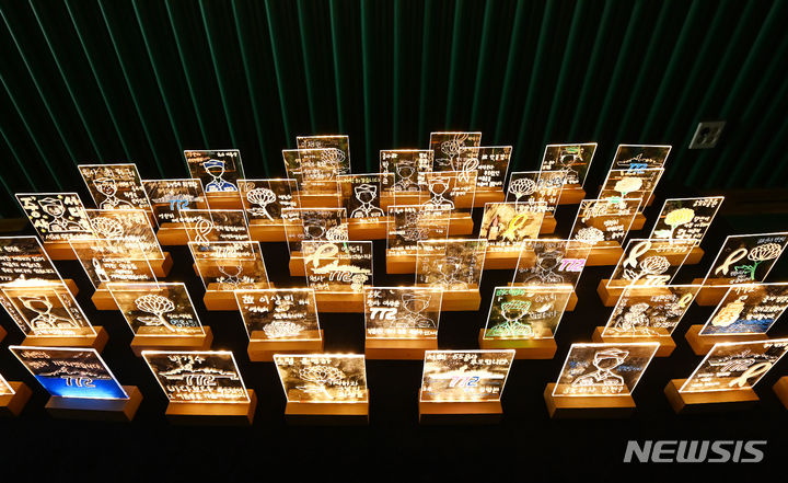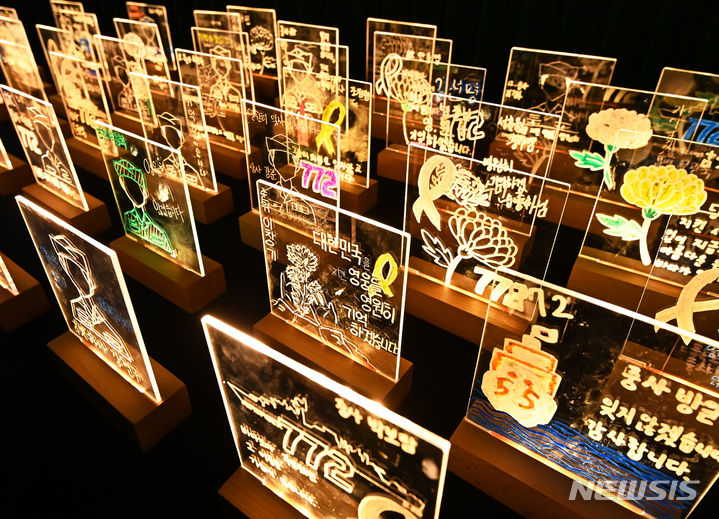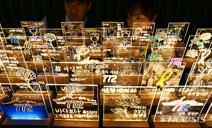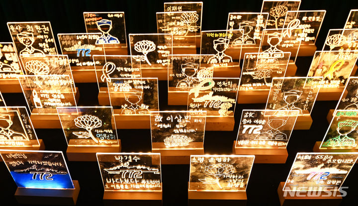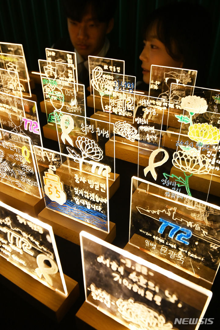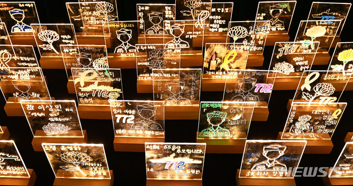 「第9回西海守護の日」に当たる22日、哨戒艦「天安」爆沈事件で戦死した故パク・ギョンス上士(曹長に相当)の母校、三一工業高校(京畿道水原市)に、生徒たちが追悼の気持ちを込めて作った光のアートフレームが並べてある様子。西海守護の日は毎年3月第4週の金曜日で、第2延坪海戦・哨戒艦「天安」爆沈事件・延坪島砲撃挑発で犠牲になった西海守護55勇士をたたえる日だ。