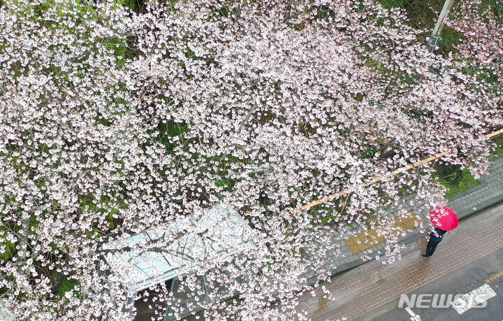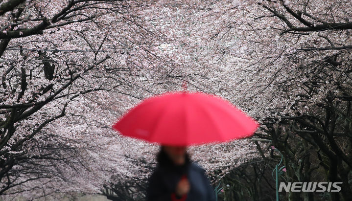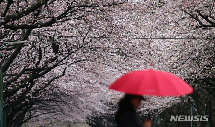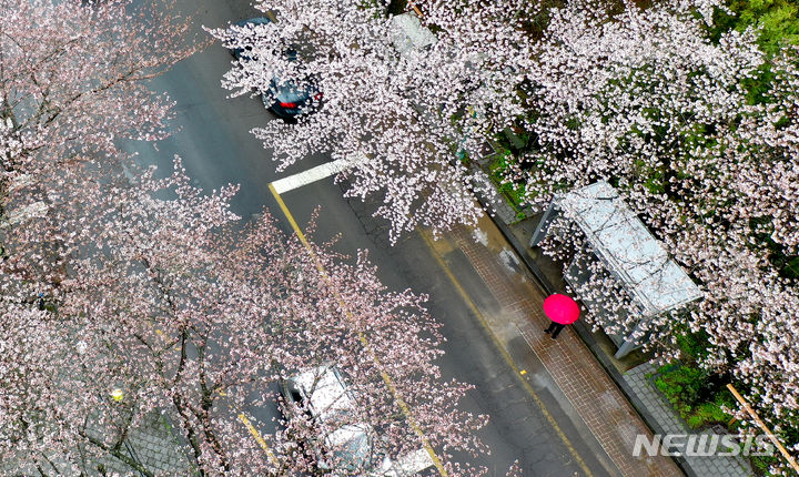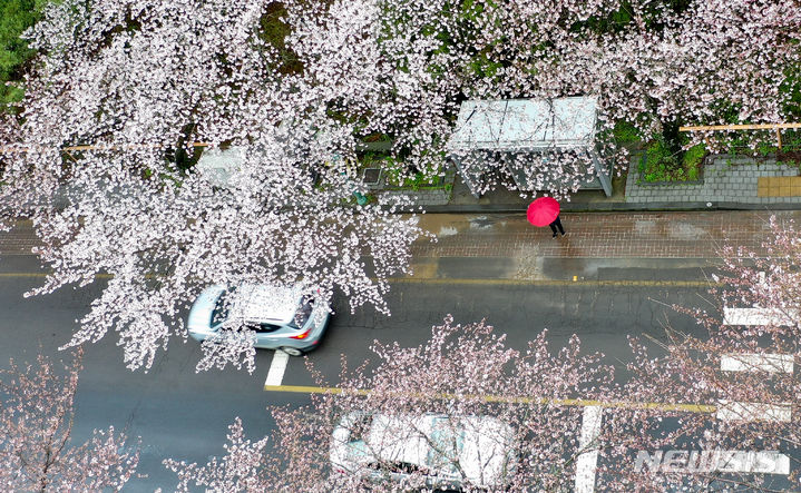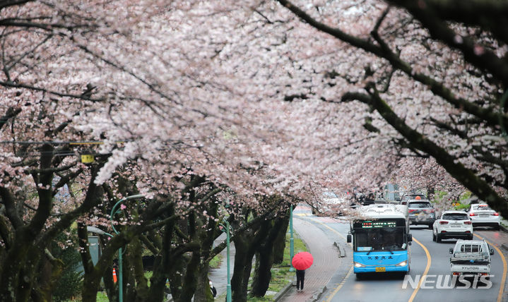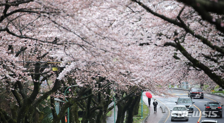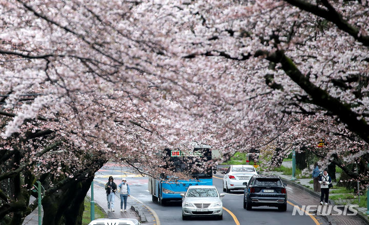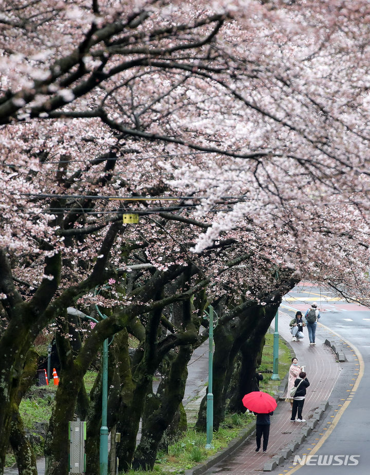 曇り空の一日となった24日午後、済州道を代表する桜の名所である済州大学前の並木道では、花見客の姿が見られた。