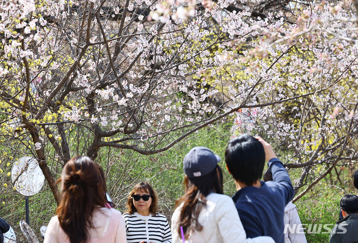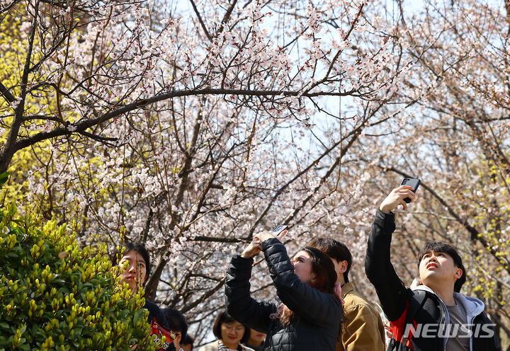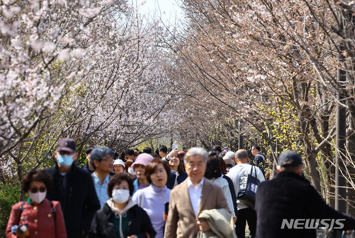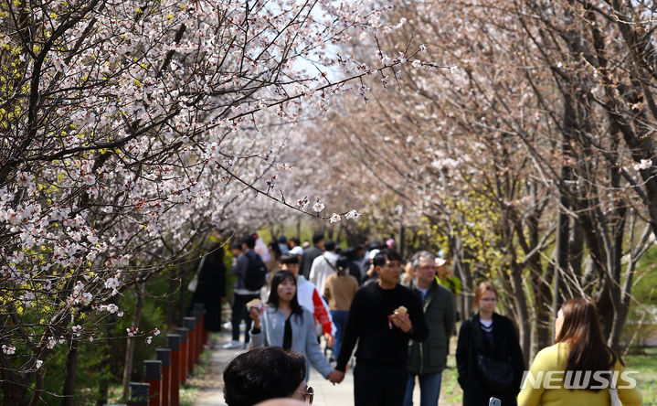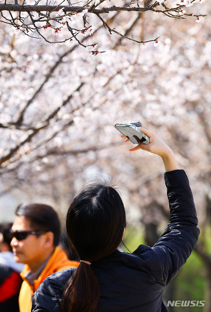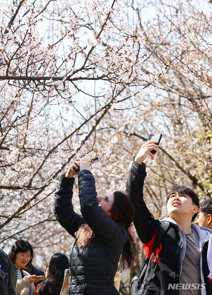 【NEWSIS】3月31日午後、「永登浦・汝矣島 春の花祭り」が開催されているソウル・汝矣島の輪中路近くで、桜の花を楽しむ人々。