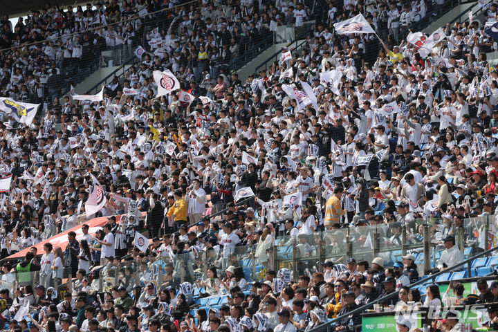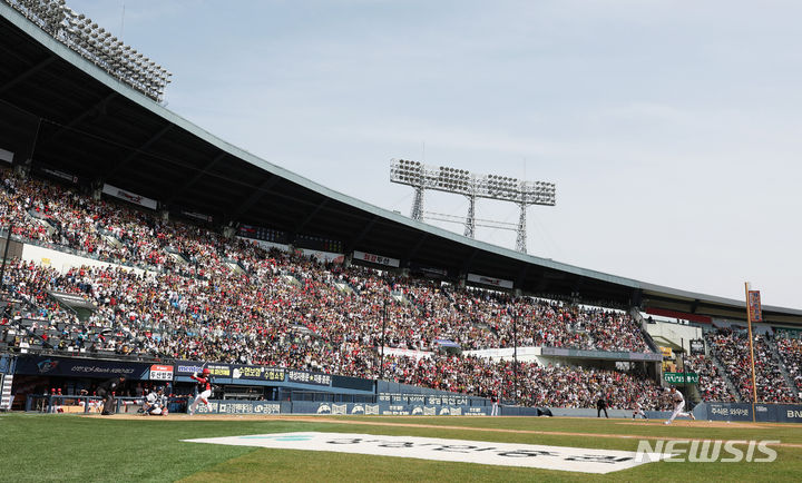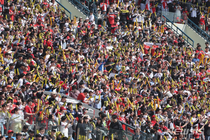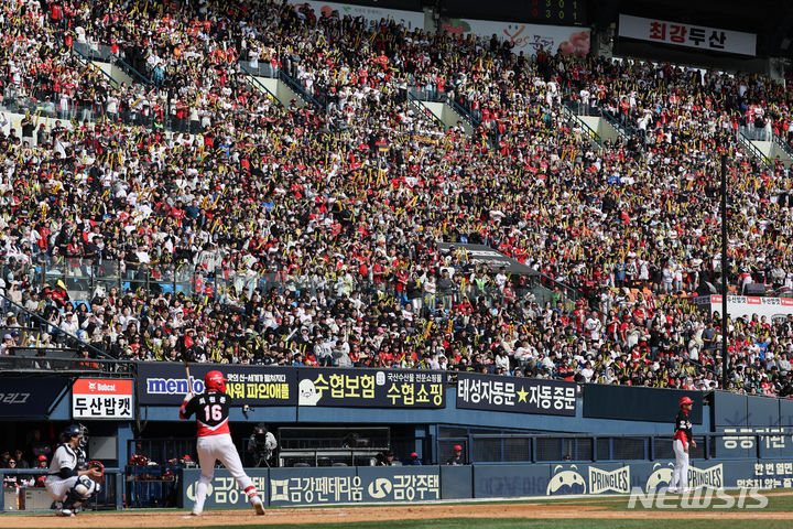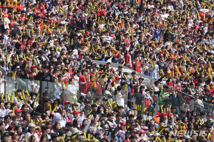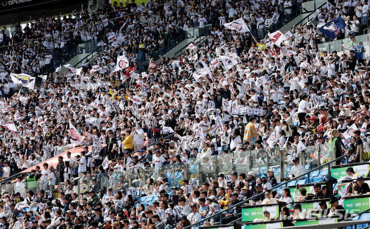 【NEWSIS】3月31日午後、ソウル・蚕室スタジアムで、「2024新韓銀行SOL KBOリーグ」起亜タイガース対斗山ベアーズの試合が行われた。写真はスタンドで応援するファンたち。