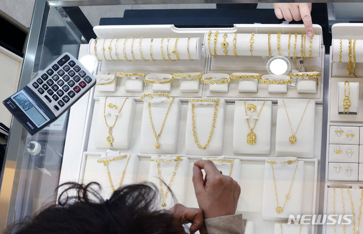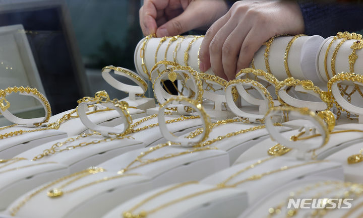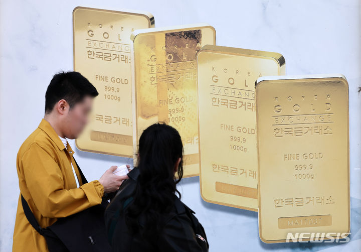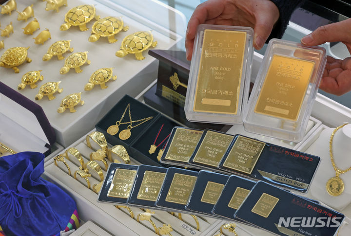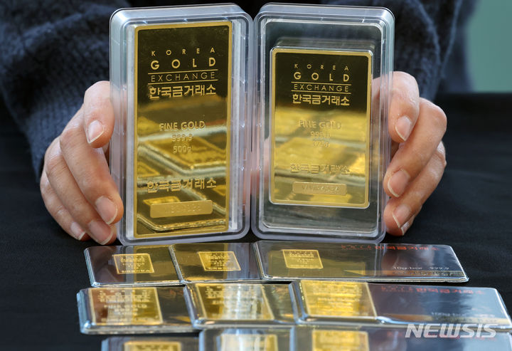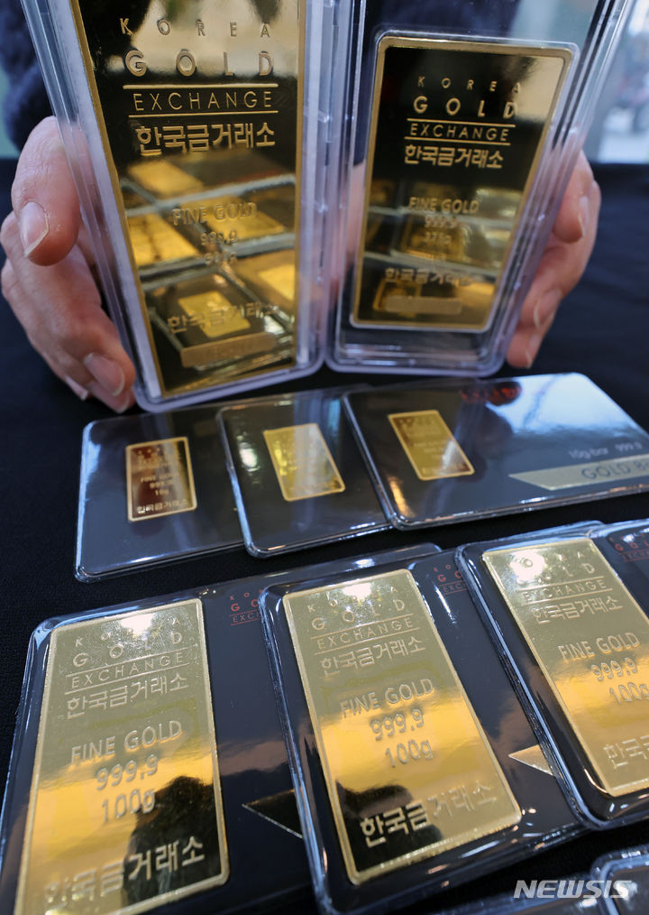 金1匁(3.75グラム)が40万ウォン(約4万4900円)を突破するなど金の価格の上昇傾向が続いている1日午後、ソウル市鍾路区の韓国金取引所で、職員がゴールドバーを陳列しているところ。