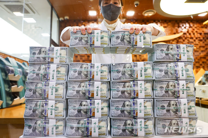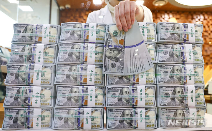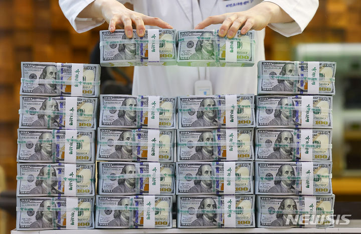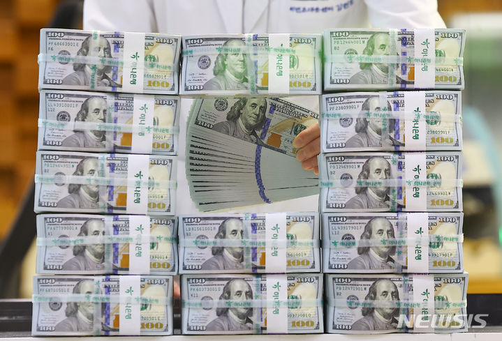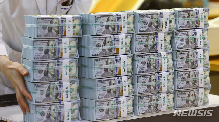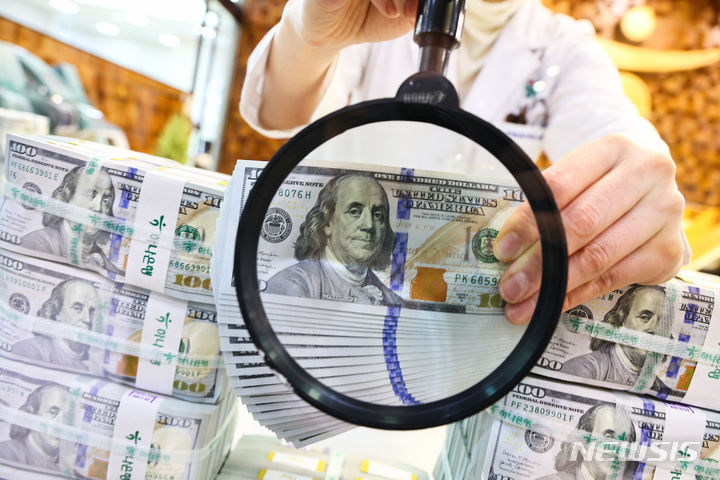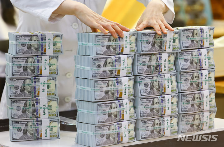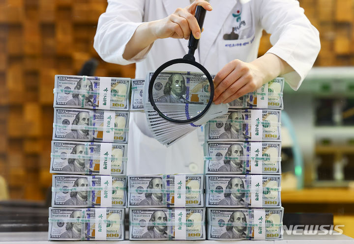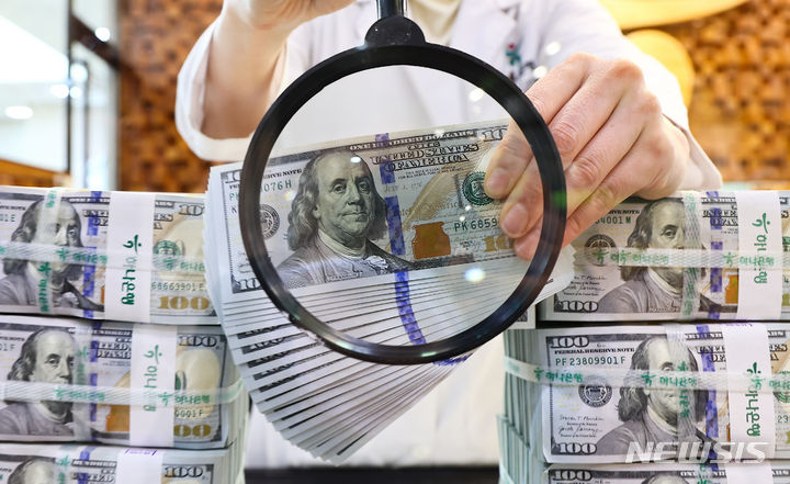 ソウル市中区のハナ銀行偽変造対応センターで3日、行員がドル紙幣を手にしている様子。韓国銀行は、2024年3月末の外貨準備高は4192億5000万ドルで、前月末(4157億3000万ドル)に比べ35億1000万ドル増えたと発表した。