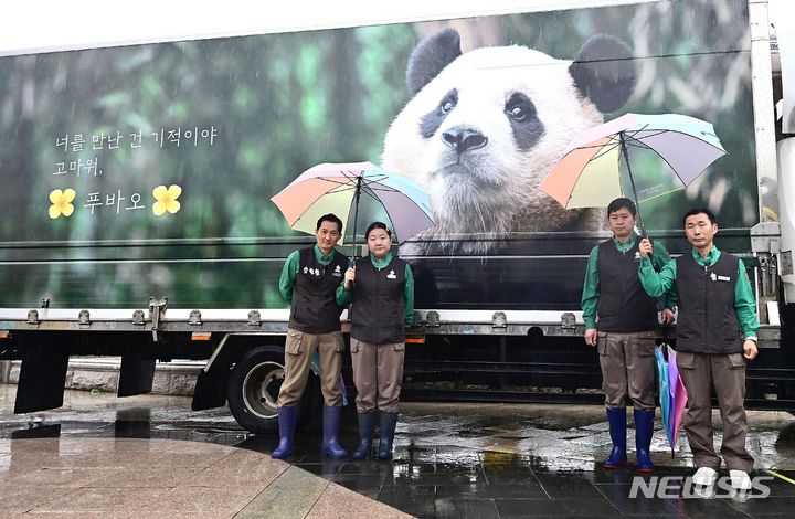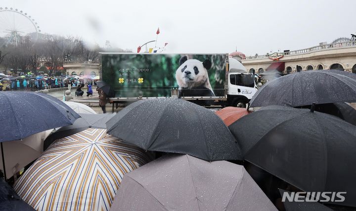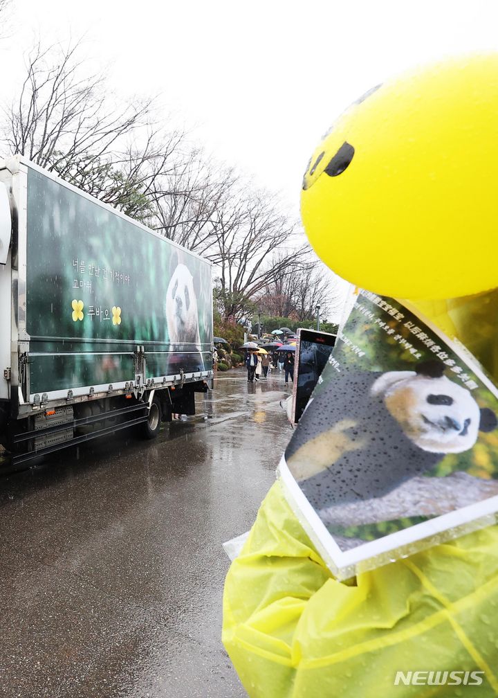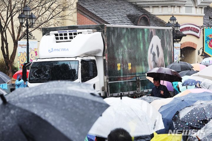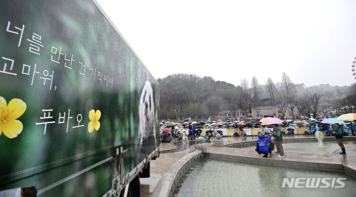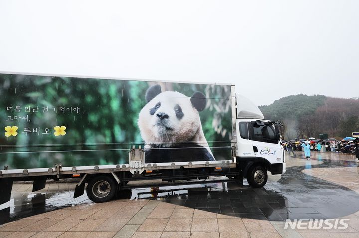 京畿道竜仁市のエバーランドで3日午前、中国に向かうパンダ「プーバオ(福宝)」を乗せた特殊車両を市民たちが見送った。