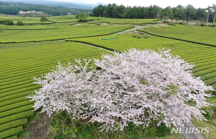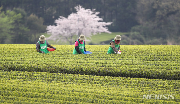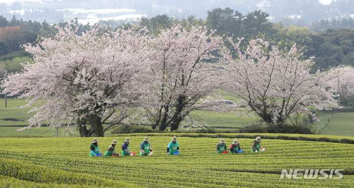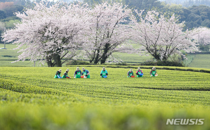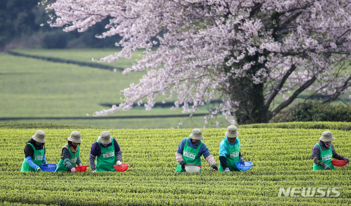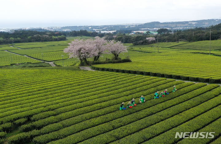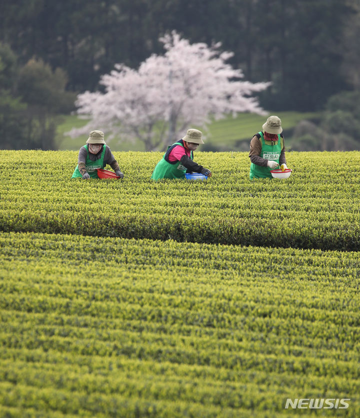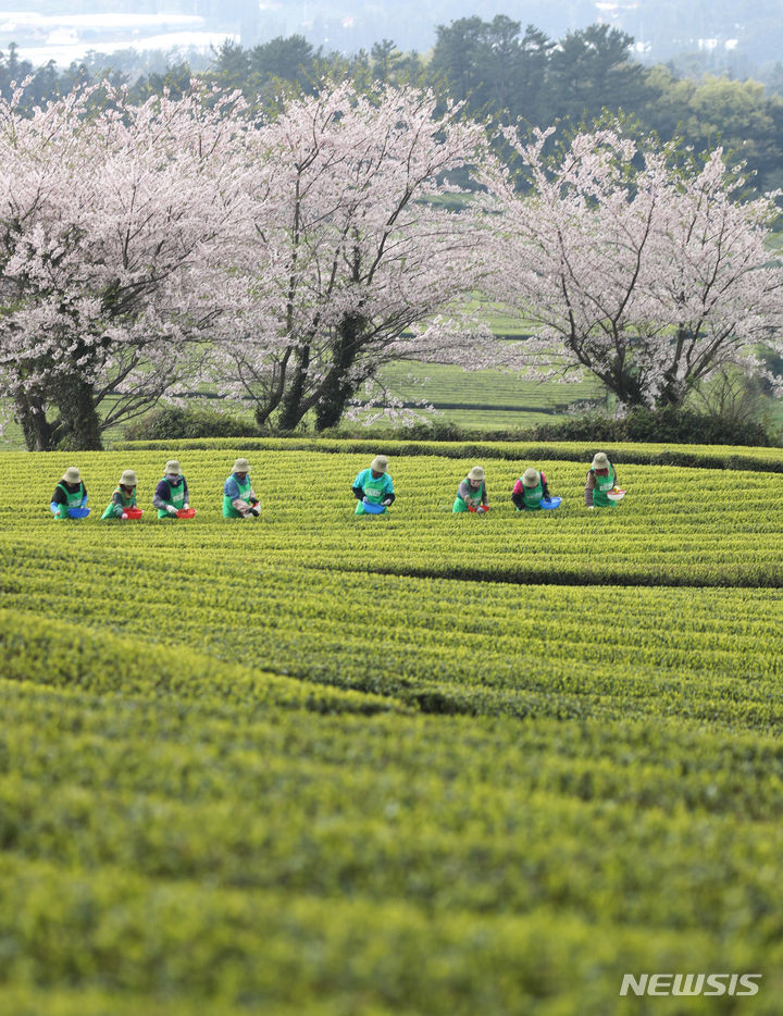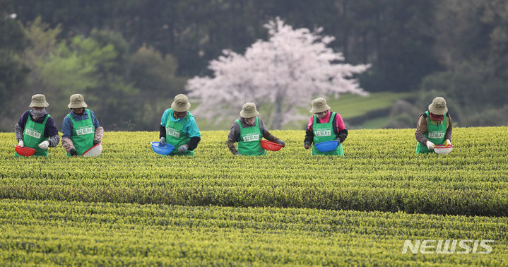 春が深まりつつある5日、済州道西帰浦市道順洞にあるアモーレパシフィックのプレミアム緑茶ブランド「OSULLOC」トルソンイ茶畑で、今年初めての茶摘みが行われた。